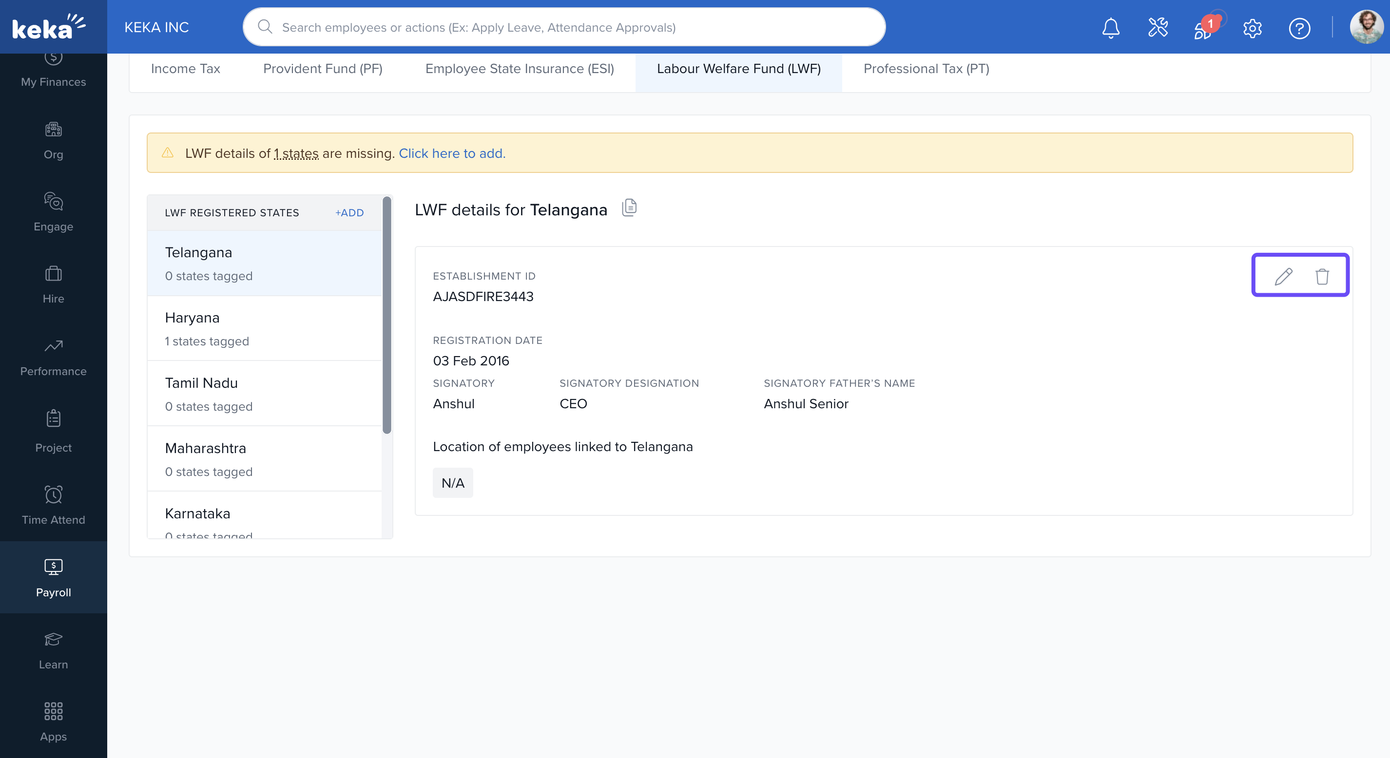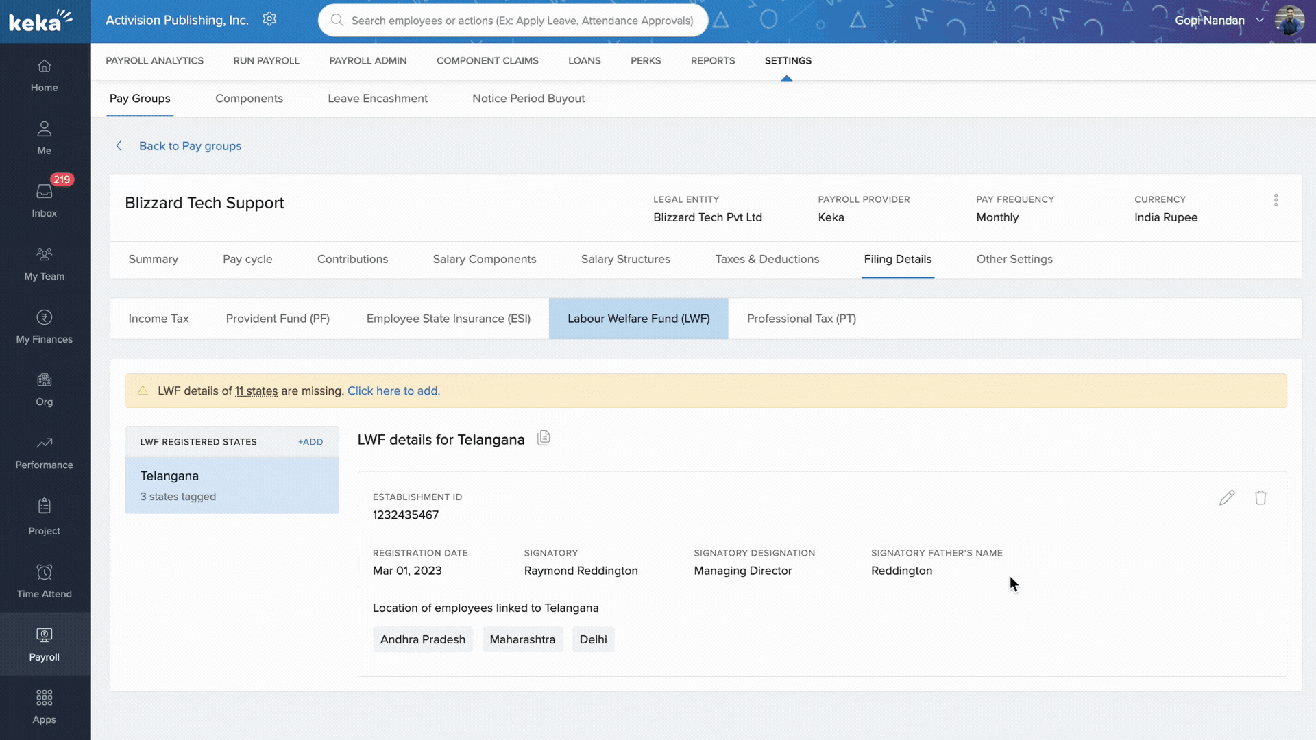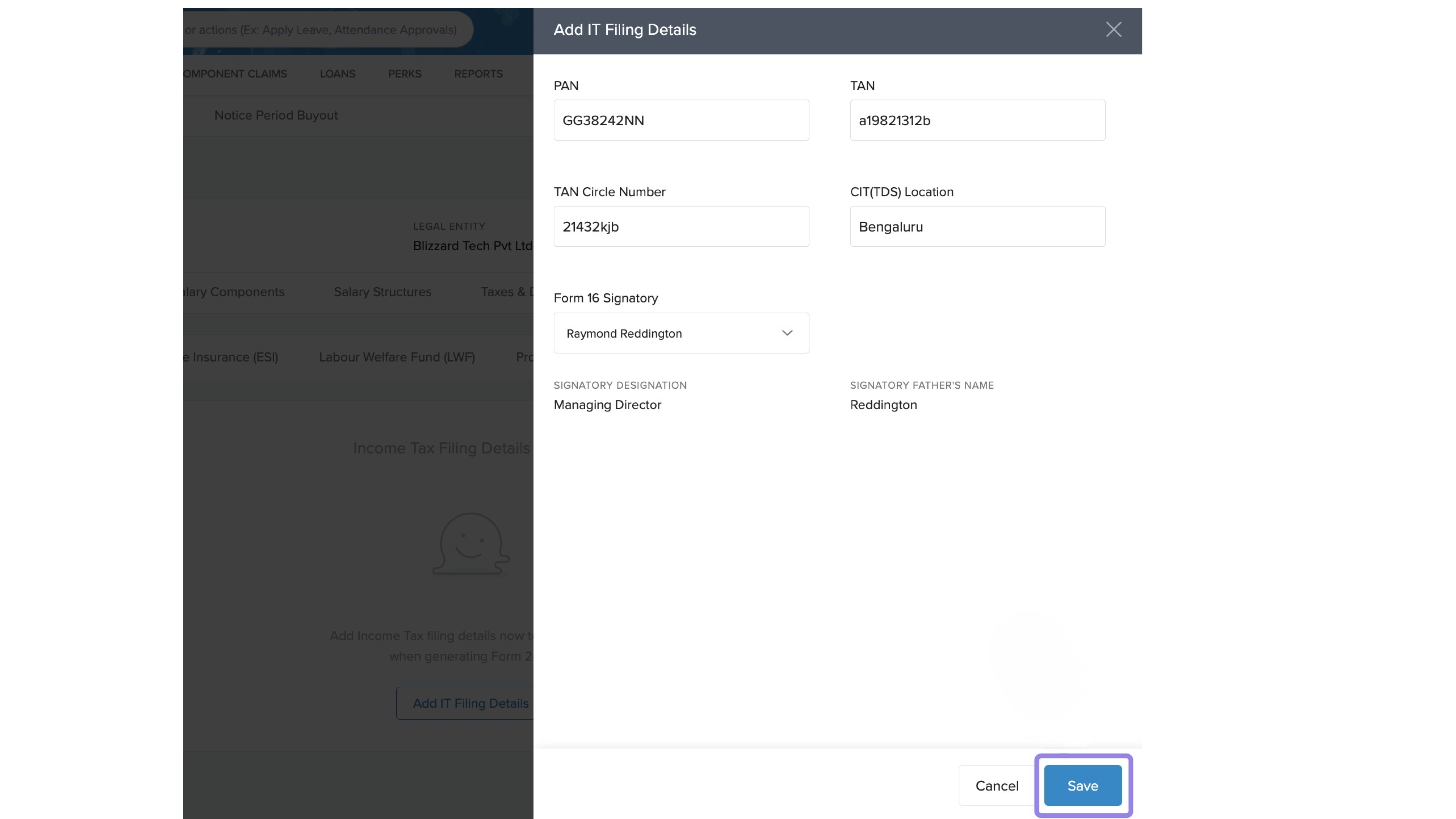 From here, you can manage filing information for IT, PF, ESI, LWF, and PT.