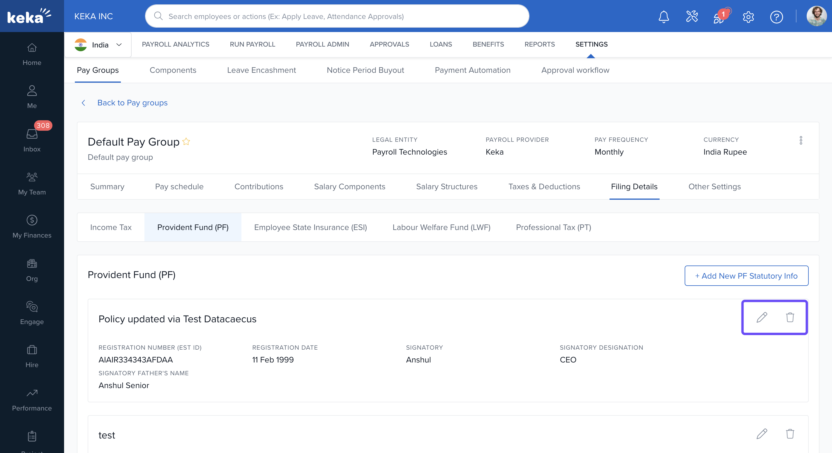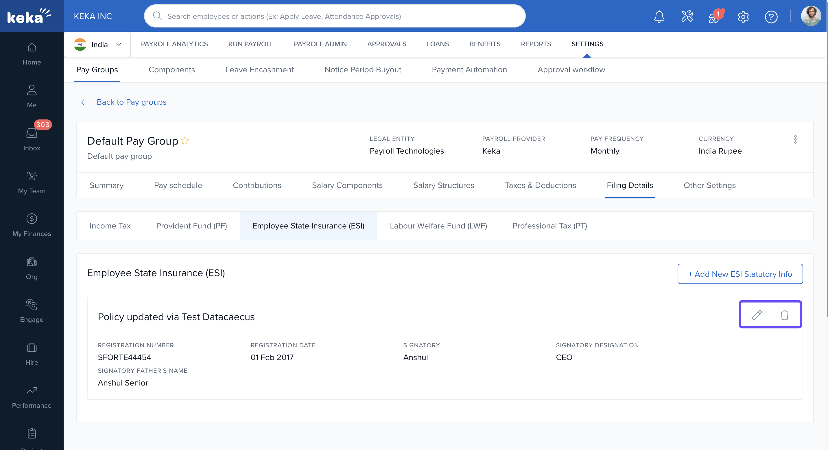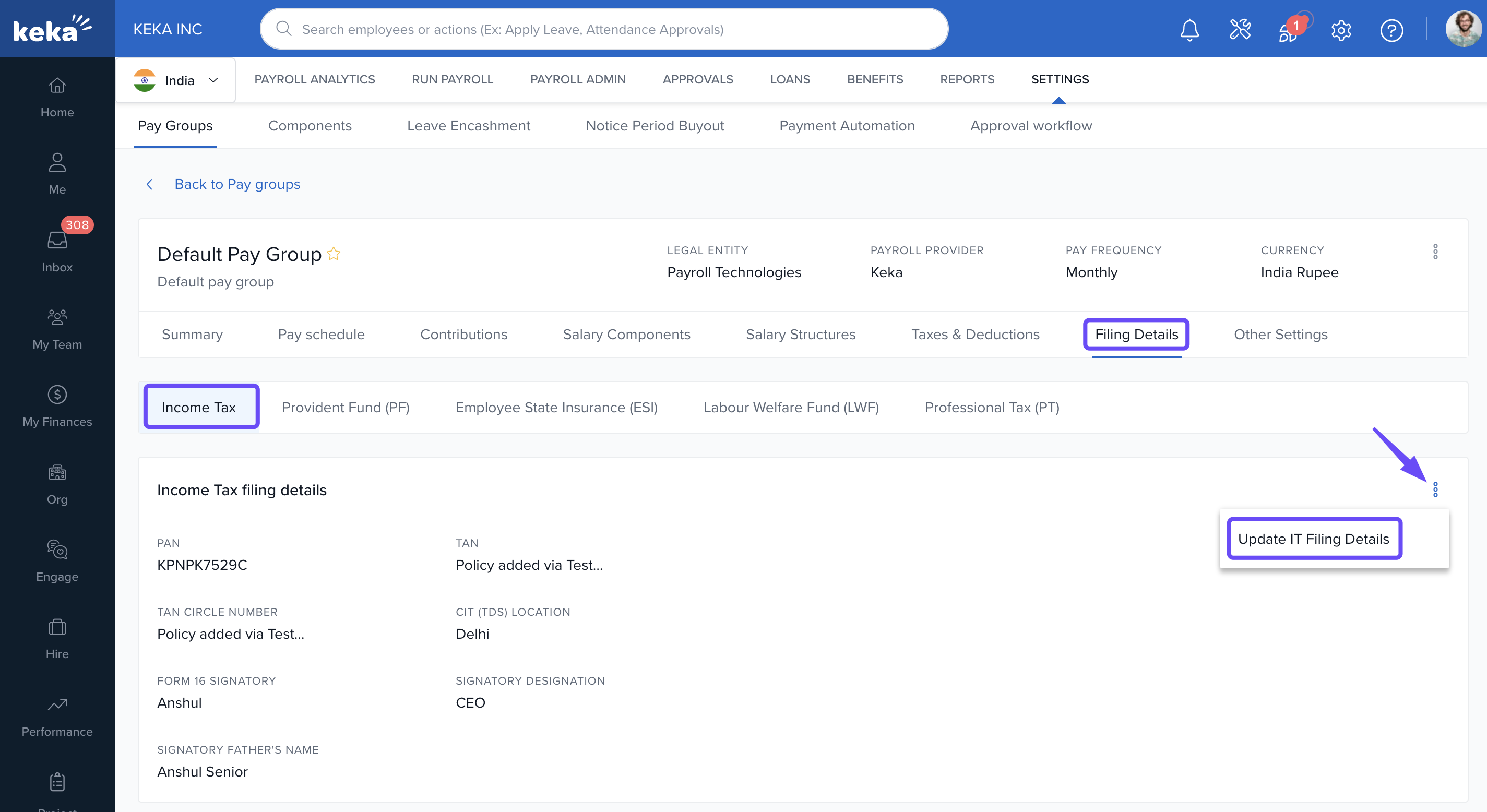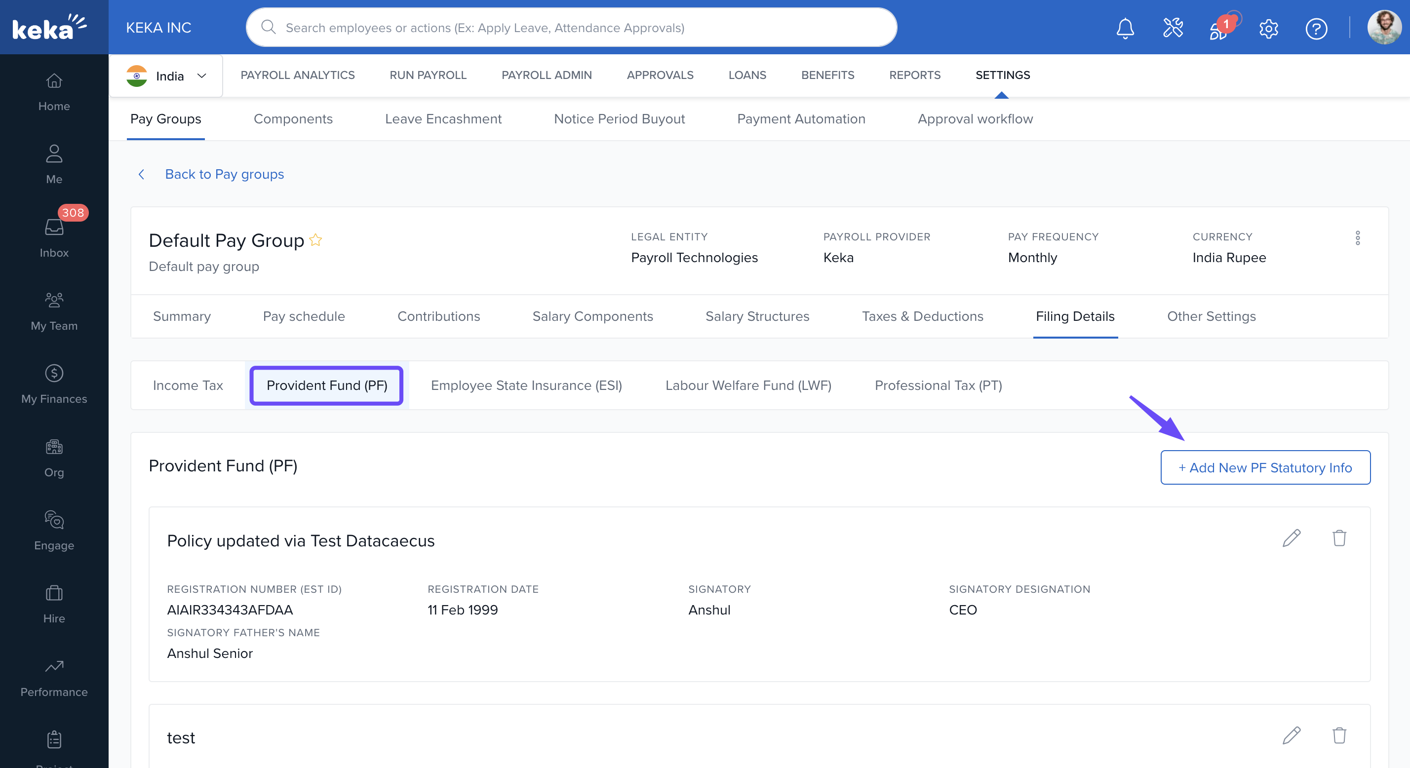In Keka, you can configure the statutory filing details required for each pay group to ensure legal compliance and proper employee benefit processing. These filings cover components like Income Tax (IT), Provident Fund (PF), Employees' State Insurance (ESI), Labour Welfare Fund (LWF), and Professional Tax (PT).
