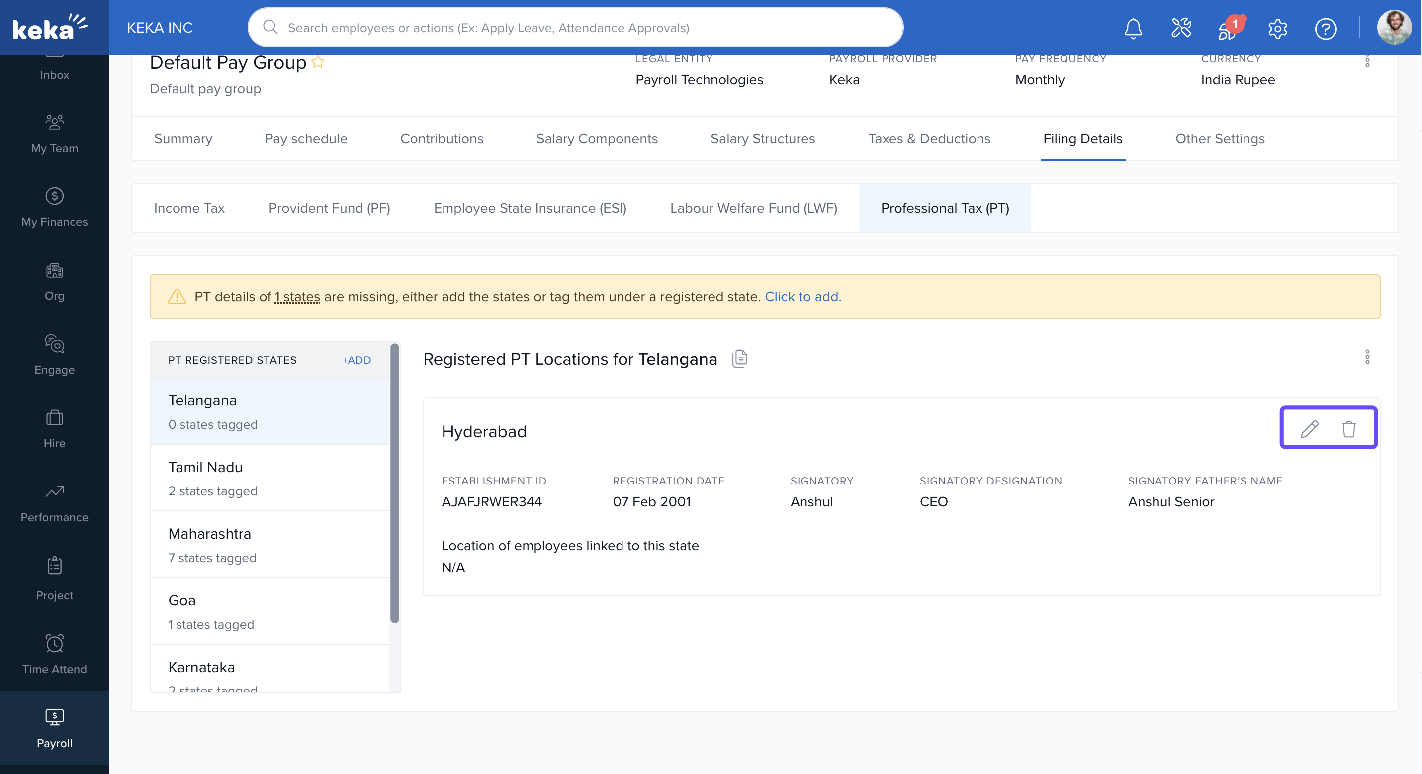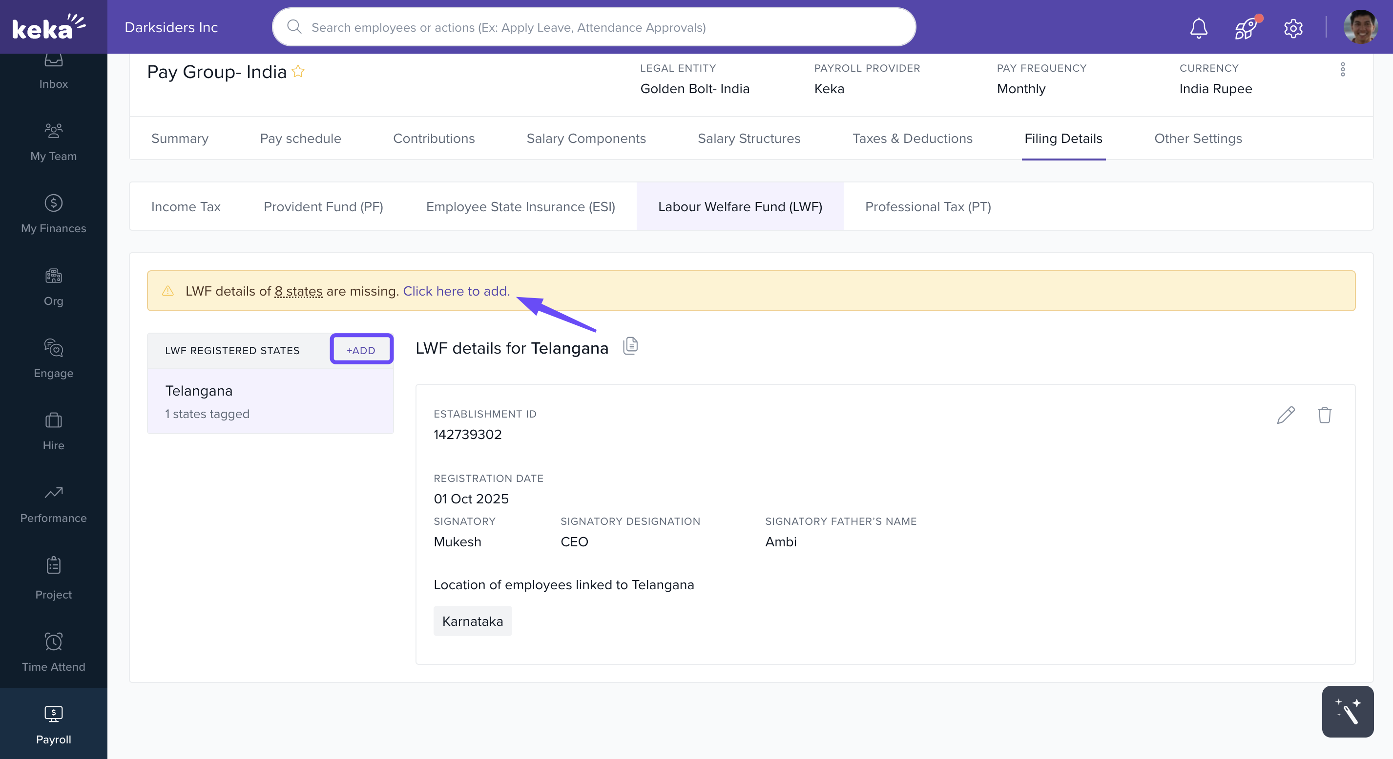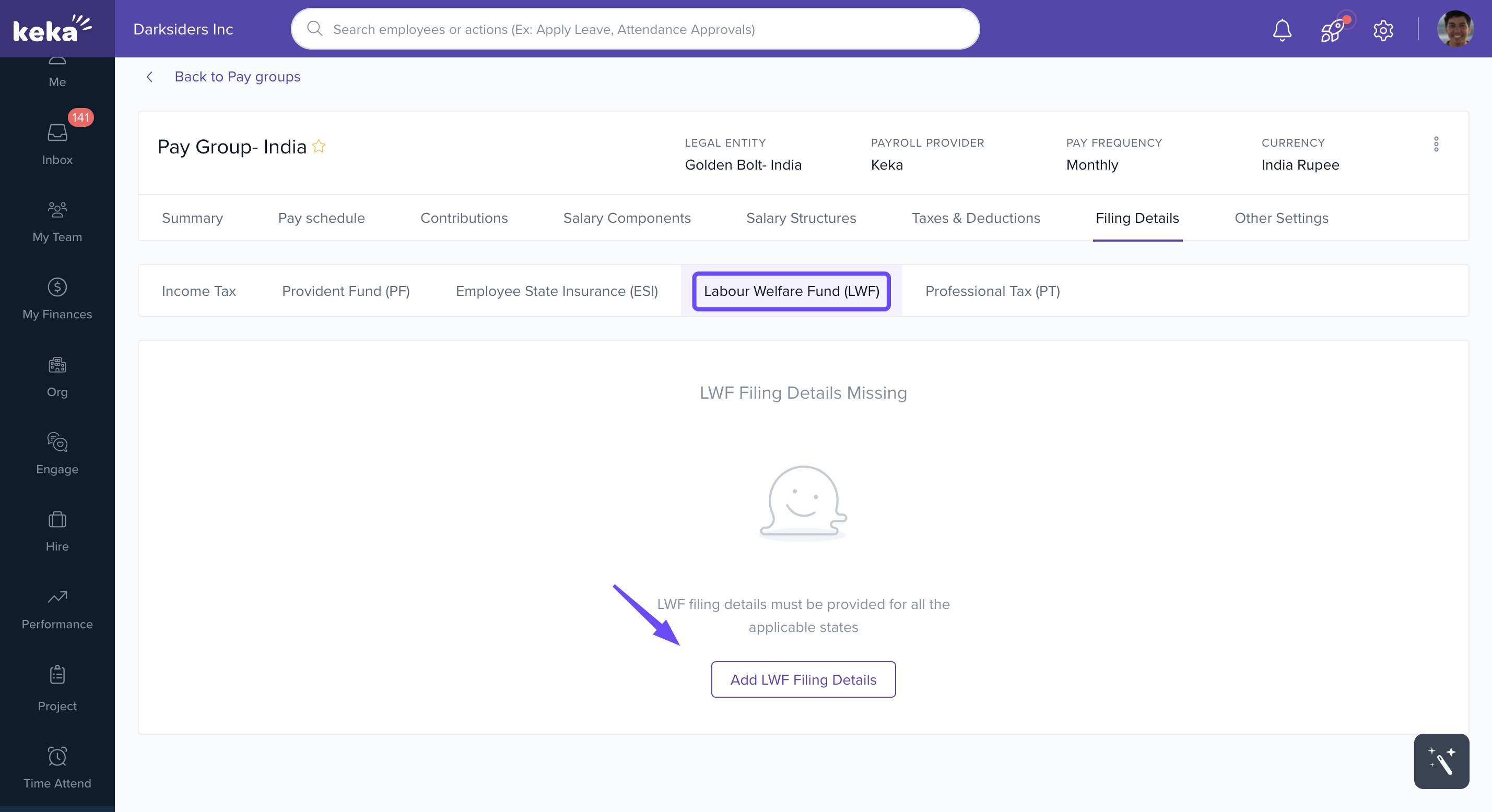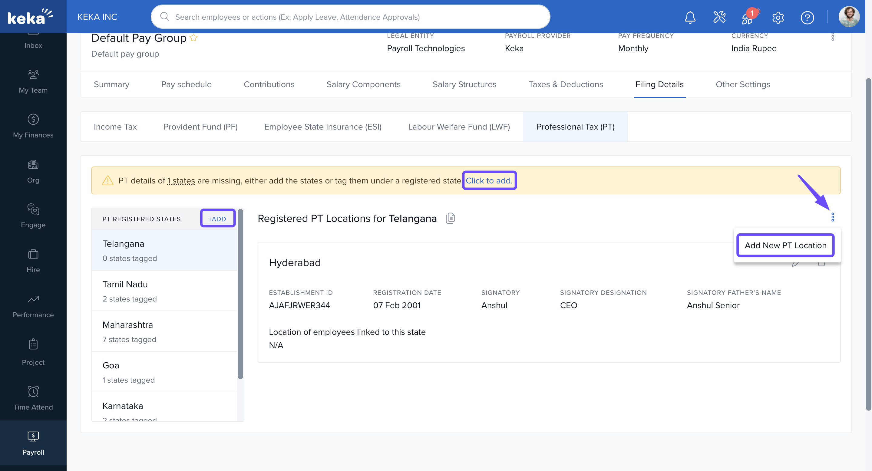 In Keka, you can configure the statutory filing details required for each pay group to ensure legal compliance and proper employee benefit processing. These filings cover components like Income Tax (IT), Provident Fund (PF), Employees' State Insurance (ESI), Labour Welfare Fund (LWF), and Professional Tax (PT).
