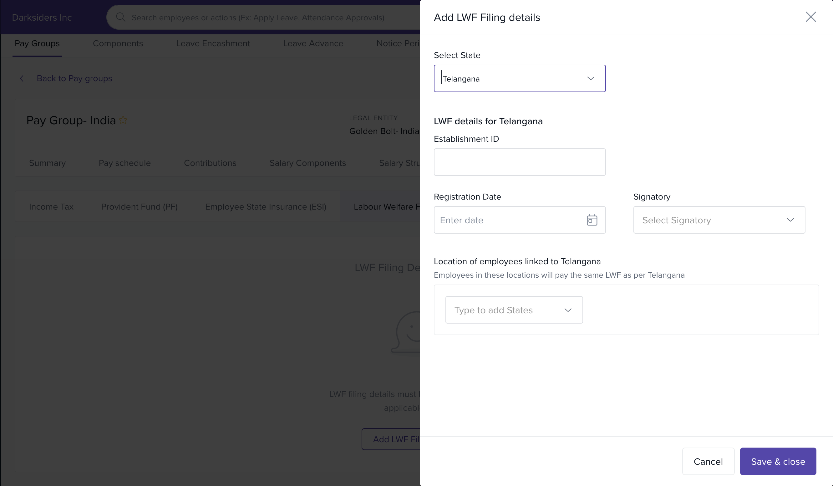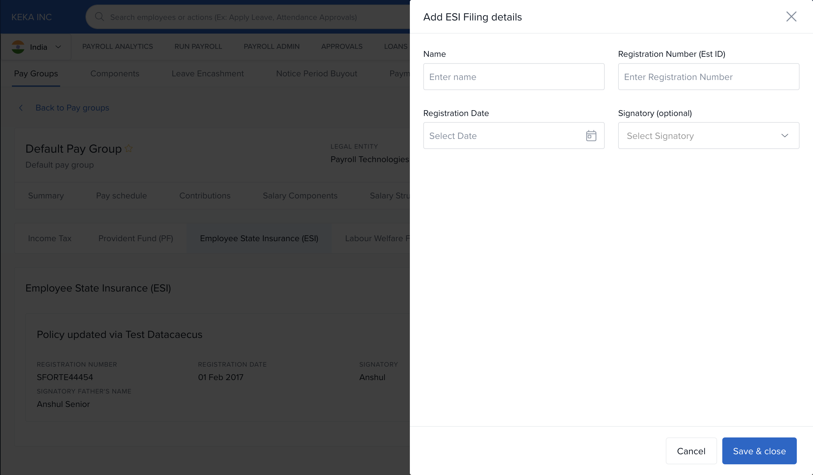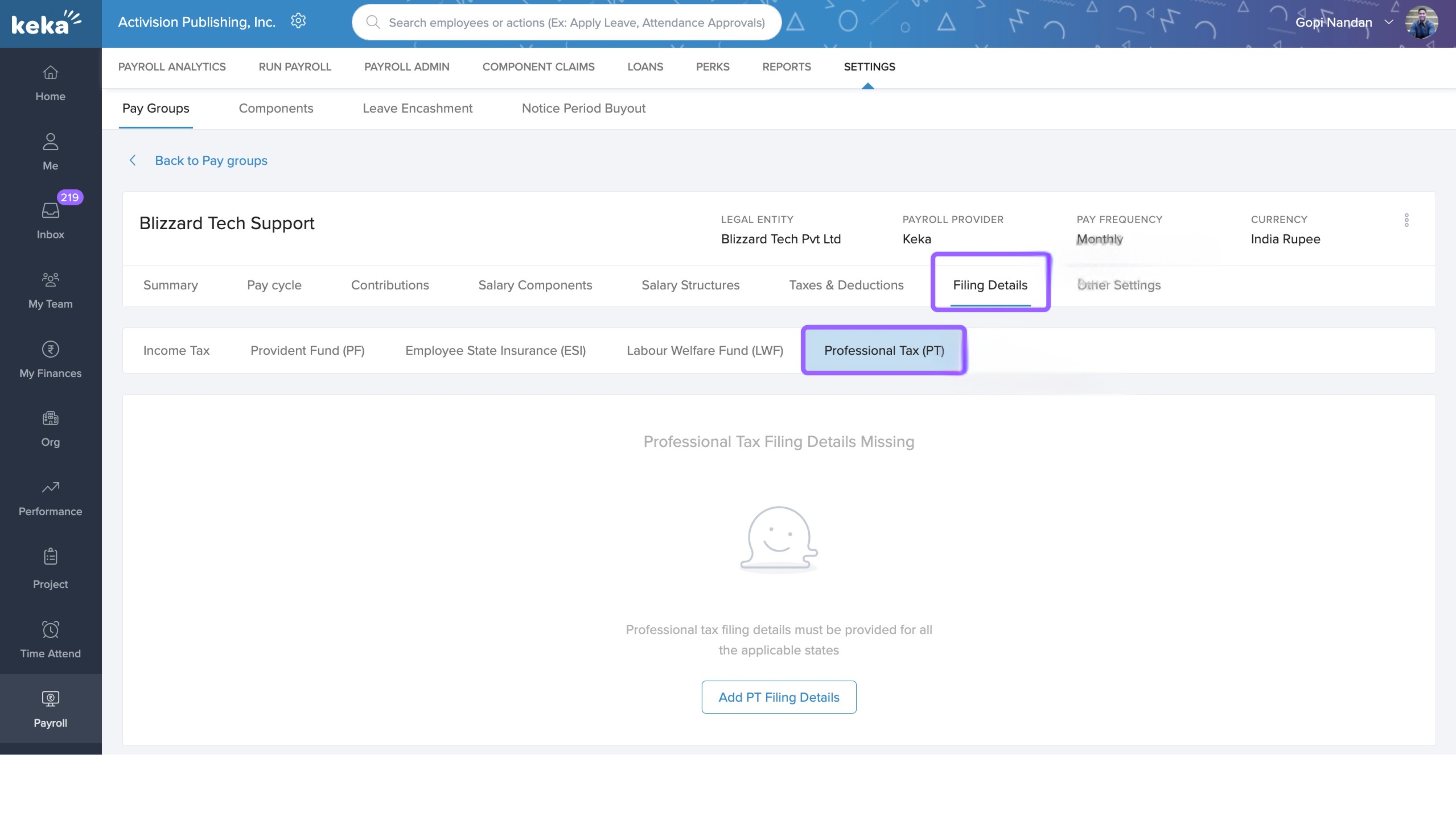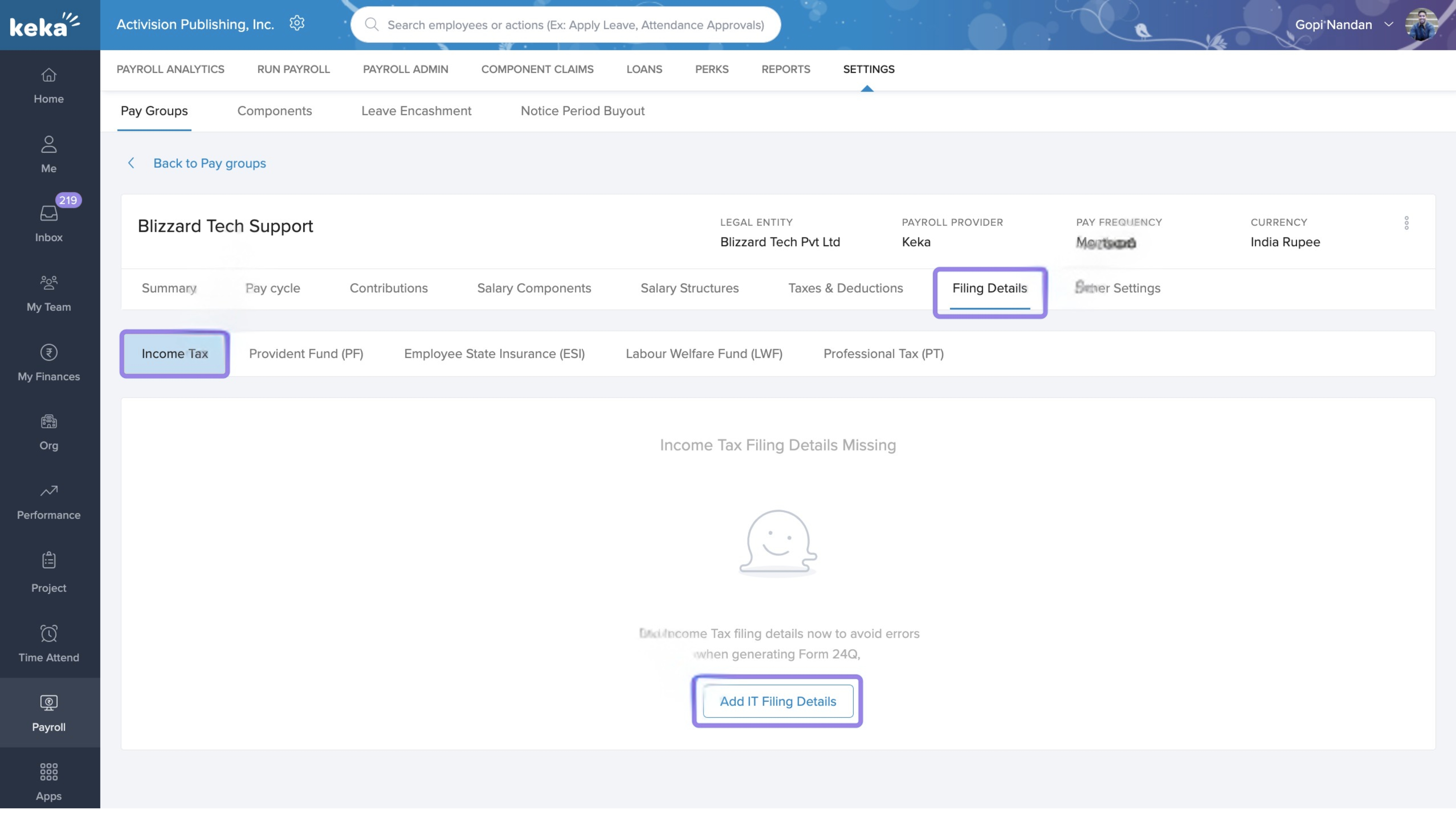 In Keka, you can configure the statutory filing details required for each pay group to ensure legal compliance and proper employee benefit processing. These filings cover components like Income Tax (IT), Provident Fund (PF), Employees' State Insurance (ESI), Labour Welfare Fund (LWF), and Professional Tax (PT).