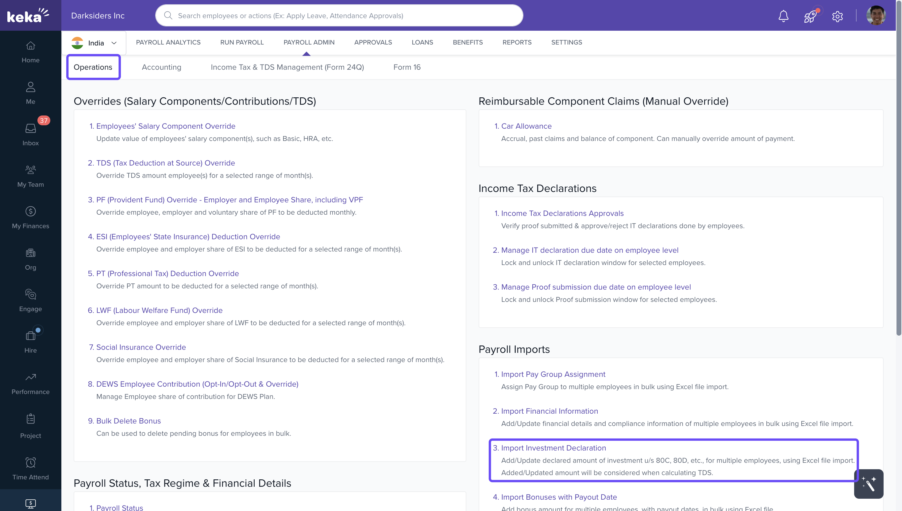 Investment declarations are key to calculating the monthly TDS (Tax Deducted at Source) for employees. Keeping these records updated in Keka ensures accurate tax deductions every month.