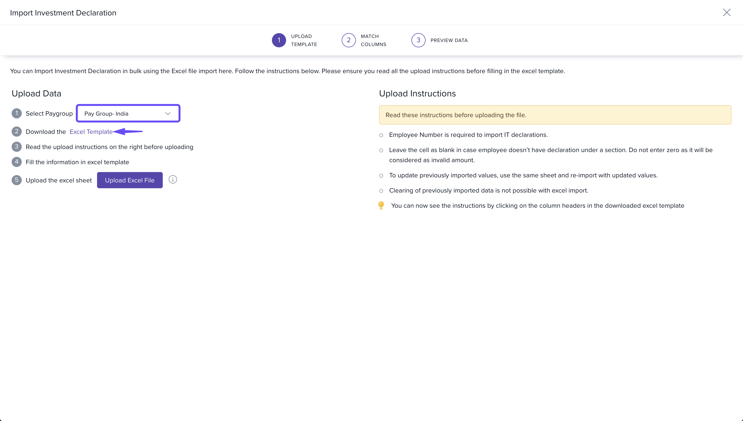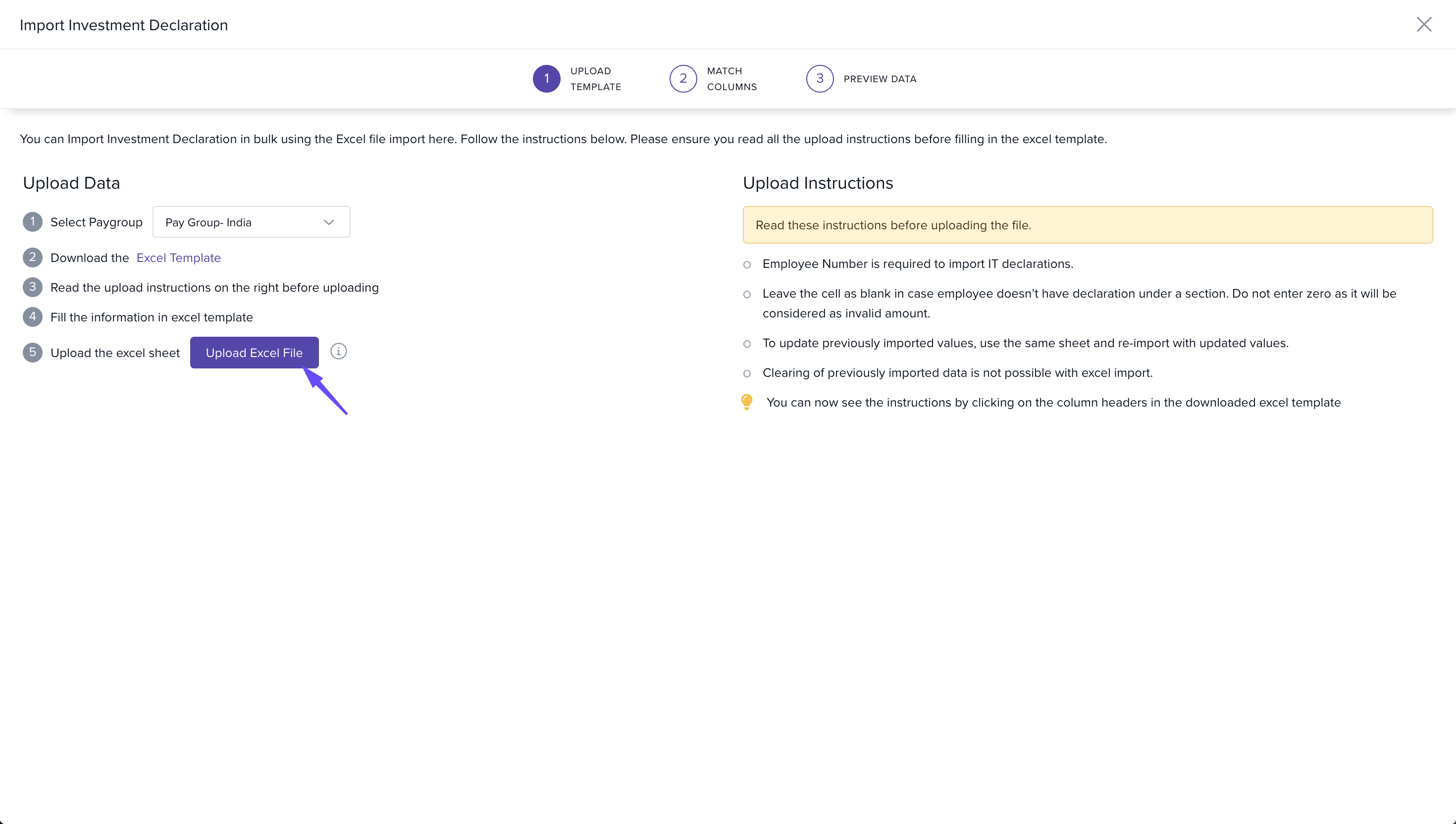 - In the Match Columns section, ensure that Excel columns are correctly mapped to fields in Keka.