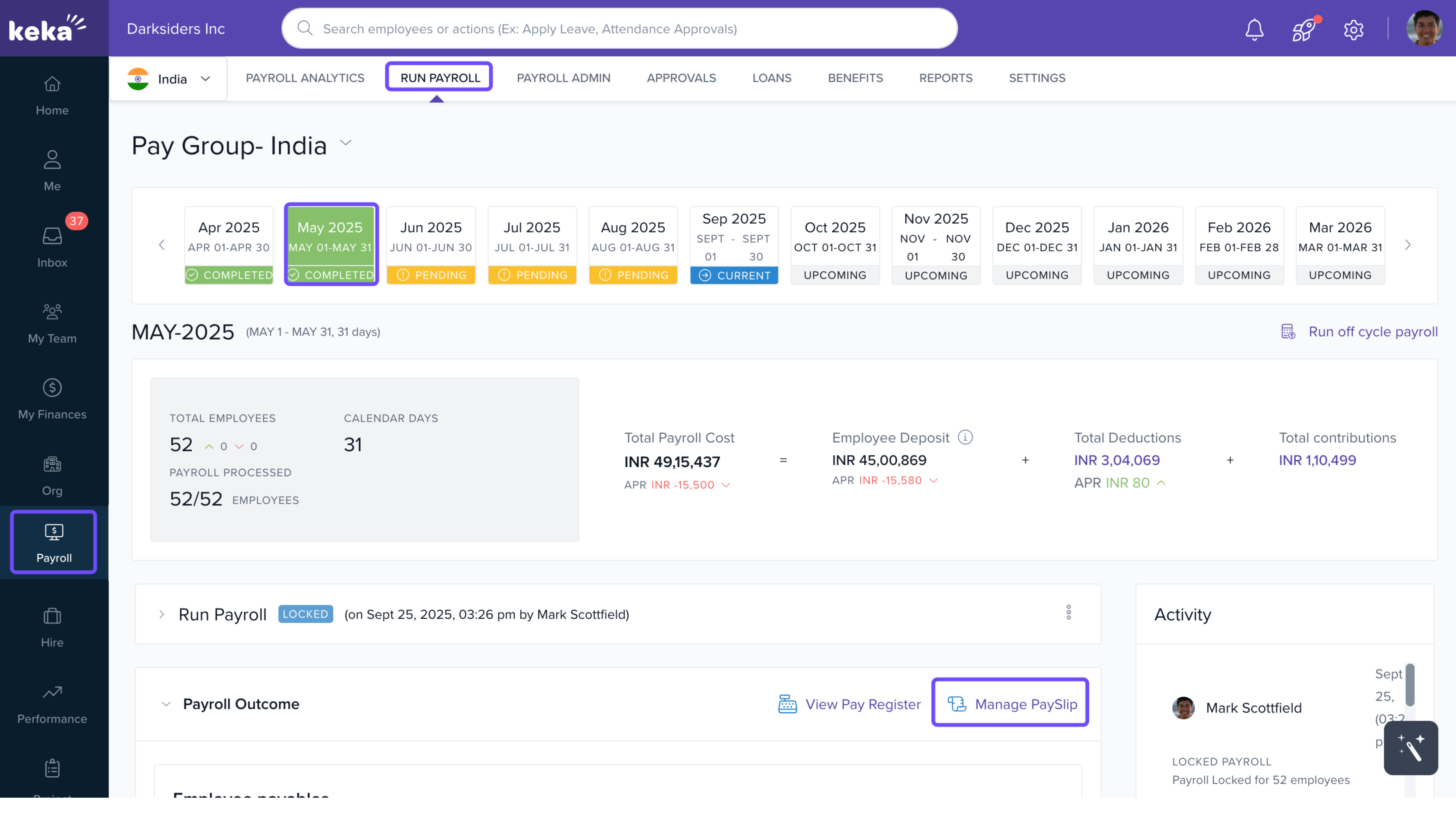 Note: The Manage Payslip link appears only for finalized payroll months.