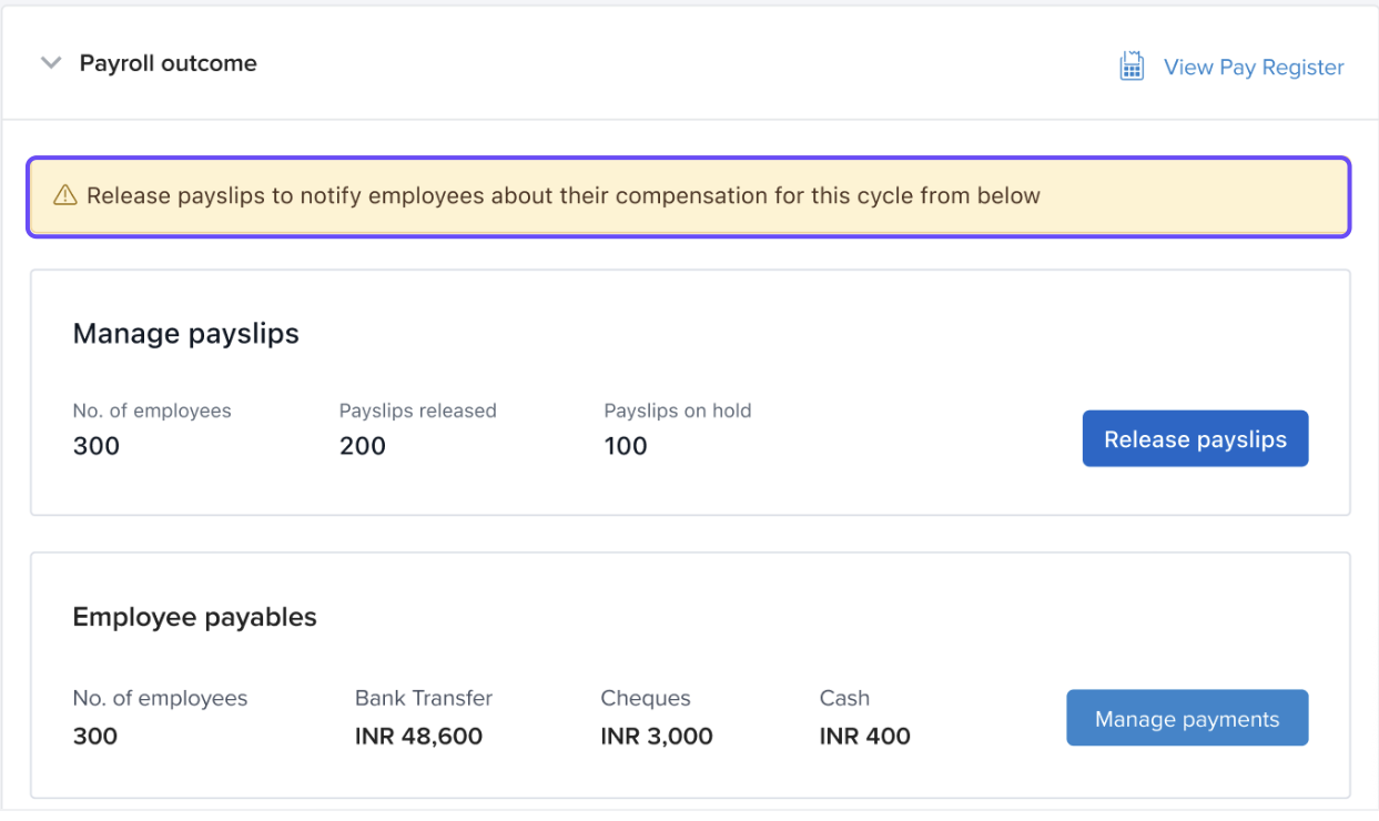 Once payroll is locked, payroll admins will see a persistent reminder on the payroll outcome screen prompting them to release payslips to employees