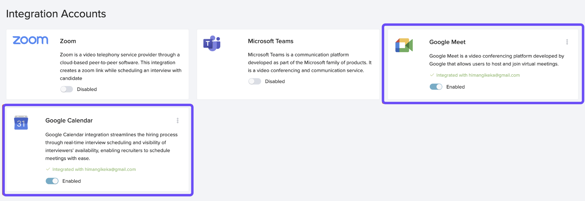 Tip: Users can disable or remove the integration from their profile anytime. Once disabled, they won’t be able to use Google Meet for online interviews.