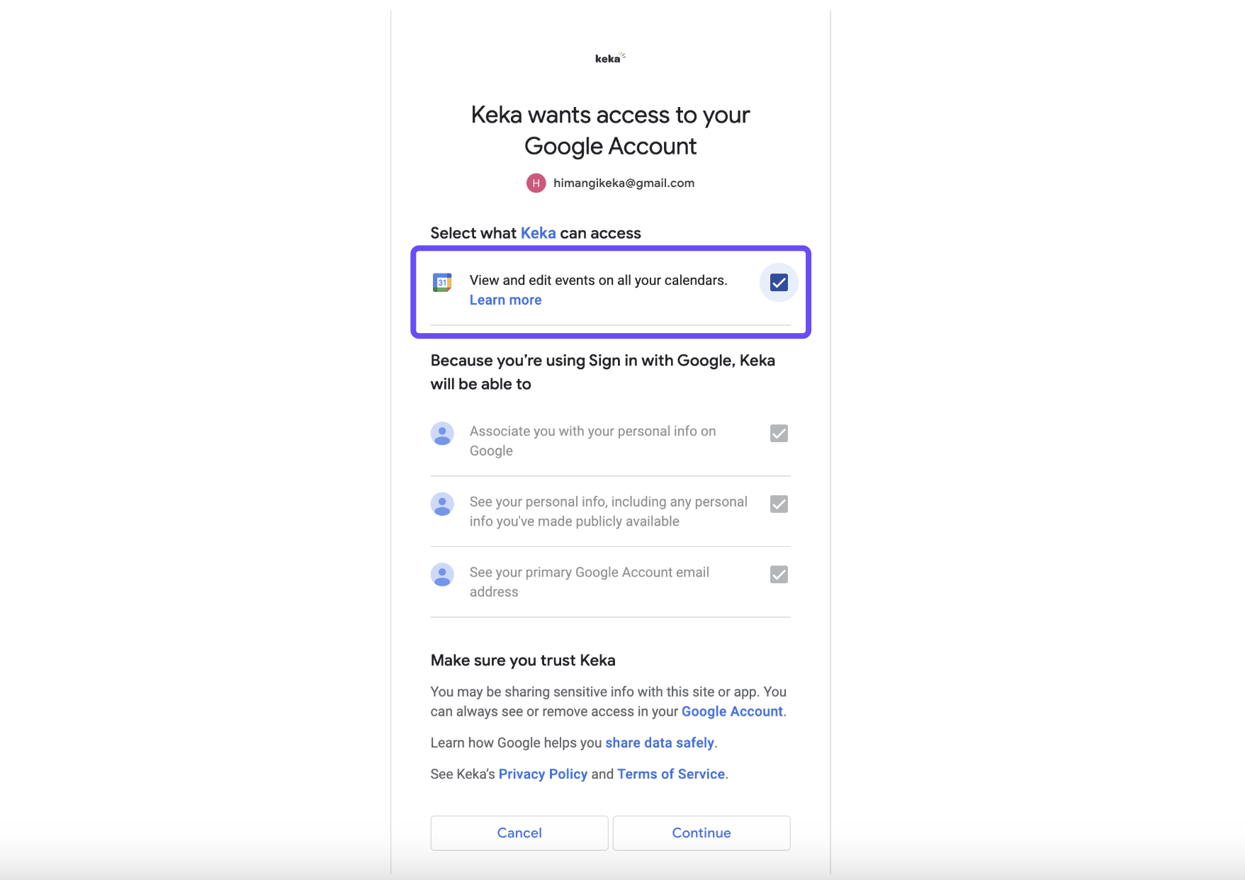 Important: Make sure to allow all required permissions during setup. Without them, Keka won't be able to schedule interviews or block your calendar.