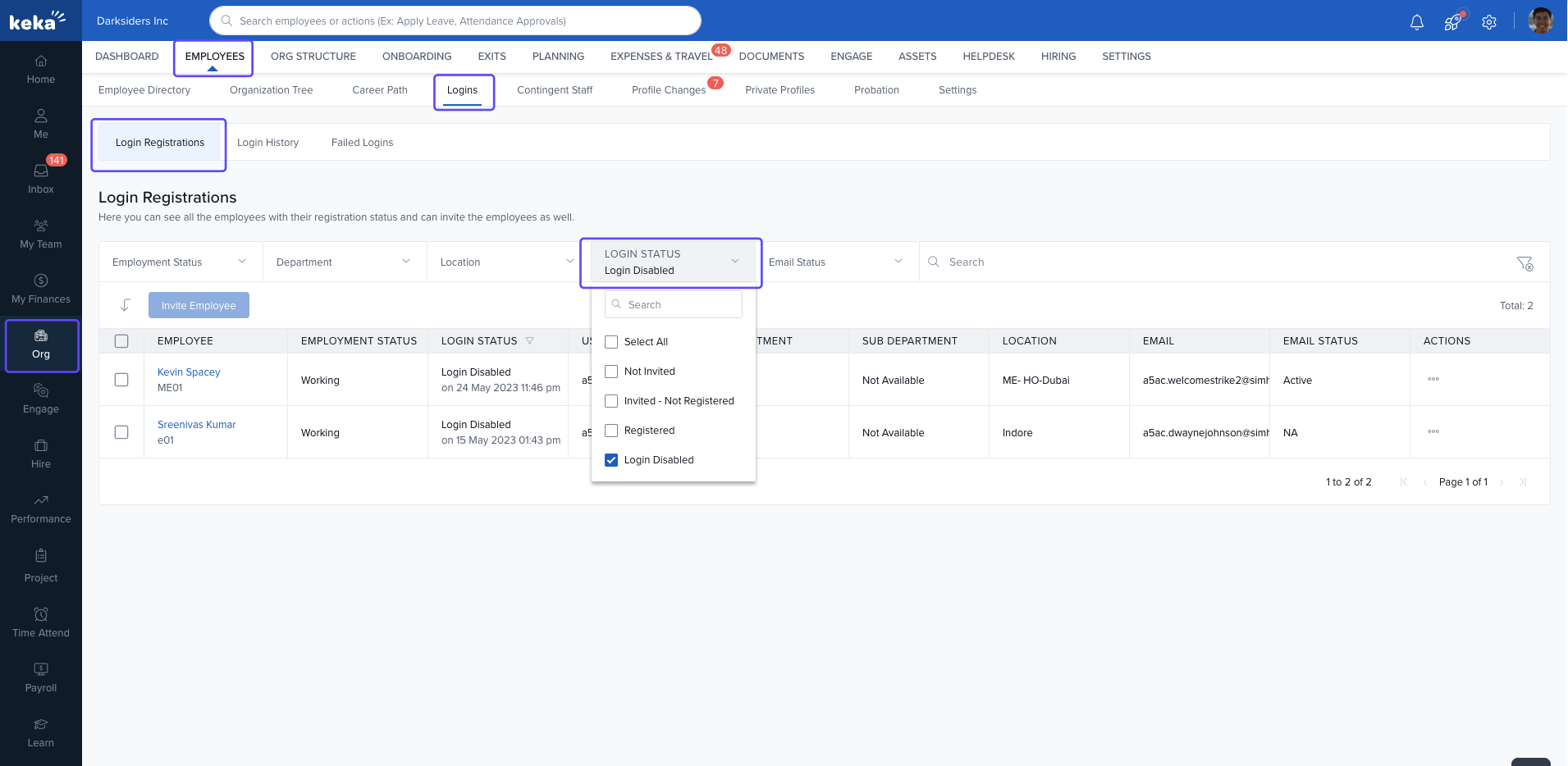 Keka simplifies this by allowing admins to filter and view all employees with disabled logins in one place.