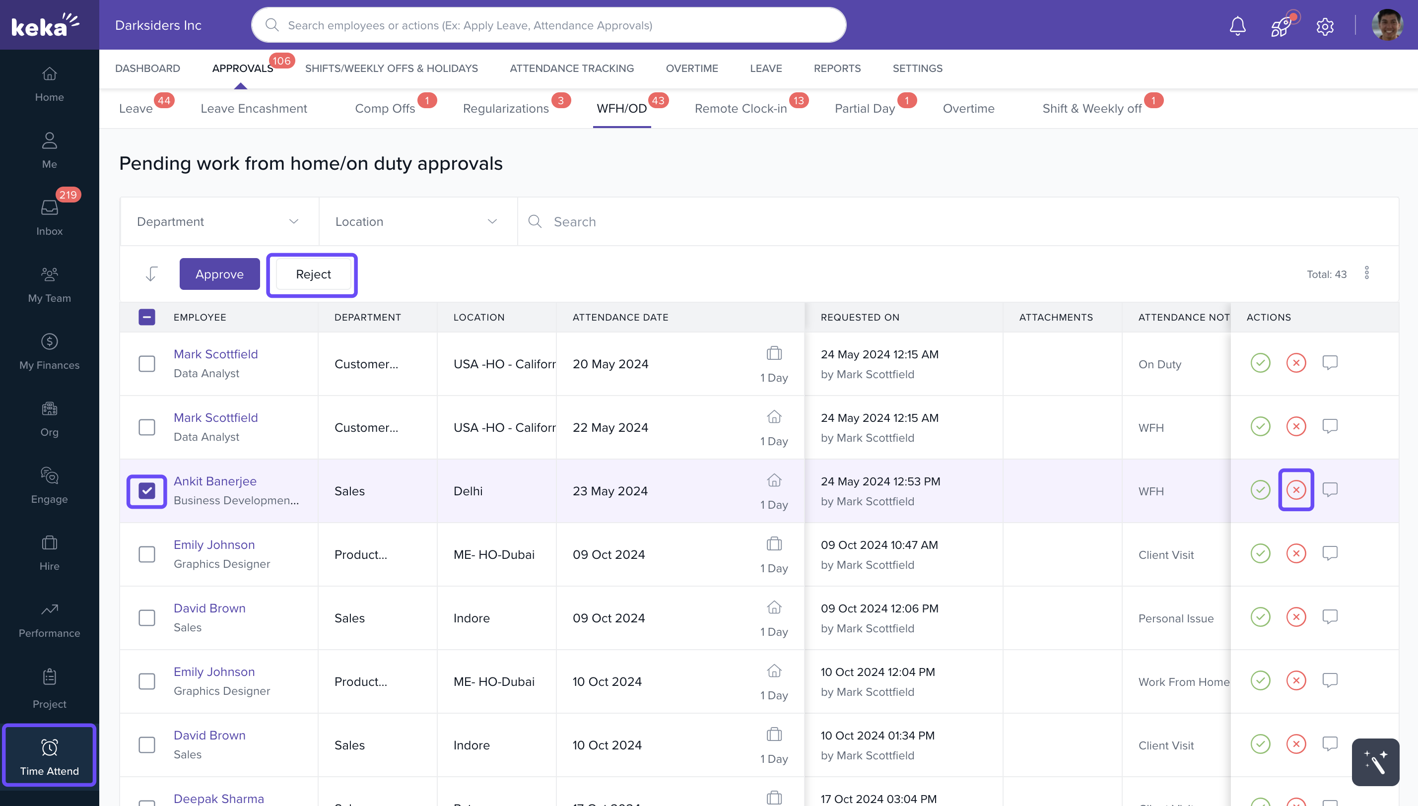 - To reject multiple requests, select the checkbox beside the employees' names and click Reject. This will reject the WFH/OD requests for all selected employees at once.