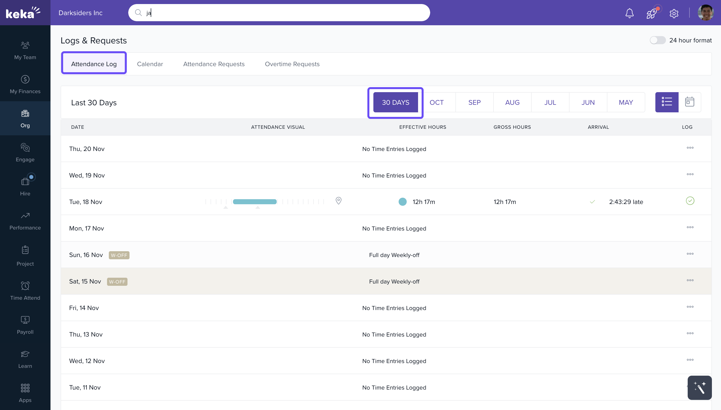 - View the attendance logs for the selected period.