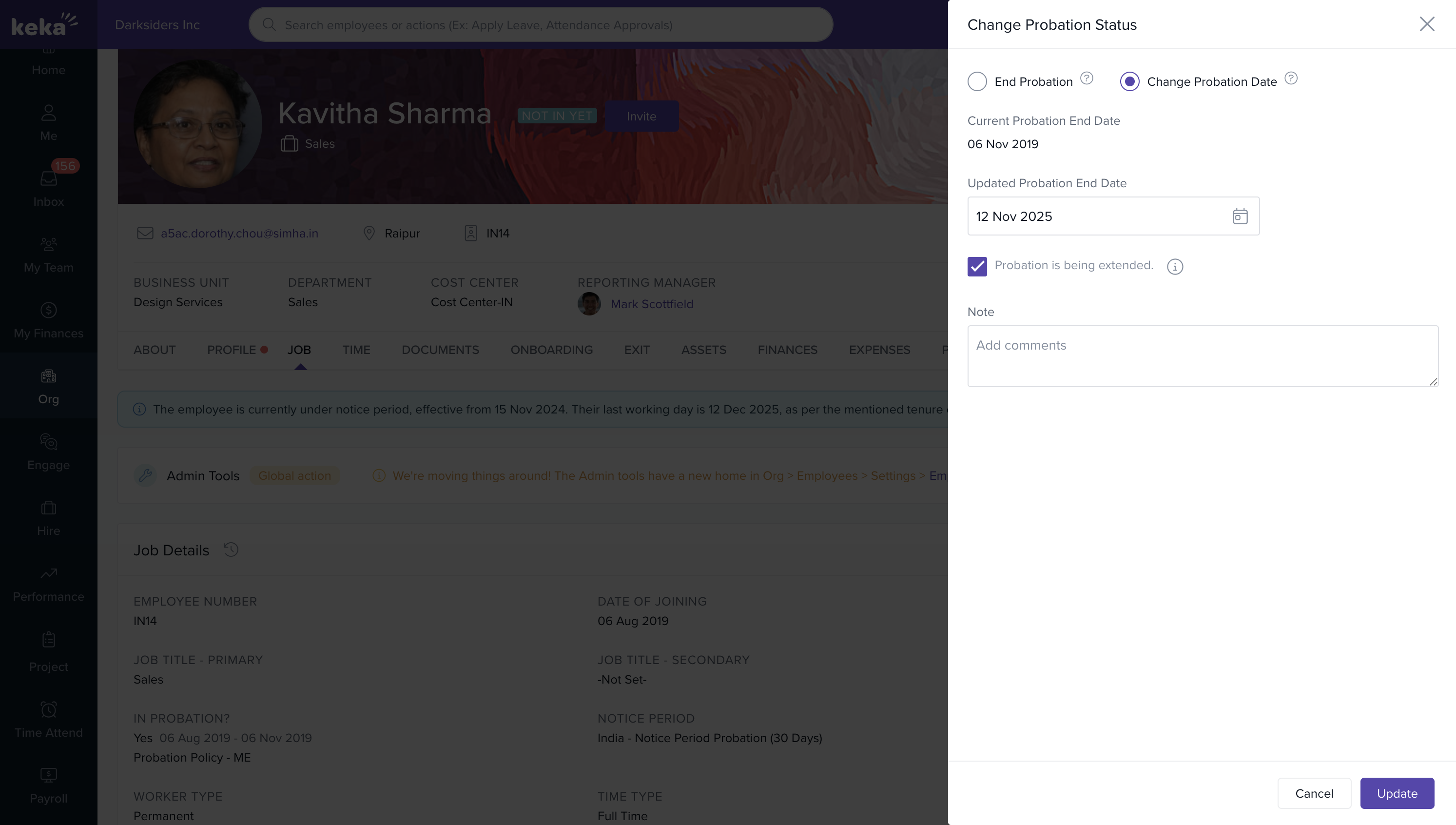 To update the probation end date, click the pen icon next to the Date, select the new date, and choose the probation status from the dropdown. Click Update to save.