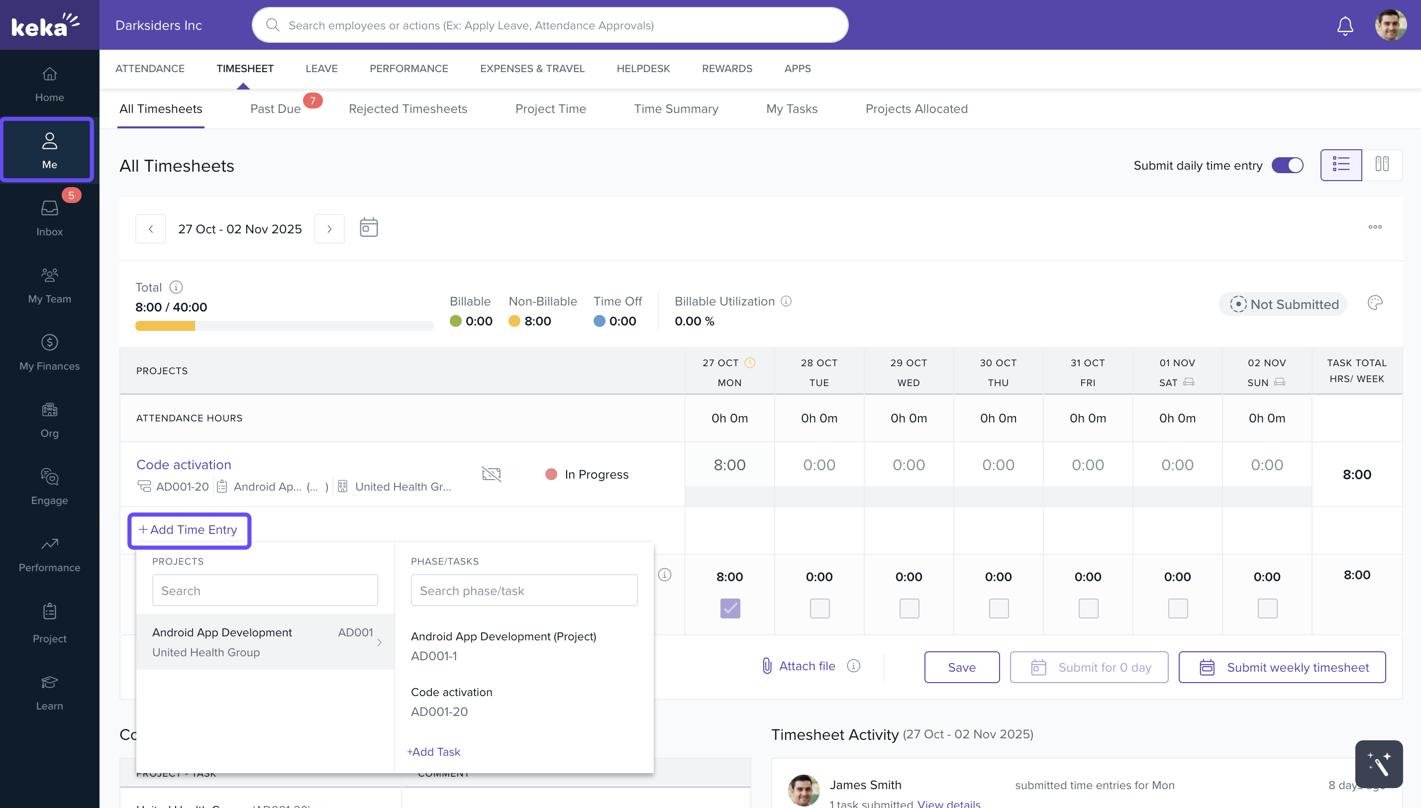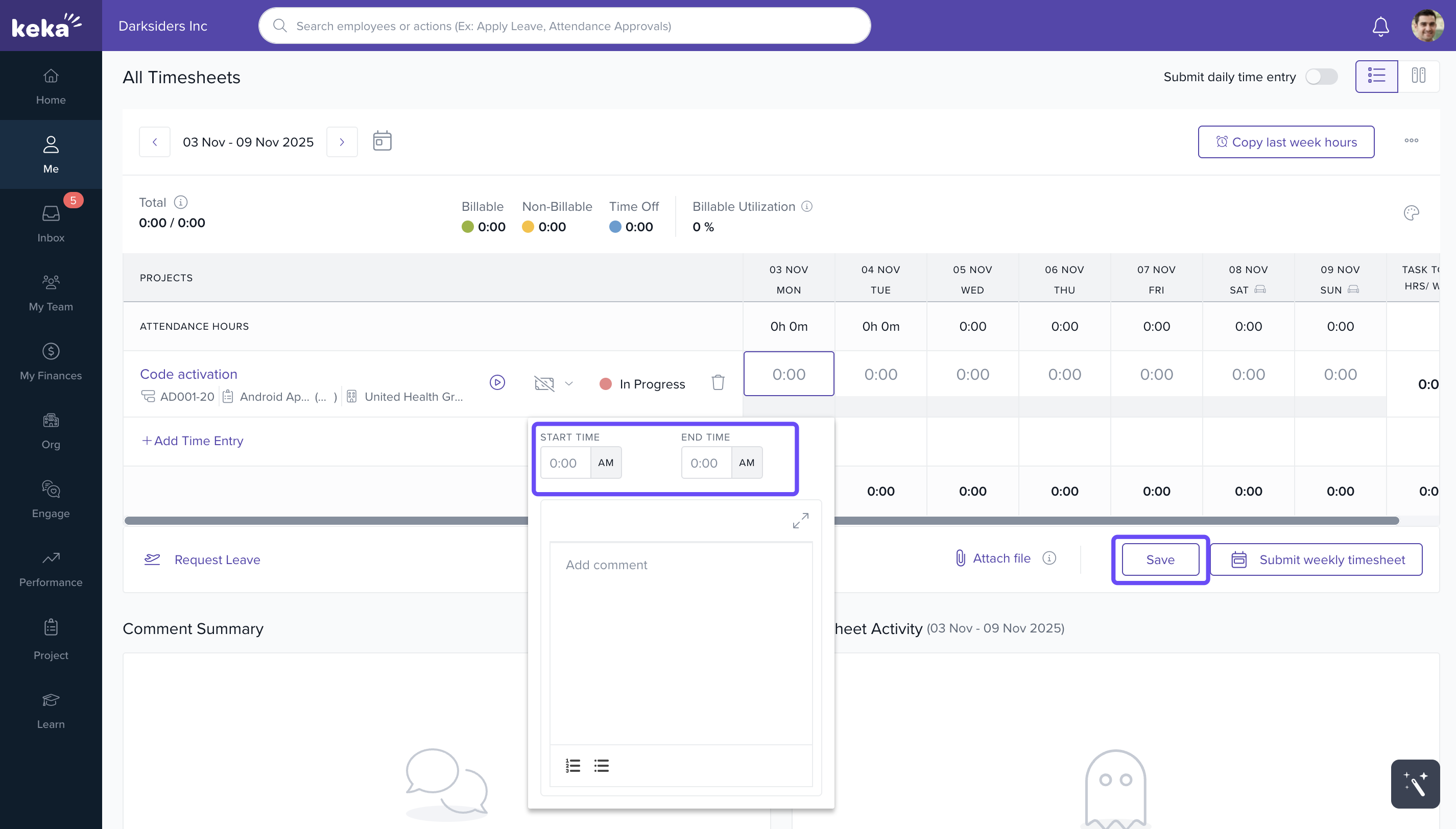 Steps to Log Hours in Your TimesheetGo to the Me module and select Timesheet.Under the All Timesheets tab, click on Add Time Entry.Select the task you want to log your hours for.Enter the Start Time and End Time.Click Save to log the hours. Related articles How to create Proforma and Prepayment invoices? Managing Timesheets in Keka: A Comprehensive Guide PSA: Custom report builder & reporting enhancements Overview of Expenses & Travel Do's and Don'ts during Year End Processing Comments 0 comments Please sign in to leave a comment.