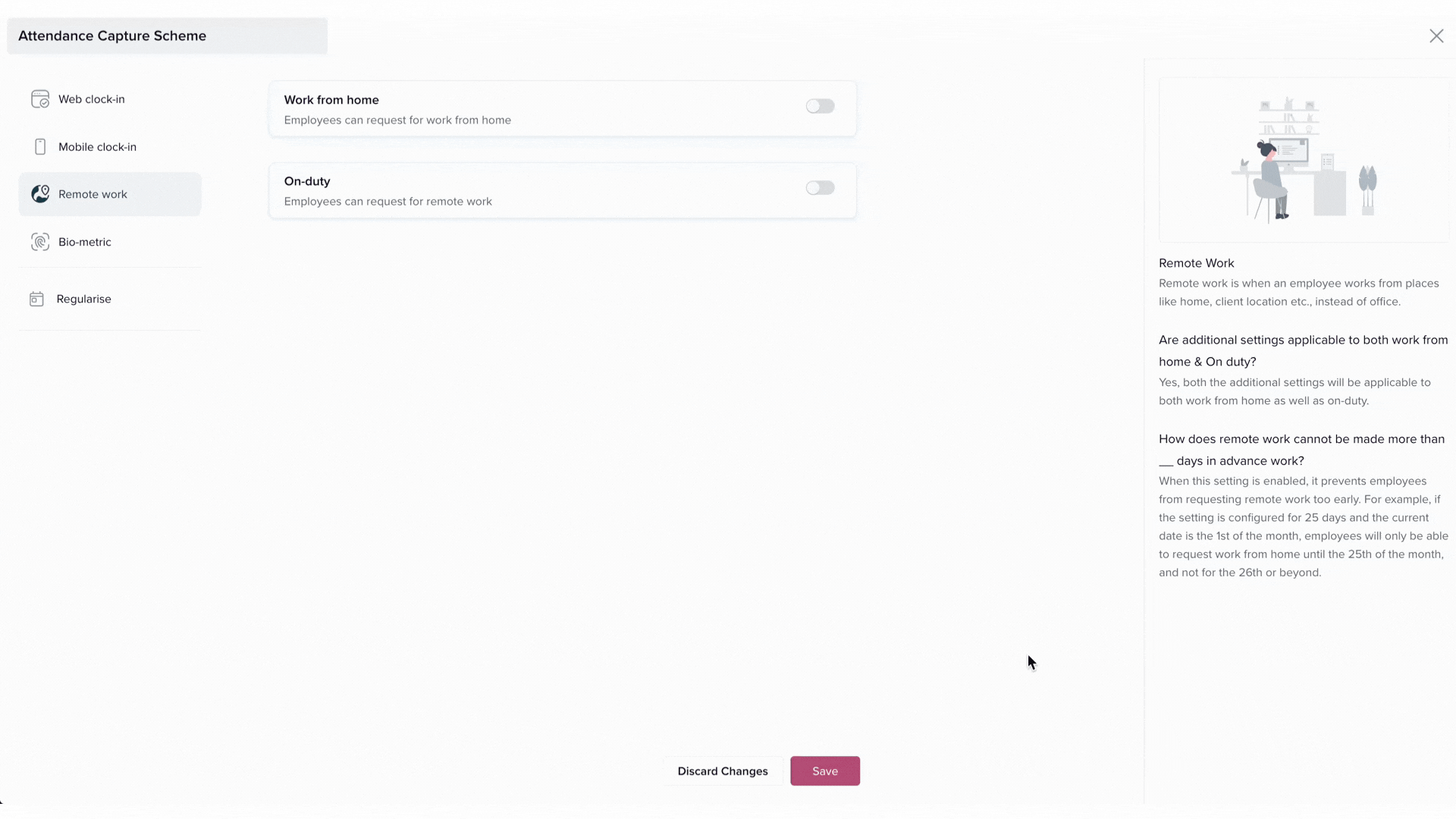 Important: Disabling WFH or On Duty applies only to the selected capture scheme. Repeat the steps for other schemes if needed.