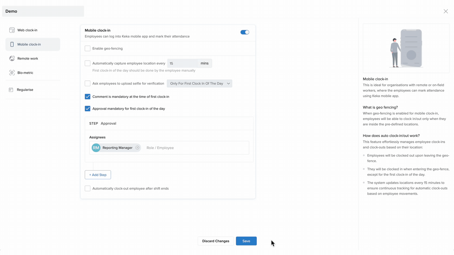 - In the setup window, go to the Mobile clock-in section and check the box to enable geo-fencing.