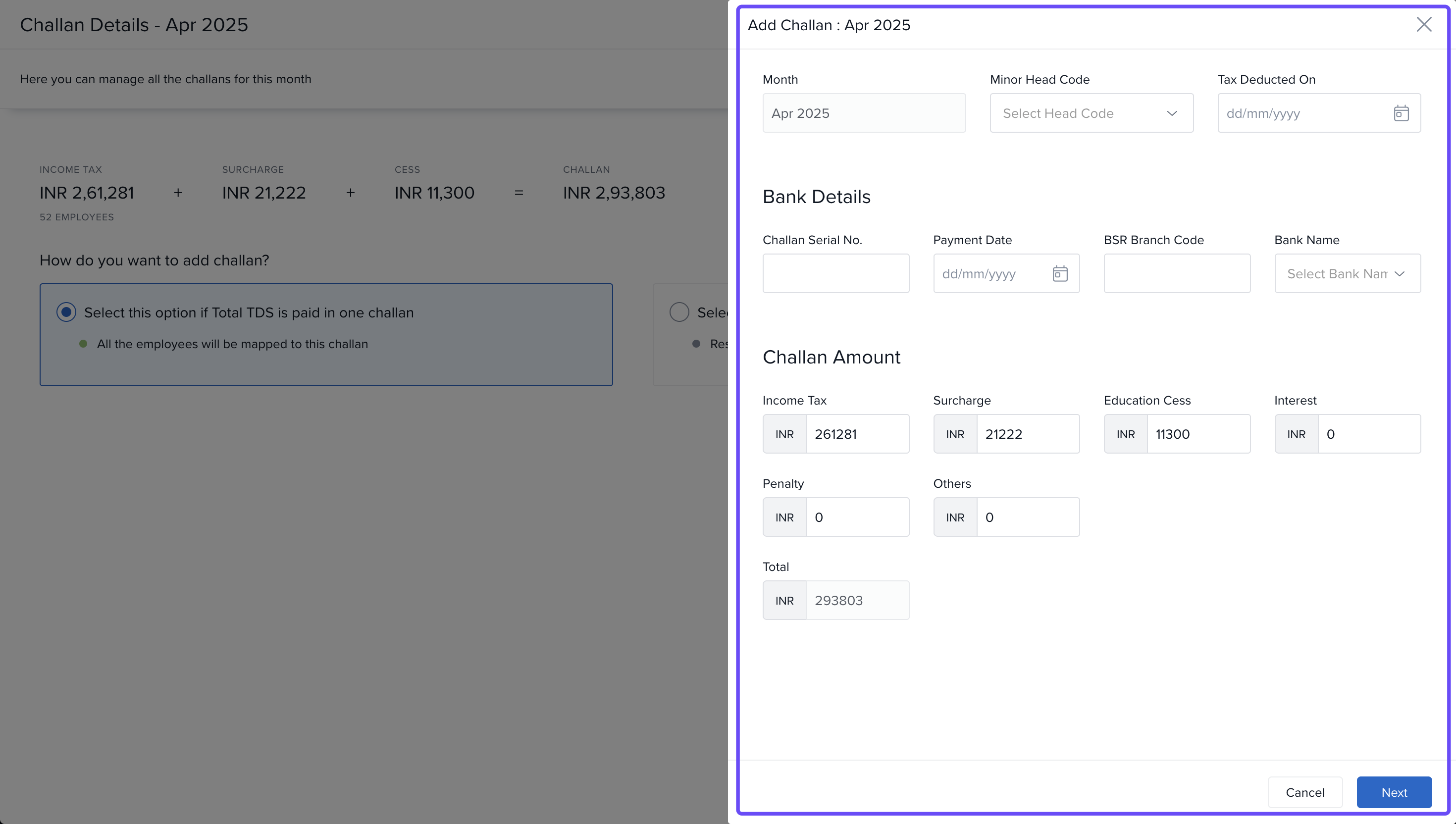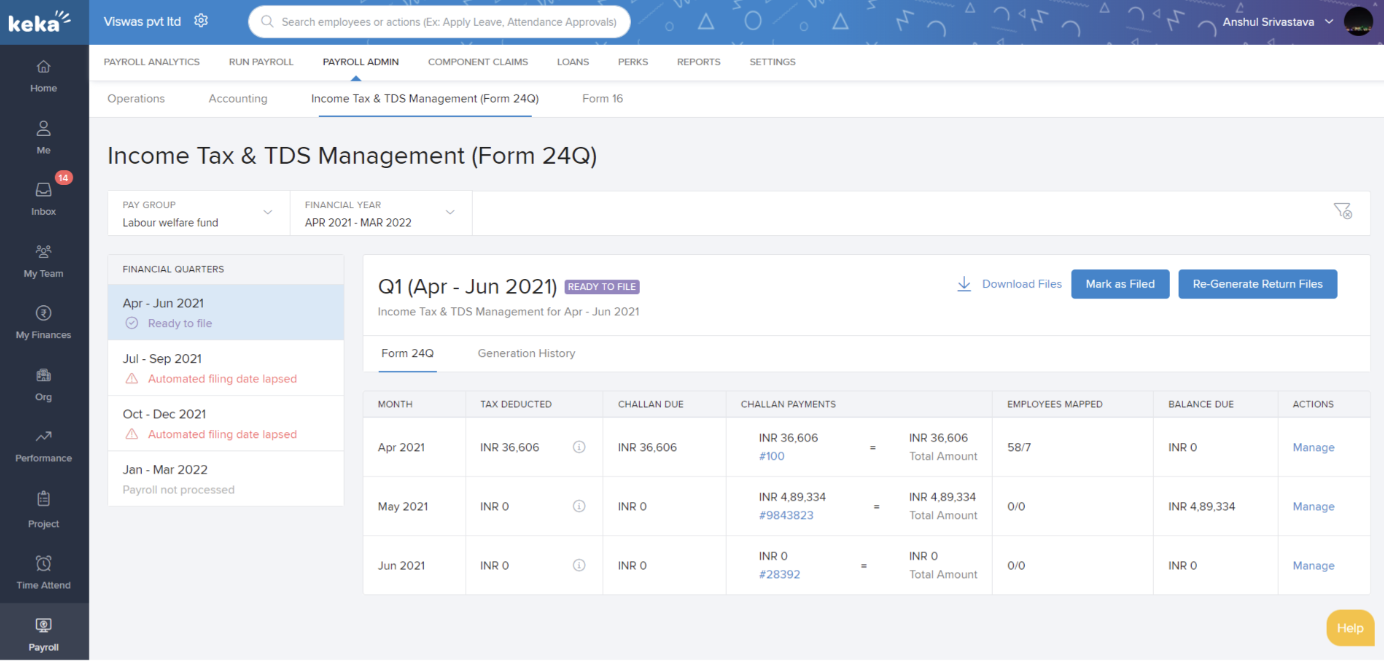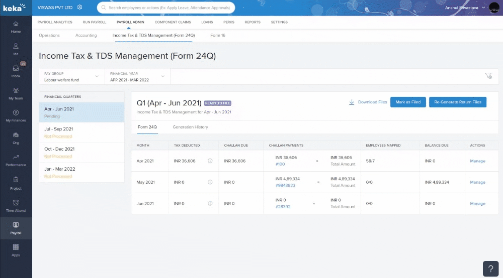 Go to Payroll → Payroll Admin → Income Tax & TDS Management (Form 24Q)