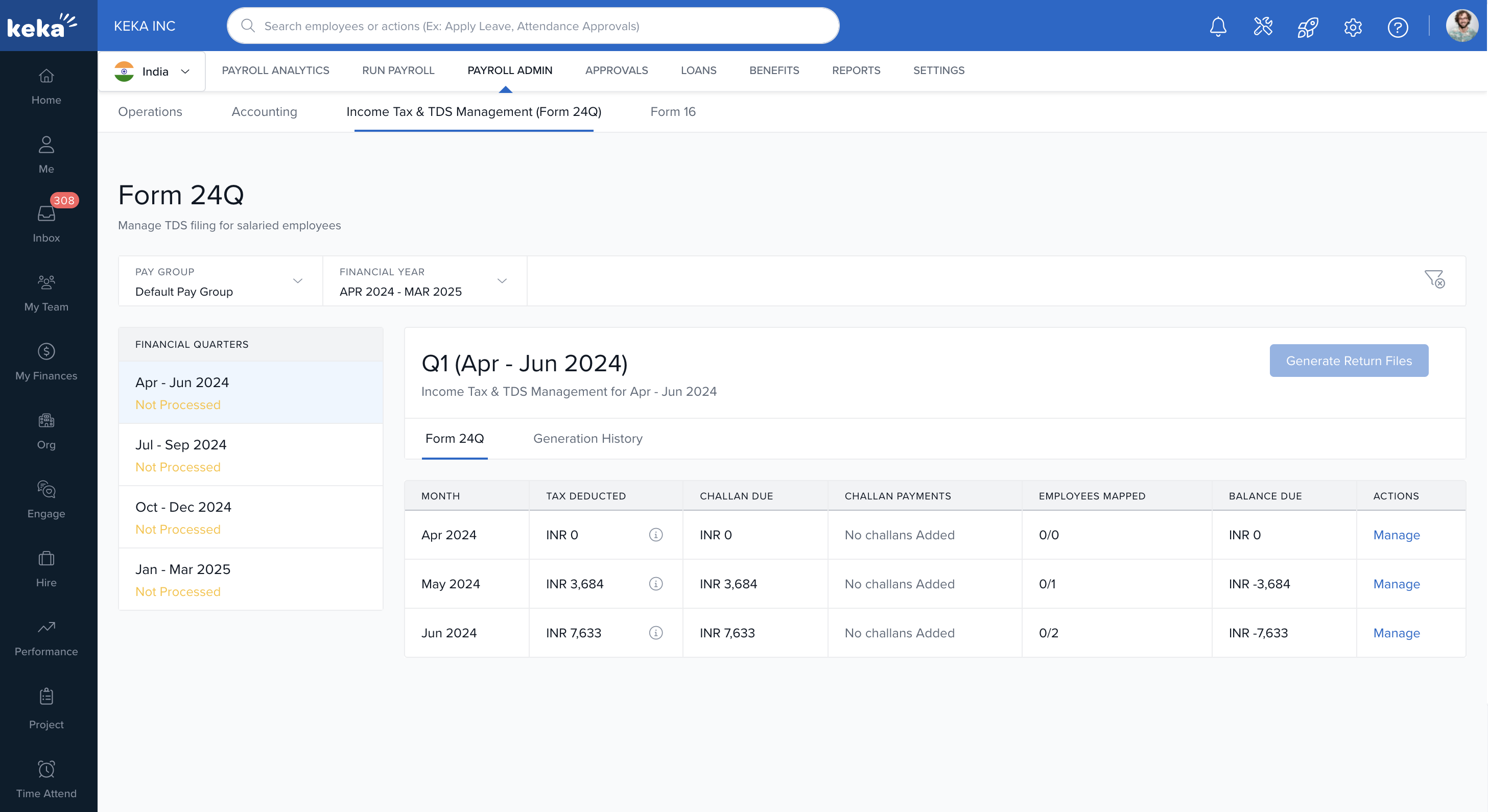 TDS (Tax Deducted at Source) returns are mandatory filings that report the tax deducted from employee payments to the Income Tax Department. In Keka, you can generate Form 24Q, the return form used for salary-related TDS filings.