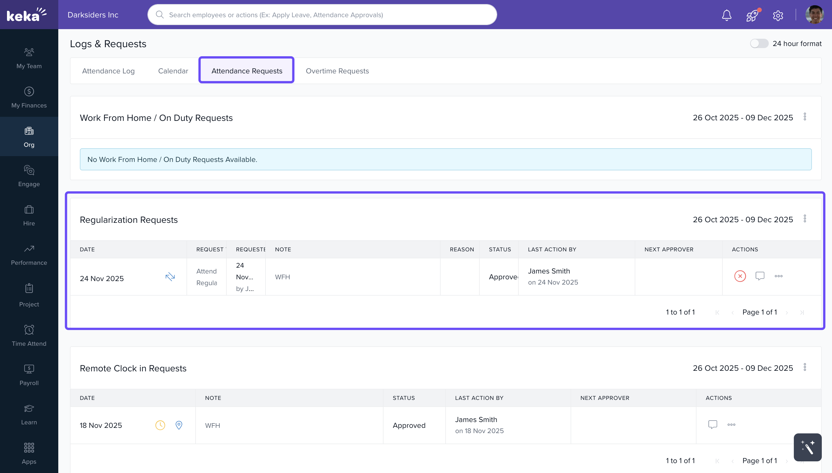 - Scroll down to find the Regularisation Requests section to view the employee’s regularisation history.