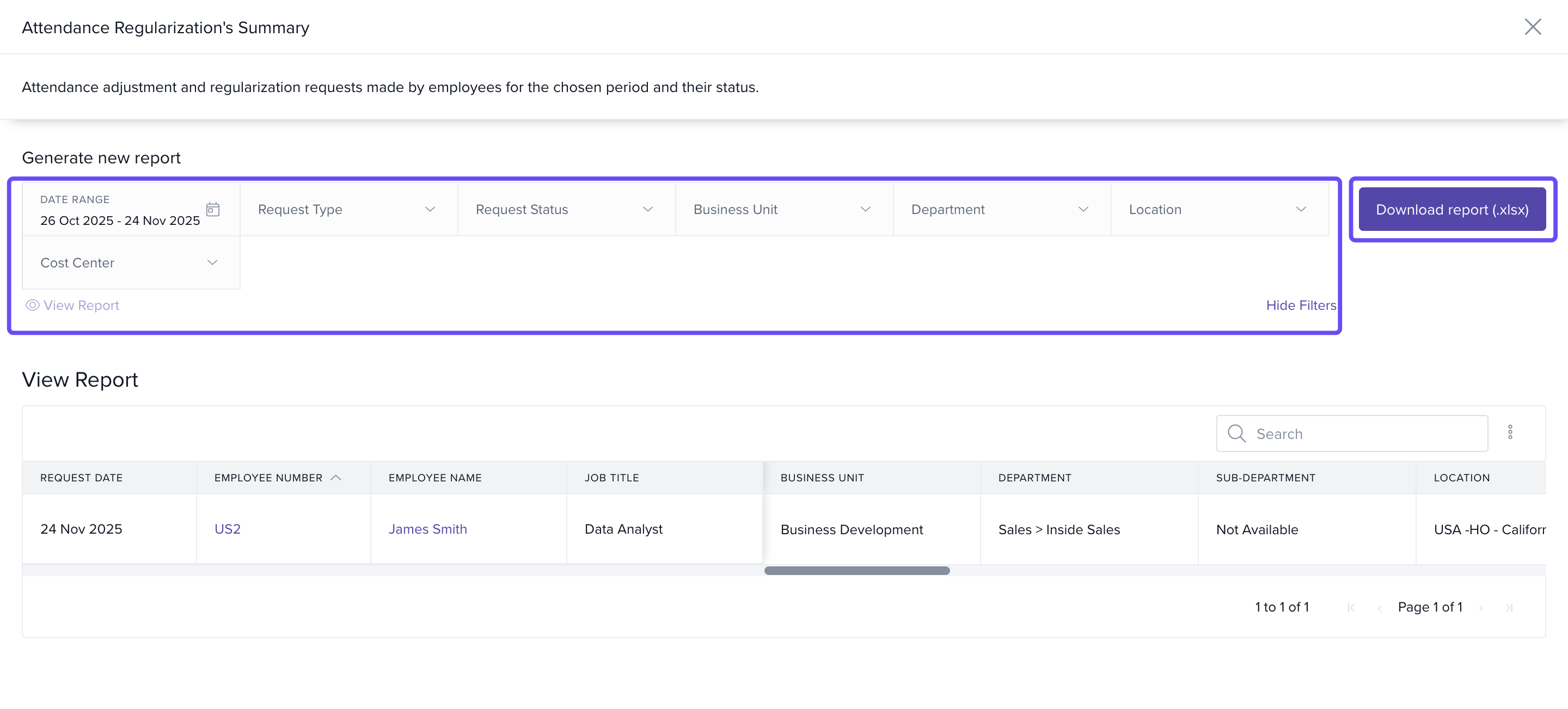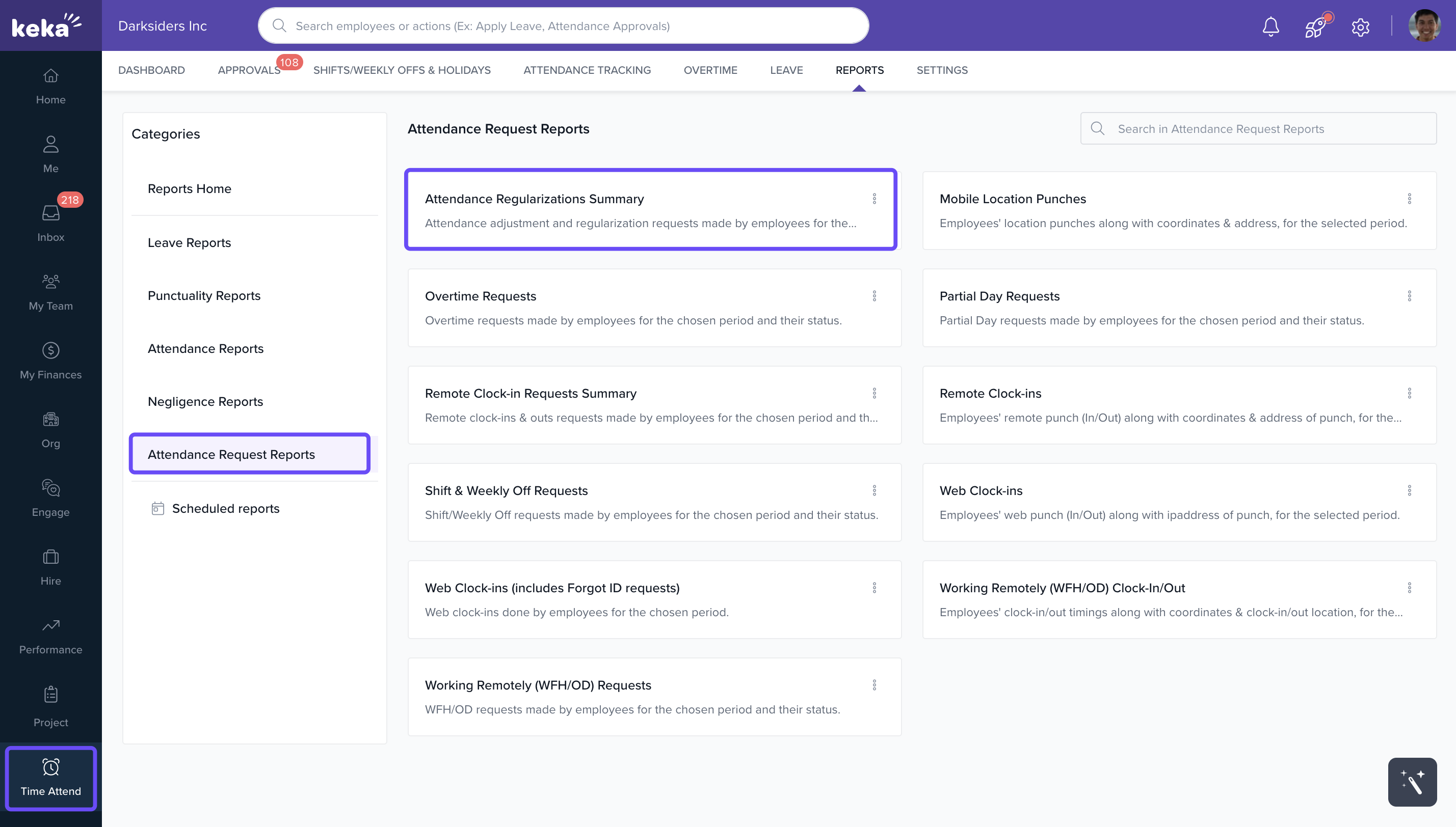 - Scroll to Attendance Request Reports and click on Attendance Regularisation Summary.