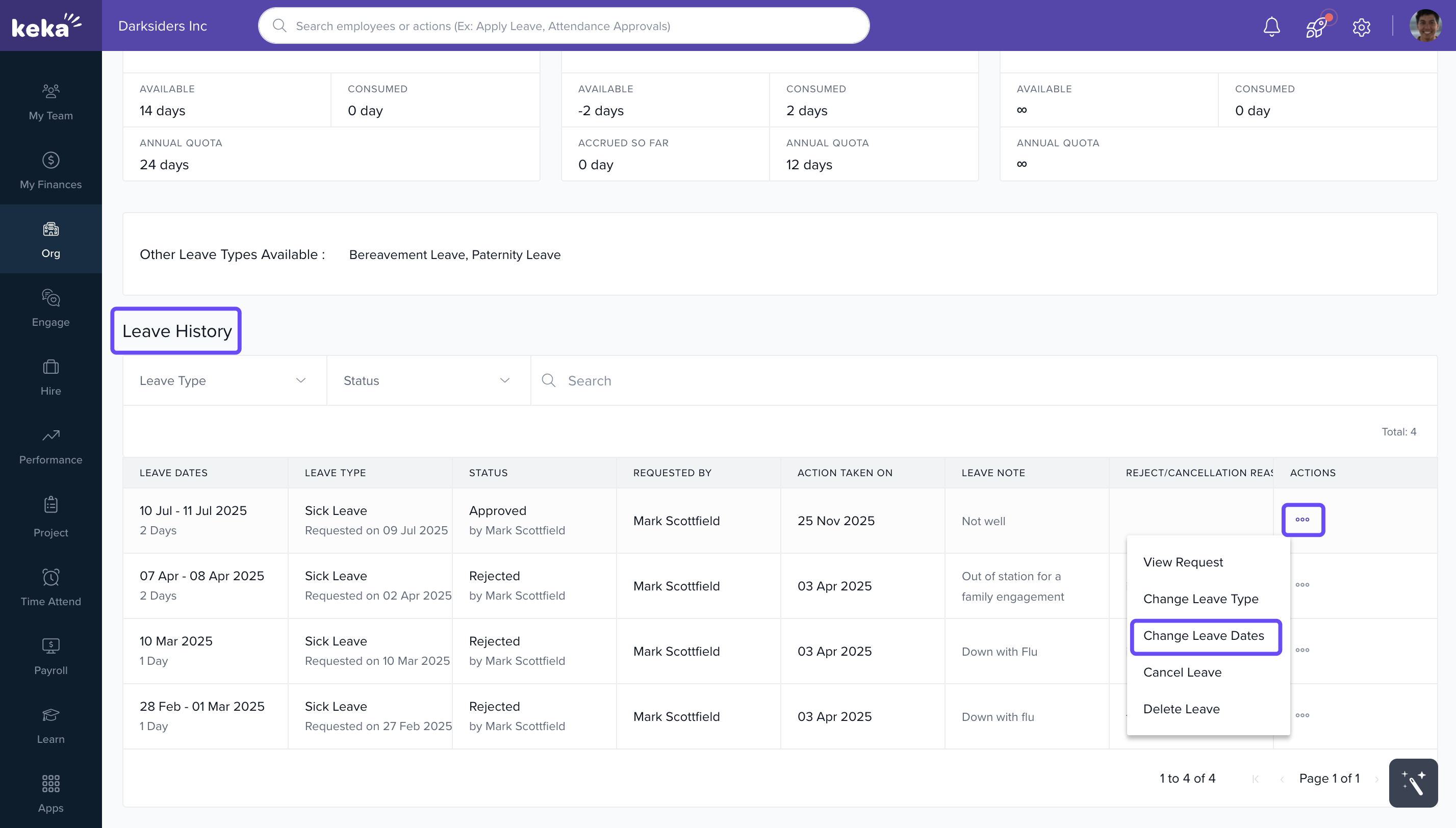 - Click on the 3 dots next to the leave dates that need to be edited, and select Change Leave Dates.