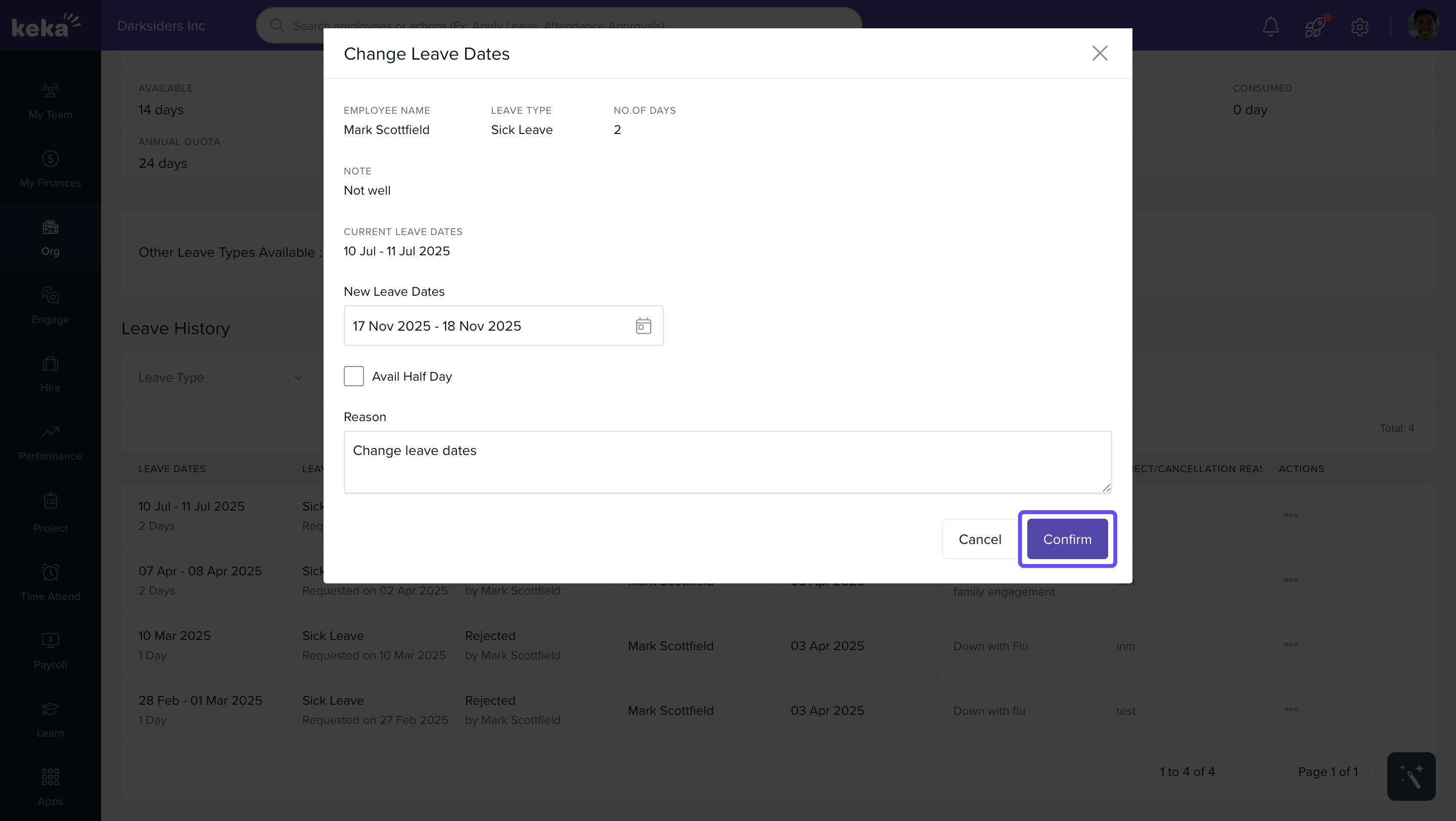 - In the pop-up window, select the New Leave Dates from the calendar.