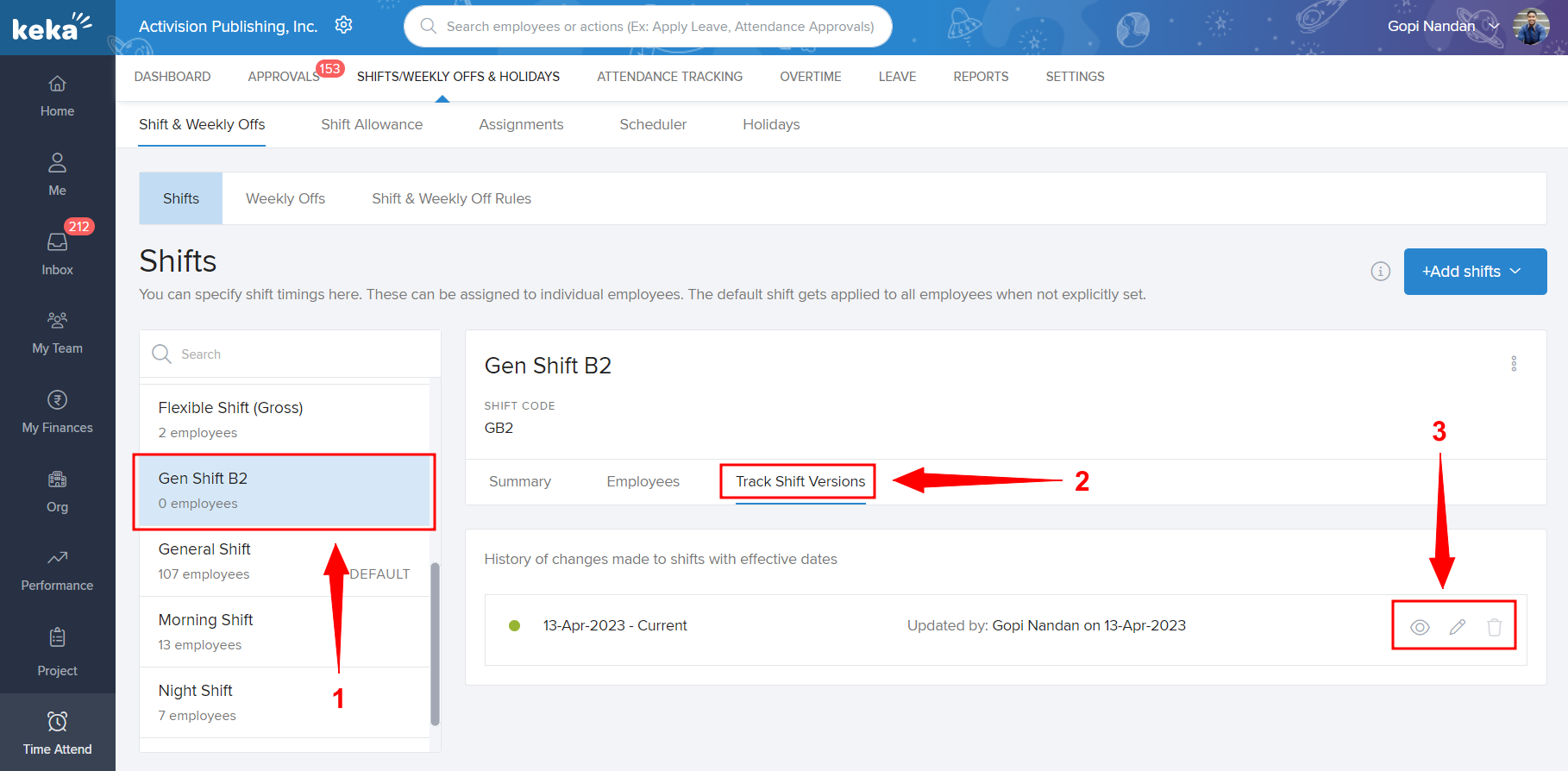 If you want to view/update/delete any of the shifts find the Shift (1) using the list and then go to Track Shift Versions (2). Here, you will find the options to view, update, and delete (3) the shift.