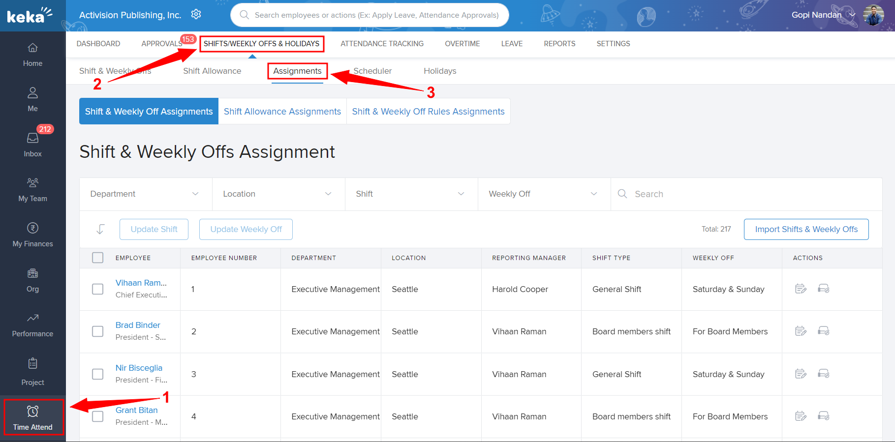 To assign or update the shift or weekly off policy to any employee, Go to Time Attend (1) section then, navigate to the Shift/Weekly Offs & Holidays (2) tab. Here you can locate the Assignments (3) sub tab.