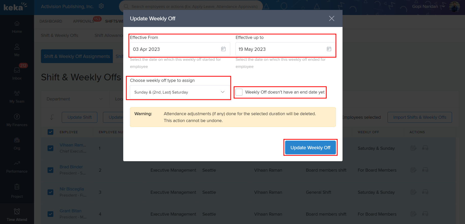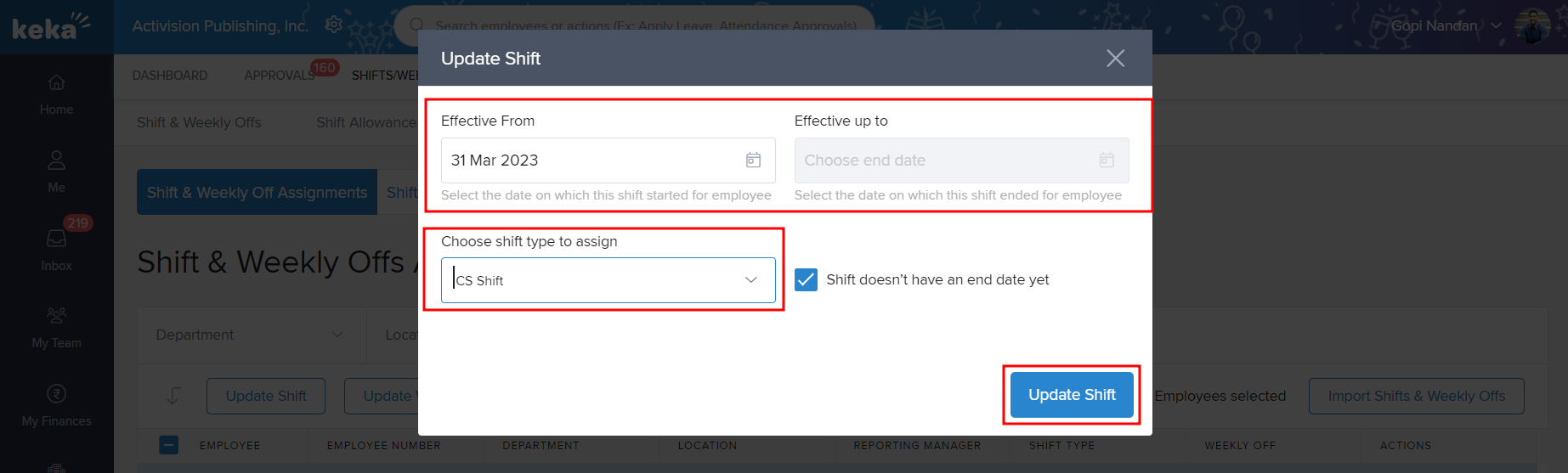 Either way, A pop-up window will appear, where you will need to specify the effective date range and choose the type of shift/weekly off you wish to assign. You can also choose to make this assignment permanent by selecting the "This shift doesn't have an end date yet" option. Finally, click on Update Shift/Weekly Off to complete the process.