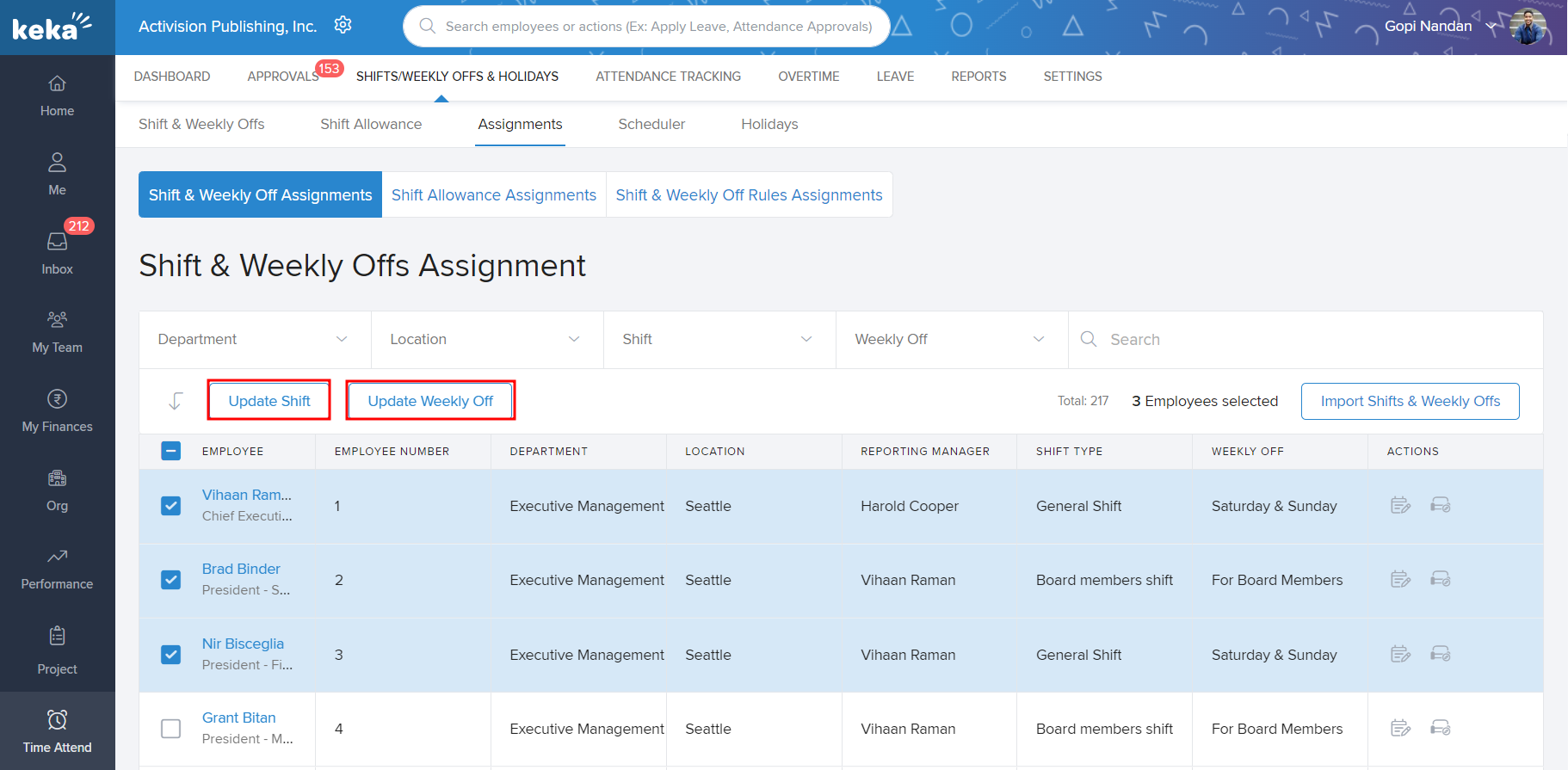 Or, if you wish to assign/update the shift or weekly off policy for multiple, then just select the employees you wish to assign the new shift to and click on the Update Shift or Update Weekly Off button.