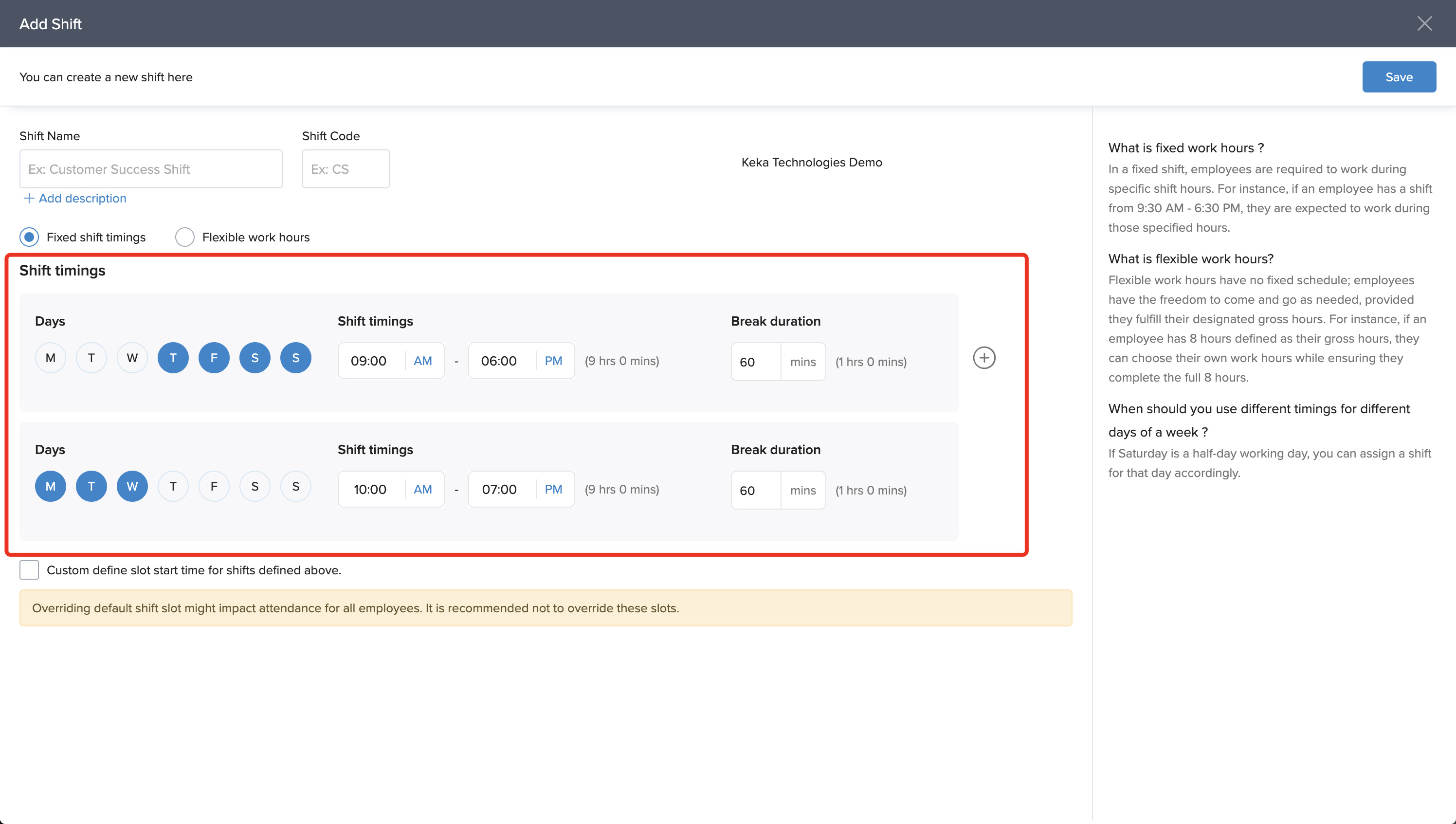 To configure different Shift Timings and Break Duration for different days, click on that particular day to create a new timing log. Now you can set different shift timings and break duration for each instance.