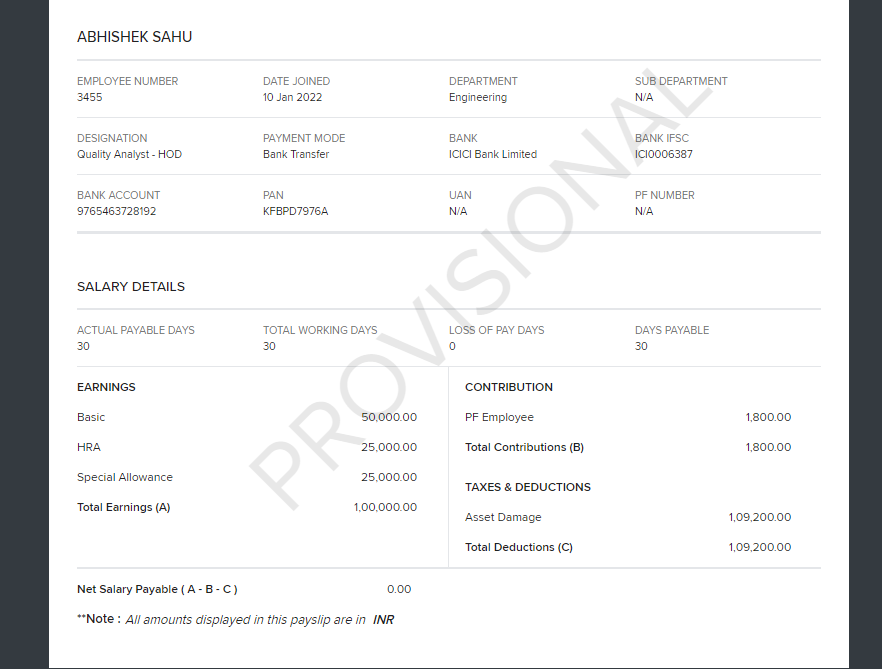 When an employee has more deductions than the gross earnings for any month, the next salary will be negative. However, in Keka, we do not have the option to display negative net pay in regular Payslip or Payregister. The net pay in such cases will be 0.