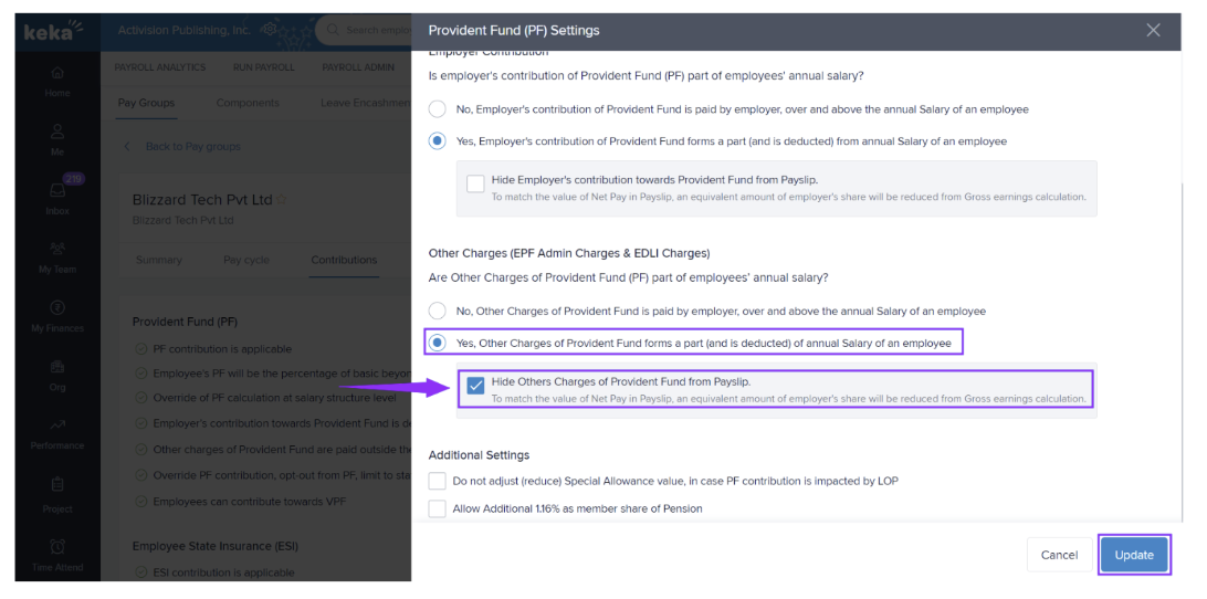 You will now see the option 'Hide Other Charges of Provident Fund from Payslip'. Check/uncheck this option as per your need.