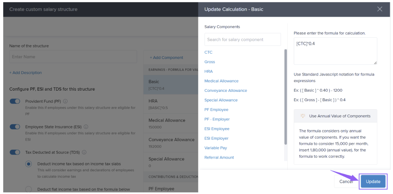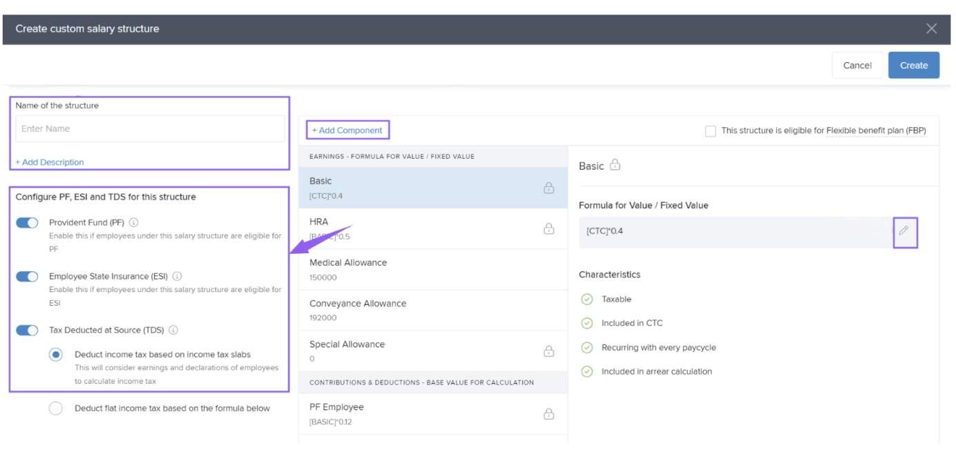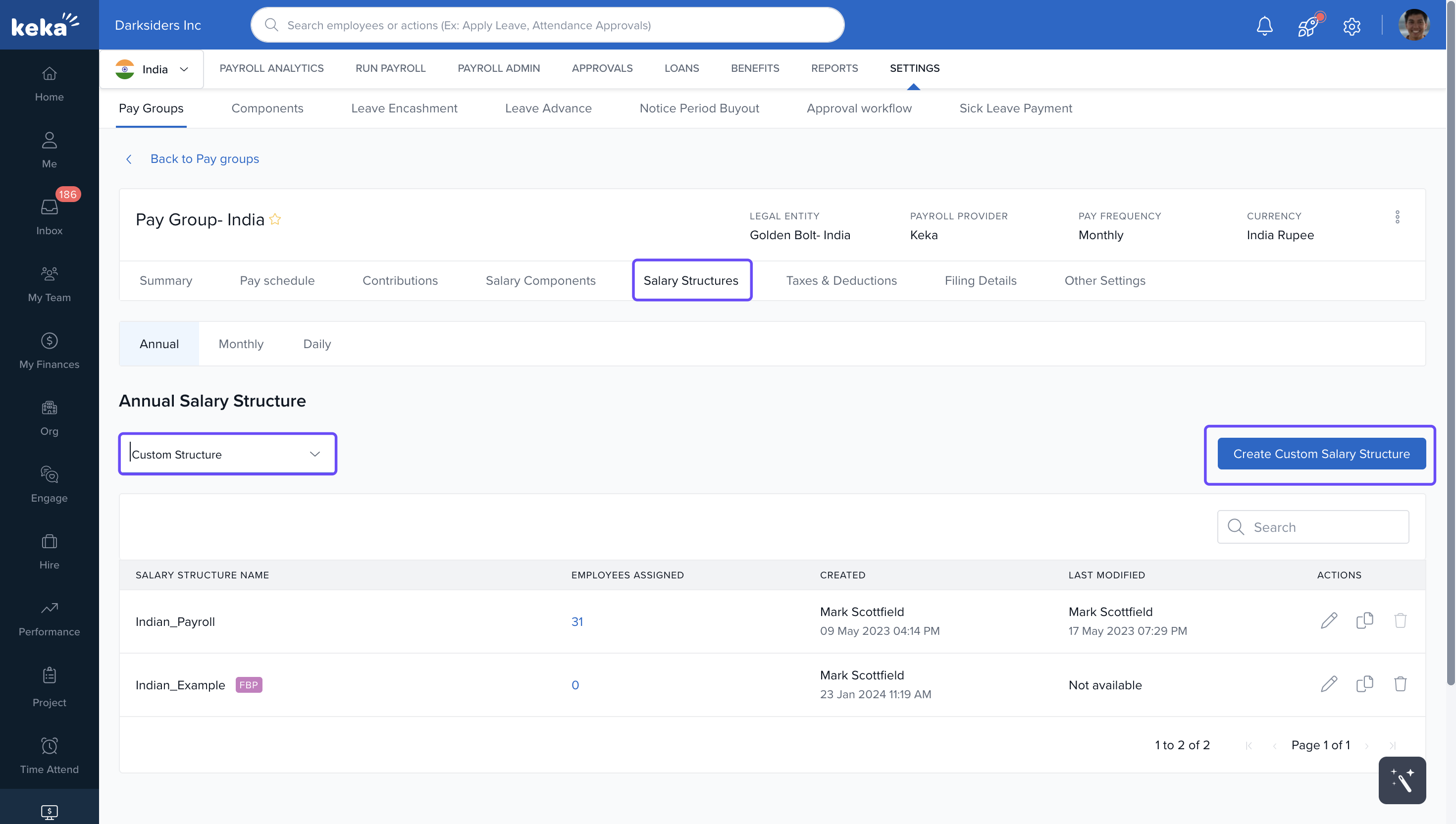 Click on Create Custom Salary Structure to create a new structure. To edit an existing one, click the Edit icon under Actions.