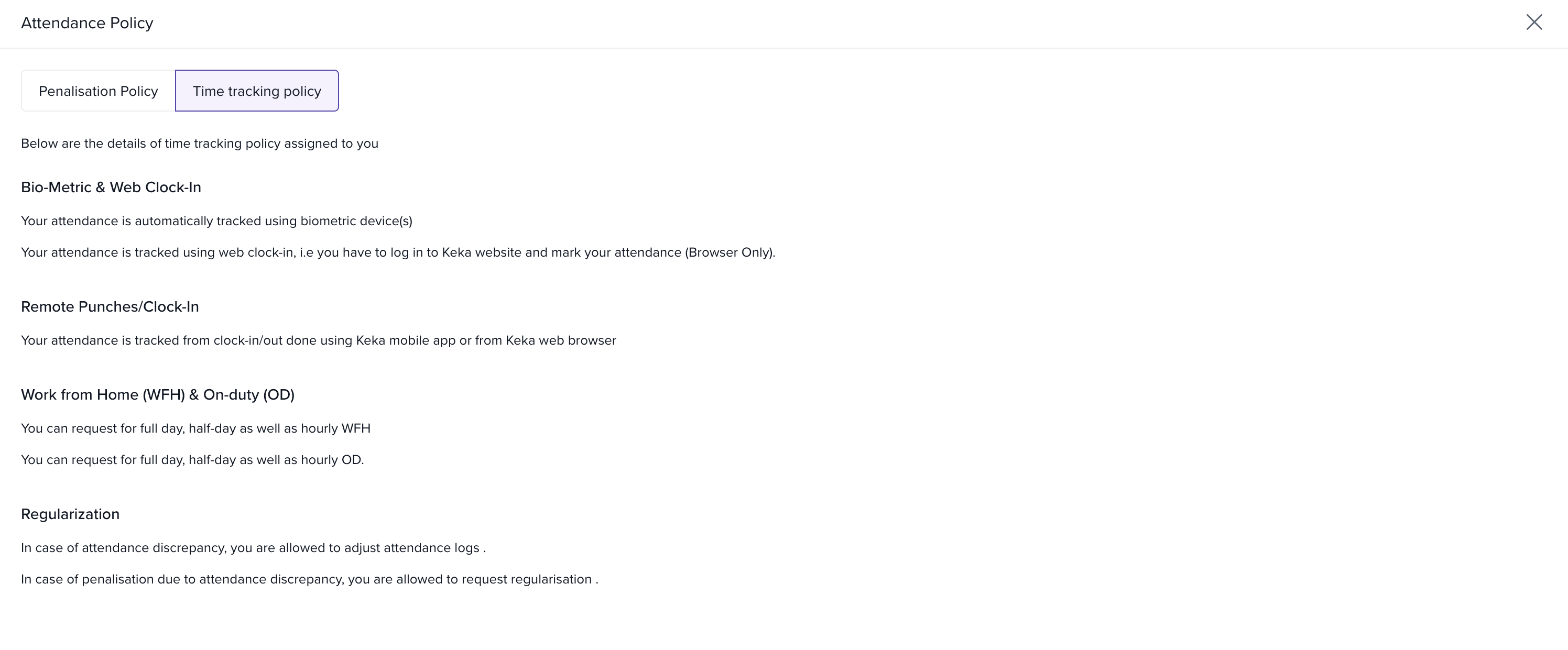 We hope this guide makes it clear how employees can view their penalisation policy and time tracking policy settings in Keka. Staying informed about these settings ensures that employees can comply with the organization’s attendance rules.