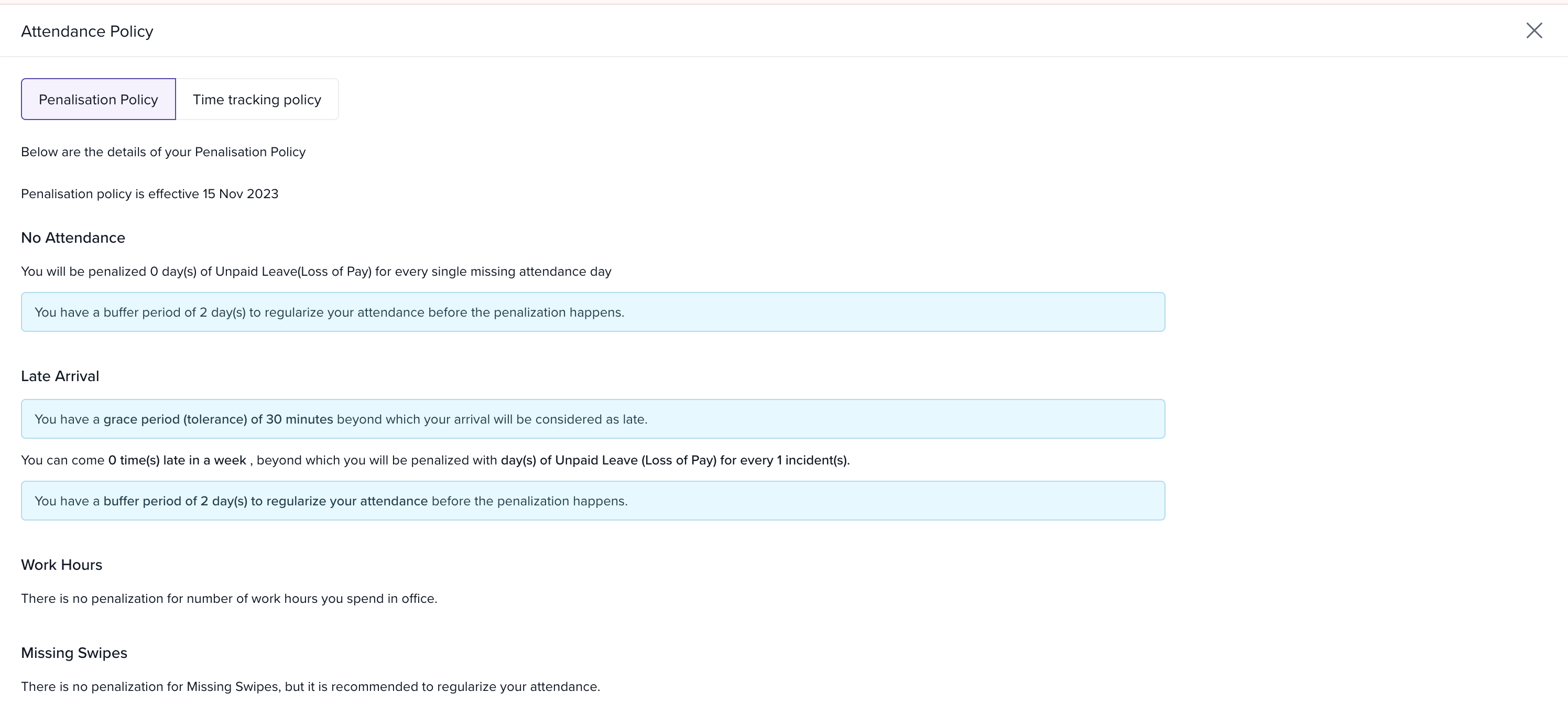 This will display the configurations of your assigned tracking policy, including any penalties for incidents like late arrivals or missed attendance swipes.