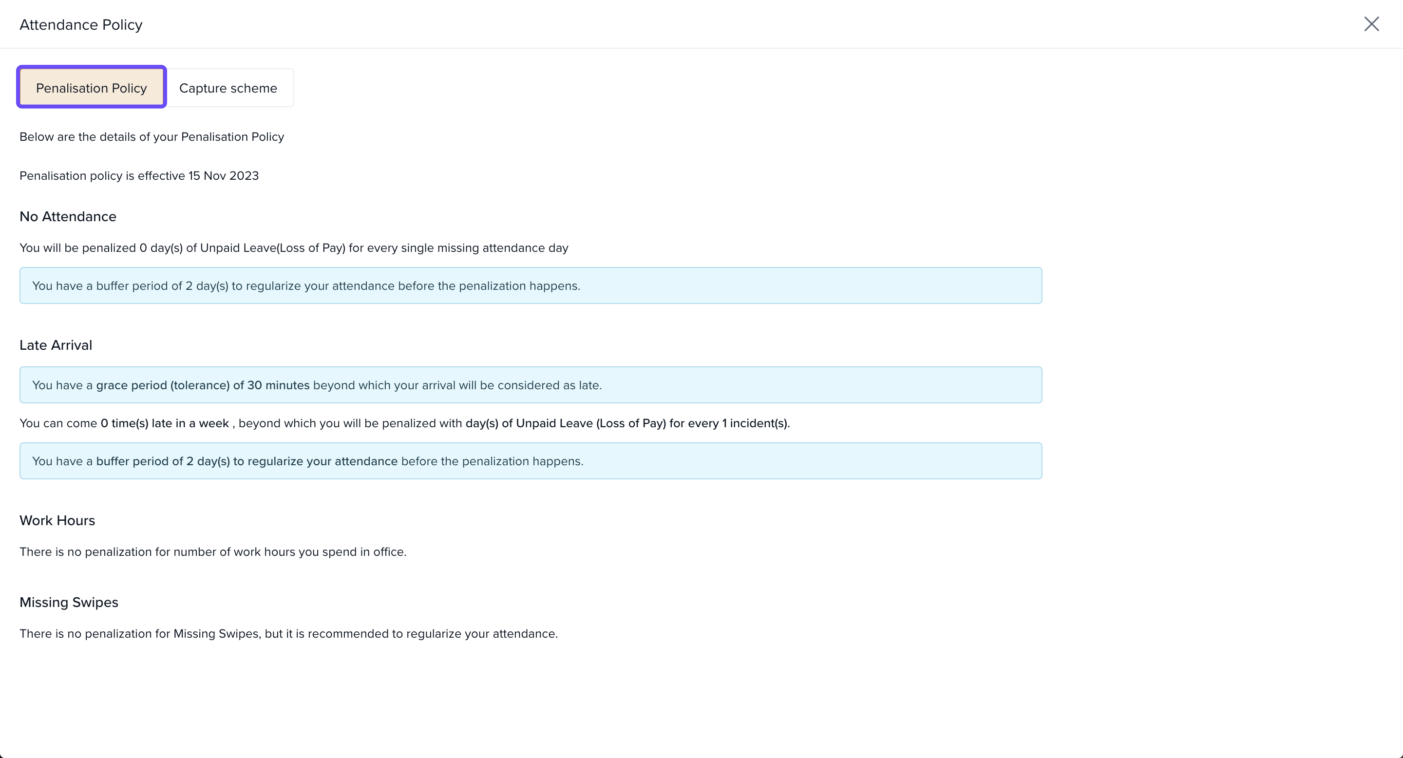 We hope this guide makes it clear how employees can view their penalisation policy and capture scheme settings in Keka. Staying informed about these settings ensures that employees can comply with the organization’s attendance rules.