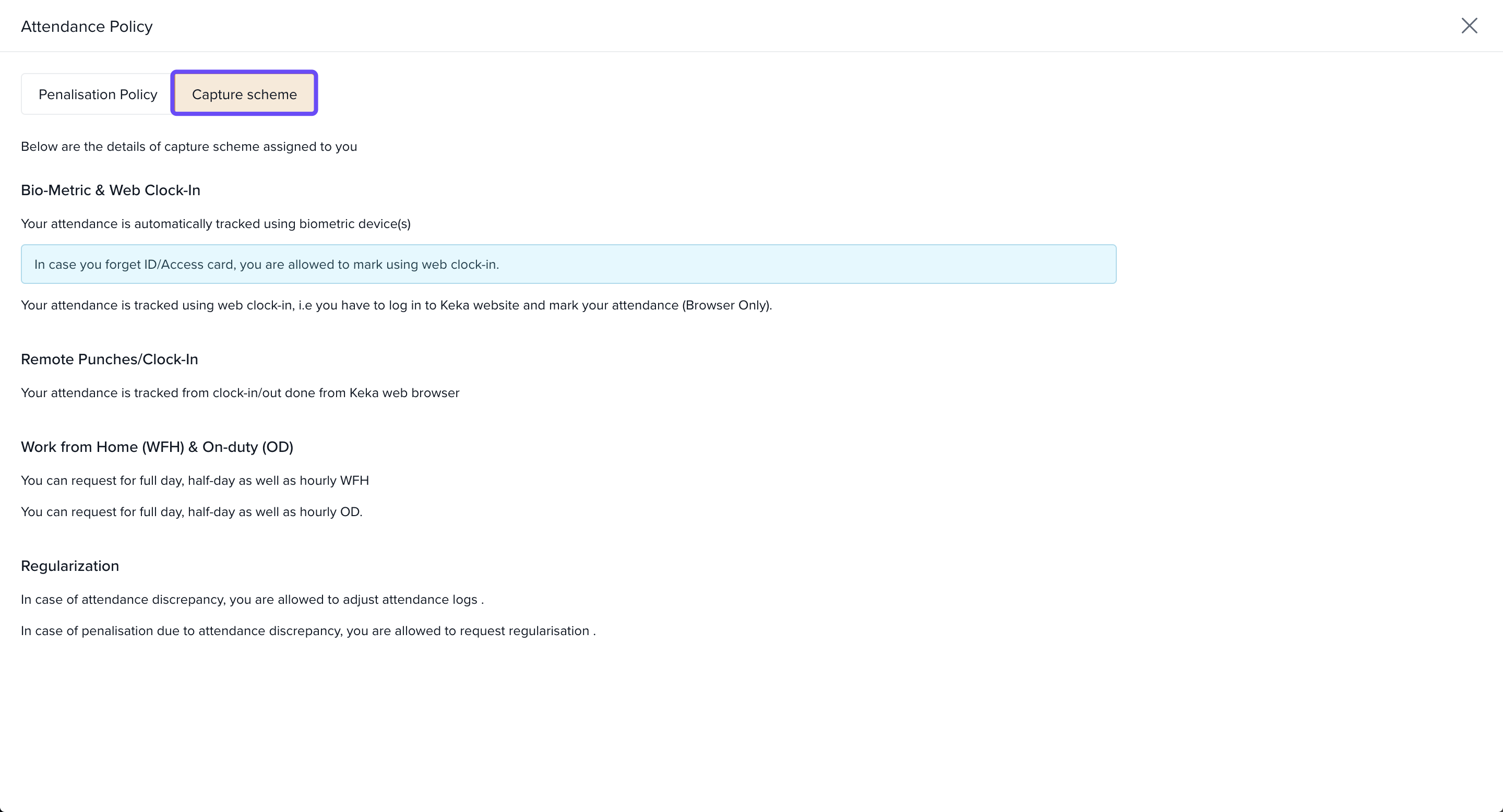 In Keka, the Capture Scheme defines how employees can mark their attendance, such as through remote clock-ins, web clock-ins, or biometric systems. The Penalisation Policy outlines penalties for incidents like no attendance being marked, late arrivals, working less than the desired hours, or missing swipes. It’s important for employees to be aware of both the capture scheme and penalisation policy they are assigned to, in order to stay compliant.