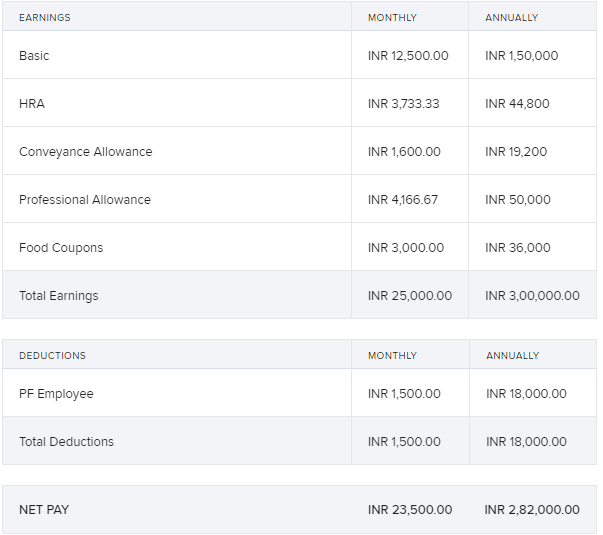 Now say an employee has 300000 CTC and this amount is not sufficient to accommodate all the components. So in the case the CTC amount is divided into components in which it can and will not include the other components. You can check the screenshot below for the breakup.