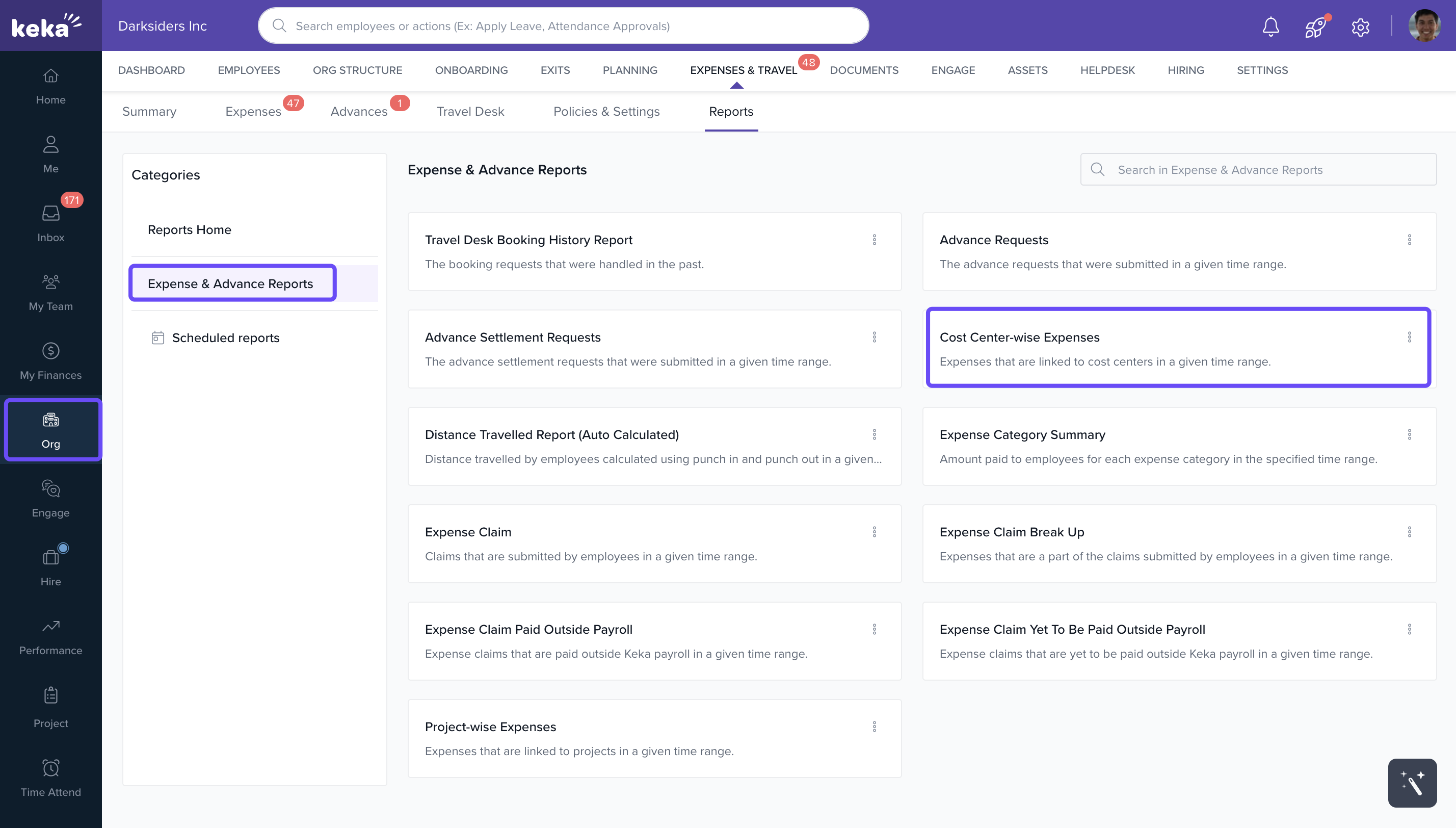 - Go to Org from the left navigation panel and click on Expense & Travel. Then, navigate to the Reports section.