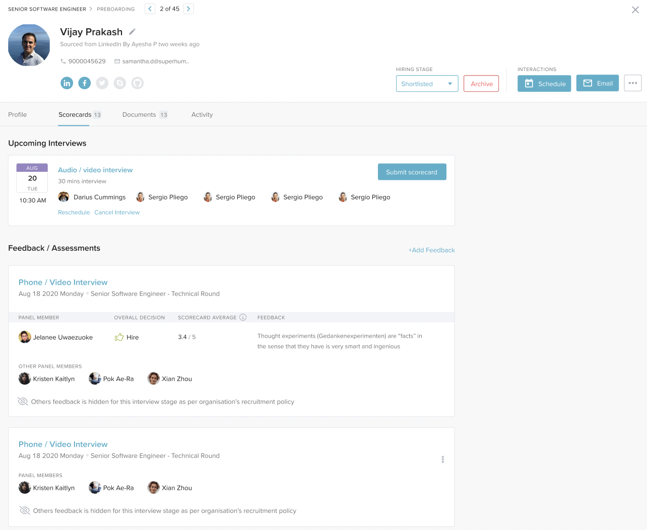 Interviewers can view feedback from others in current and previous stages, but not in future stages.
