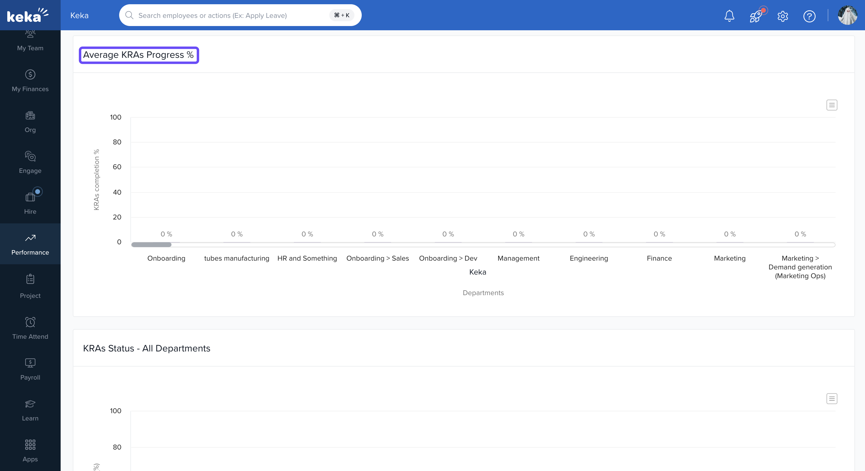 - The page also breaks down the average progress of goals by departments through a bar graph, providing insights into departmental performance.