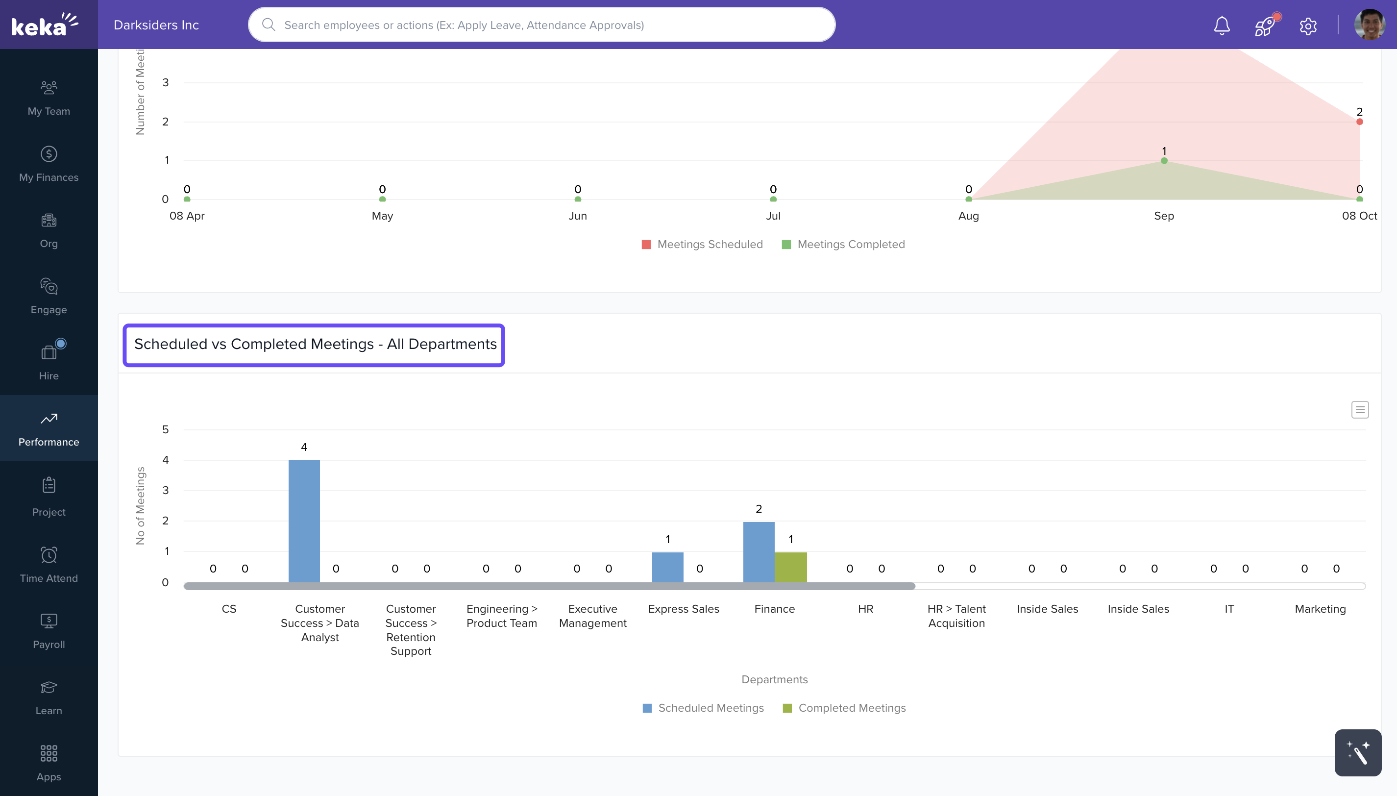 Meeting Summary Chart: Shows number of meetings scheduled, completed, and pending across all departments.