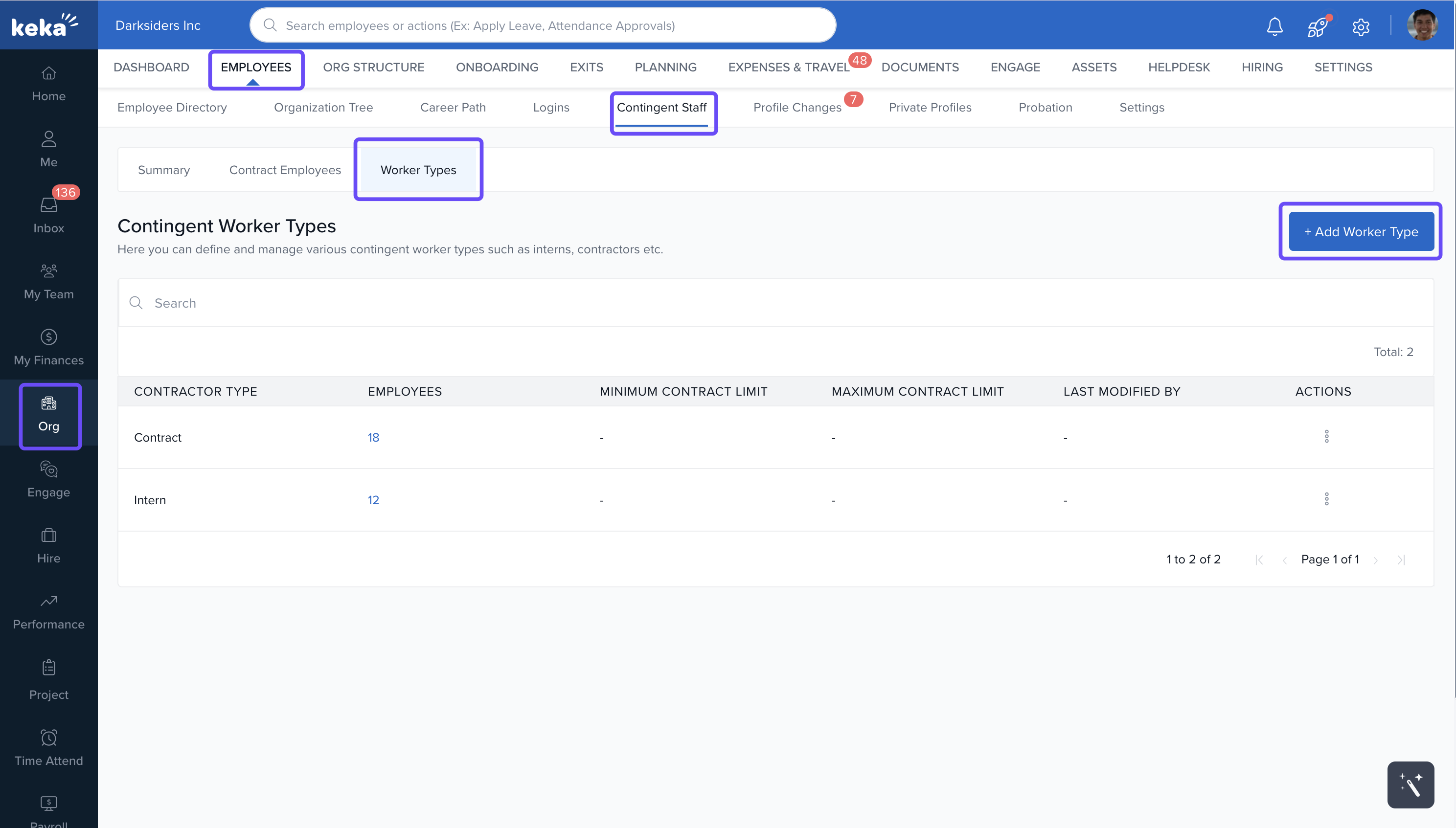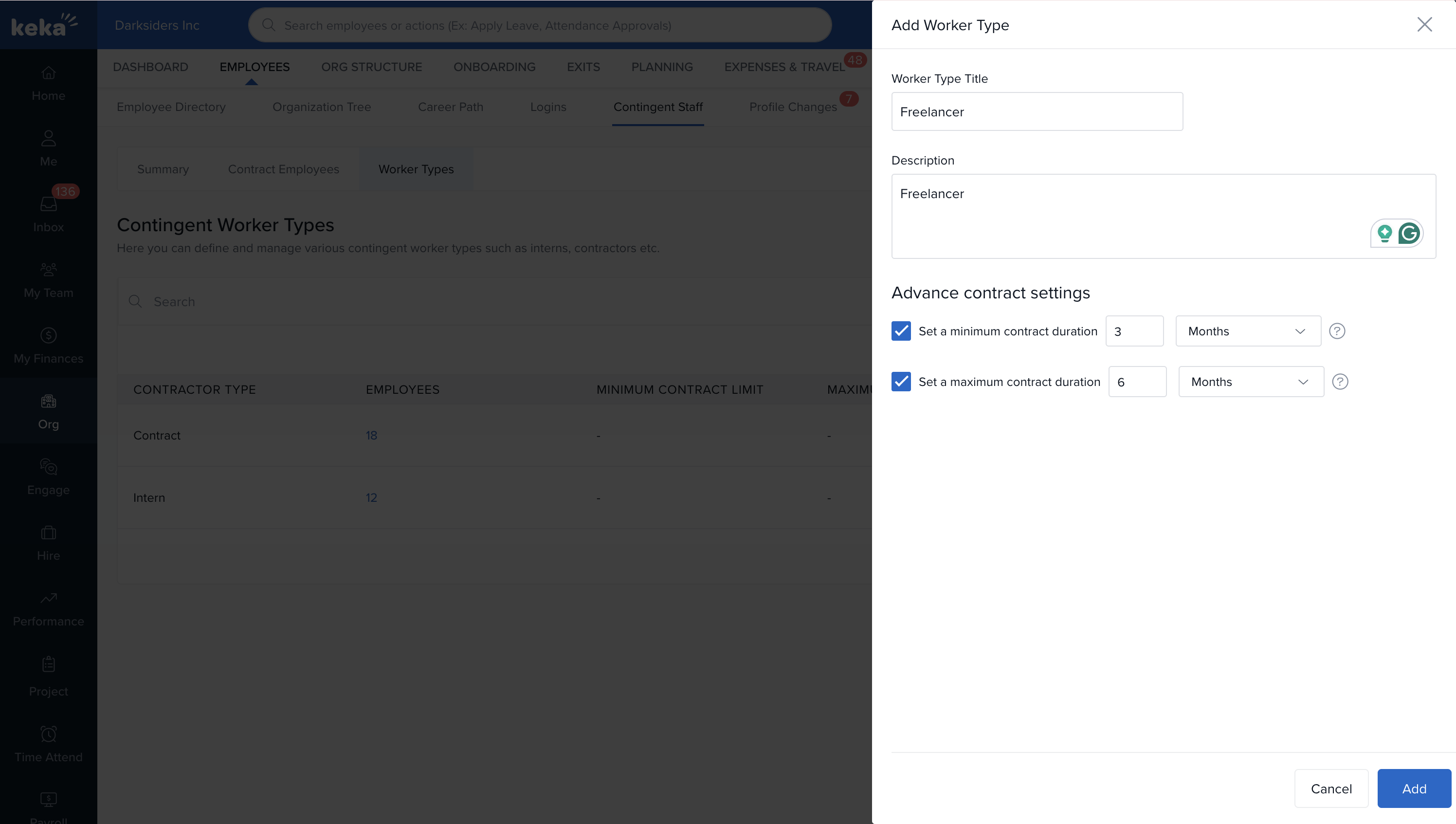 Keka’s Worker Types feature helps you classify your workforce based on role, contract type, or other internal criteria. It also allows you to define specific contract durations for each worker type, giving you flexibility while staying aligned with company policies.