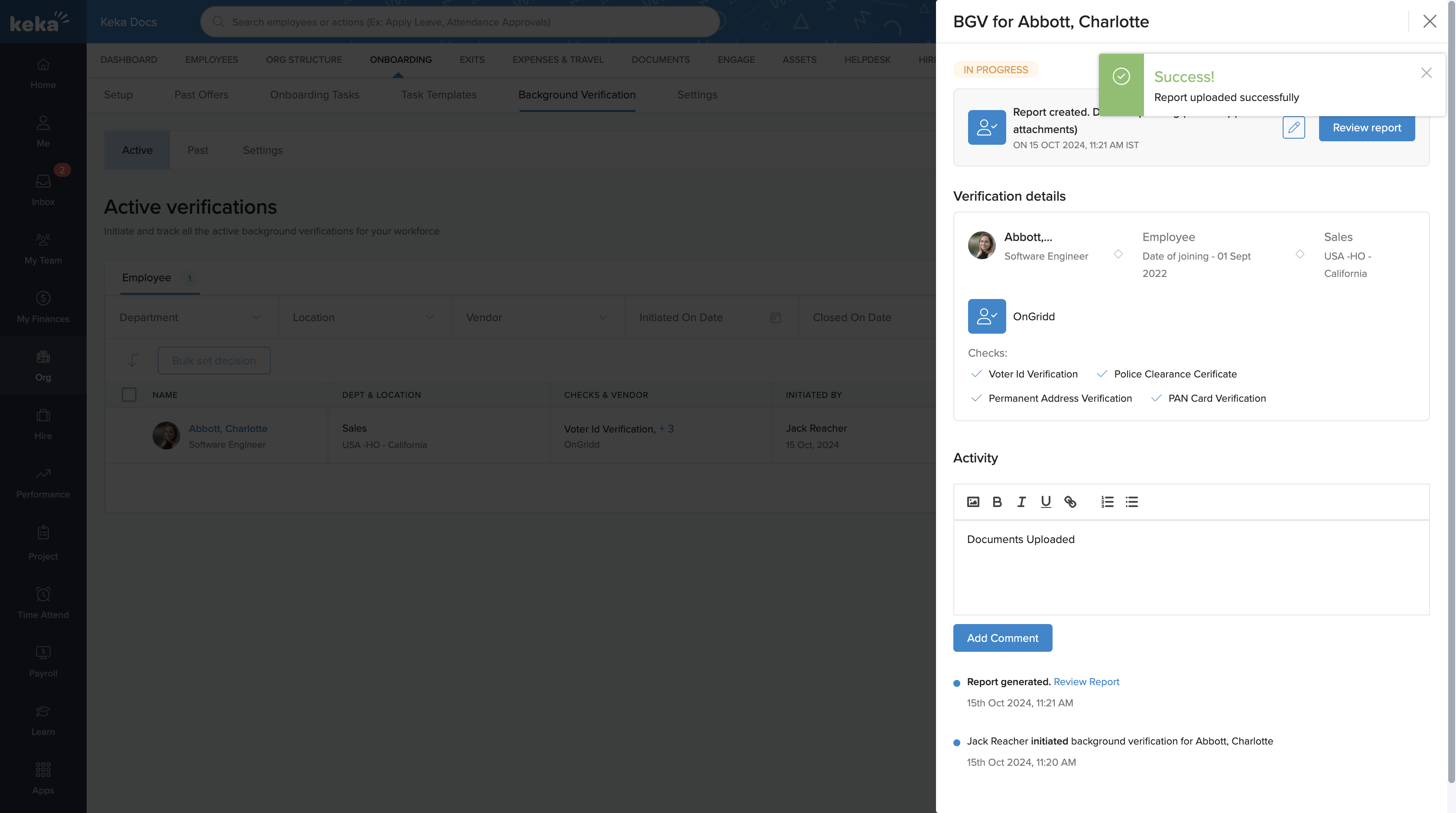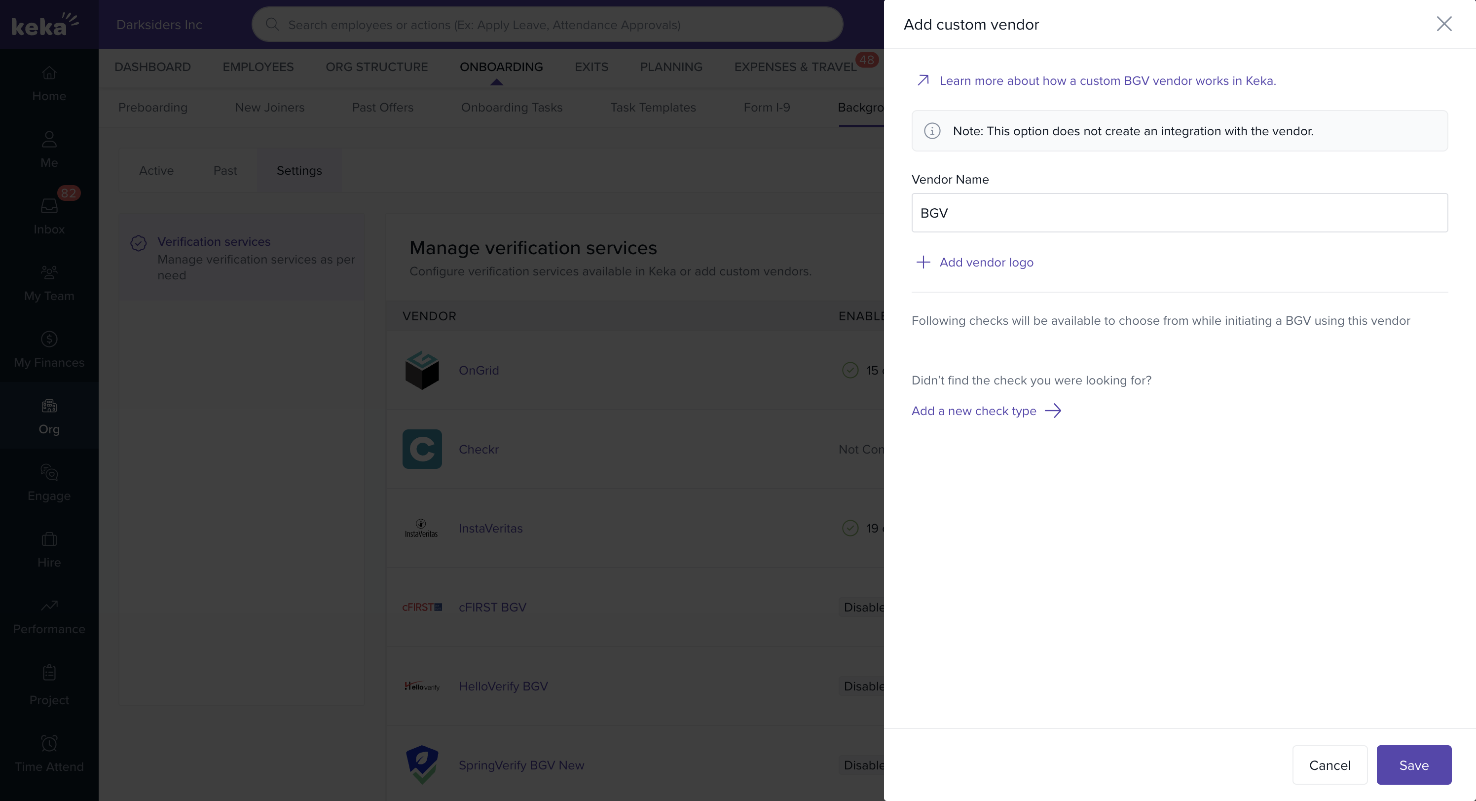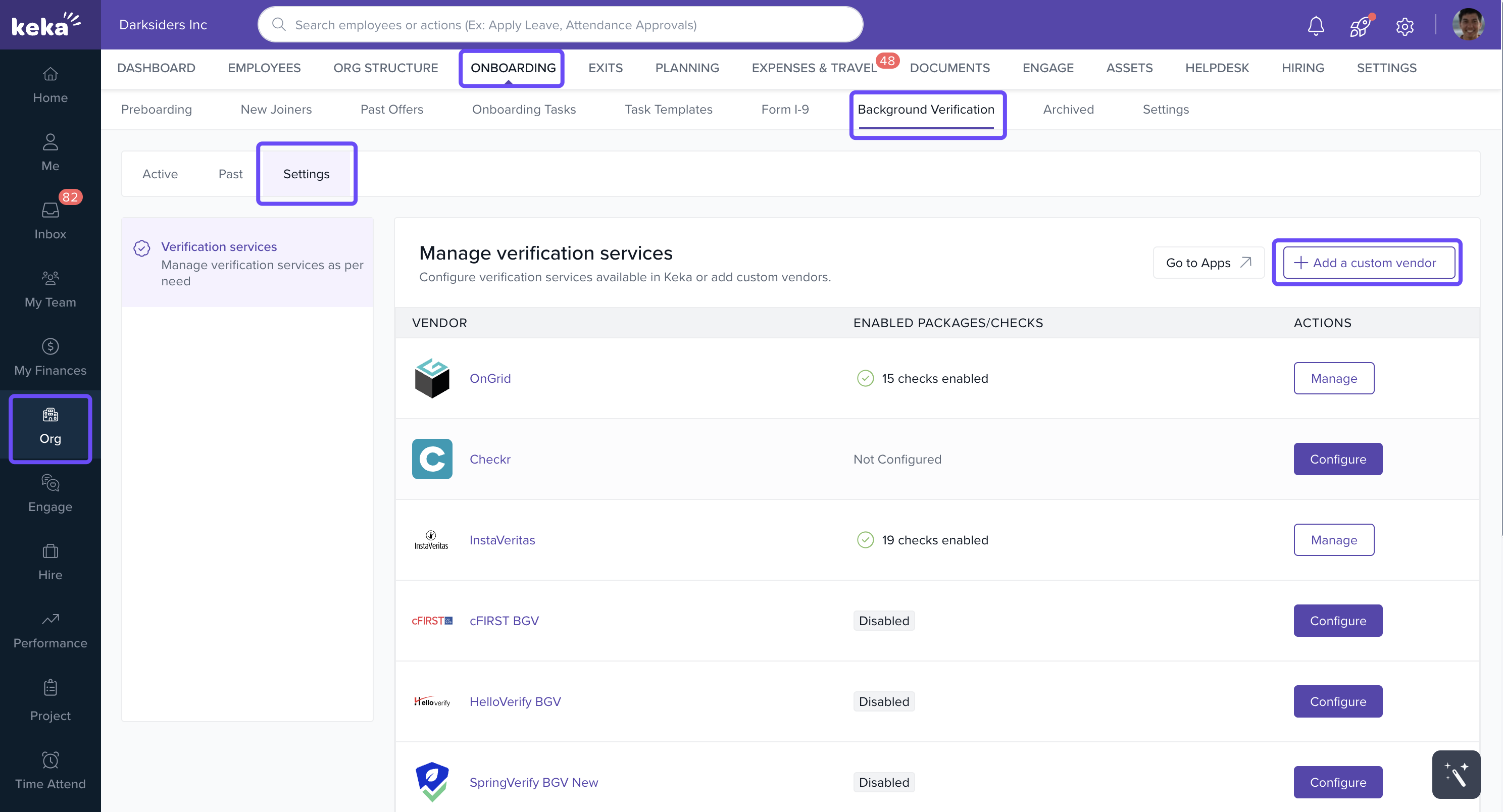 With Custom BGV Vendors in Keka, you can extend flexibility beyond built-in integrations, ensuring smooth handling of all background verification processes—whether through partners like Ongrid and SpringVerify or your own preferred vendor.