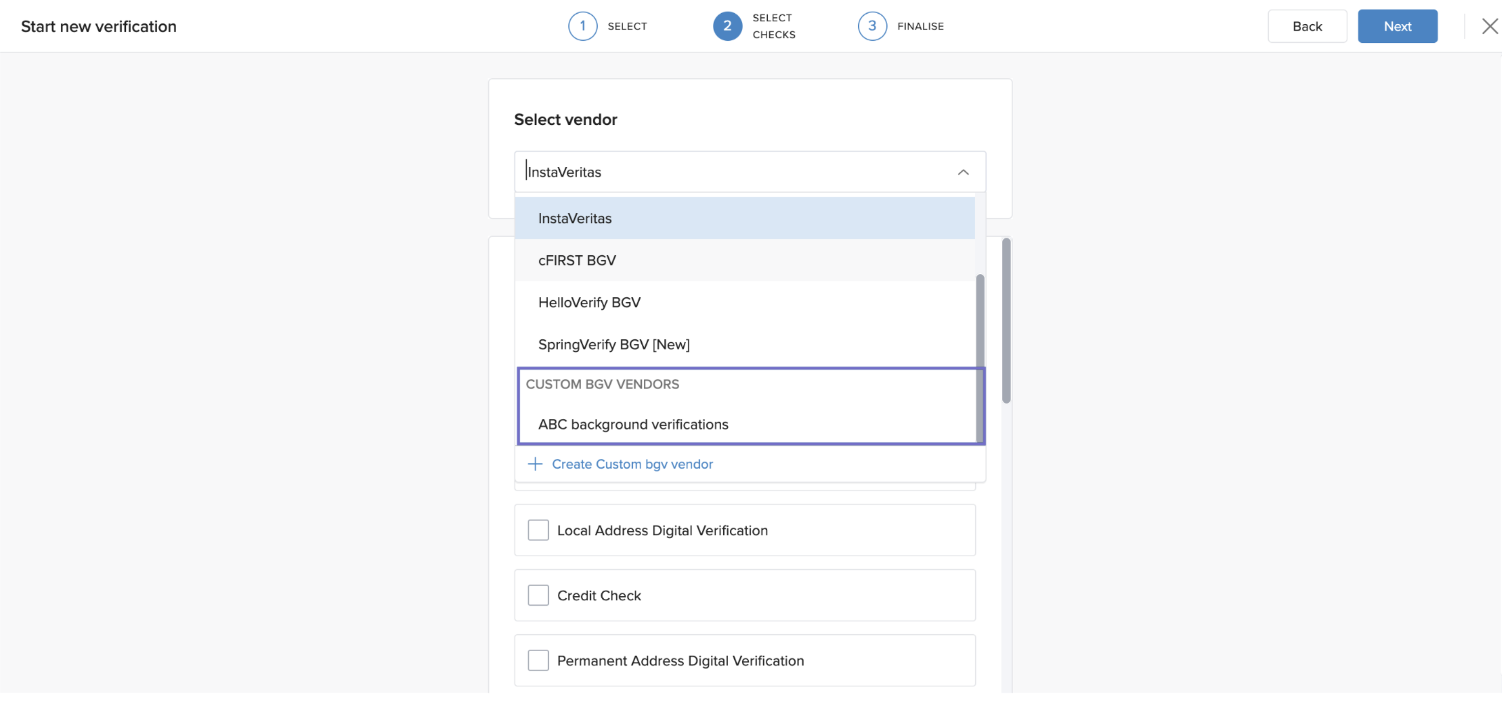 - From the vendor options, choose your custom BGV vendor.