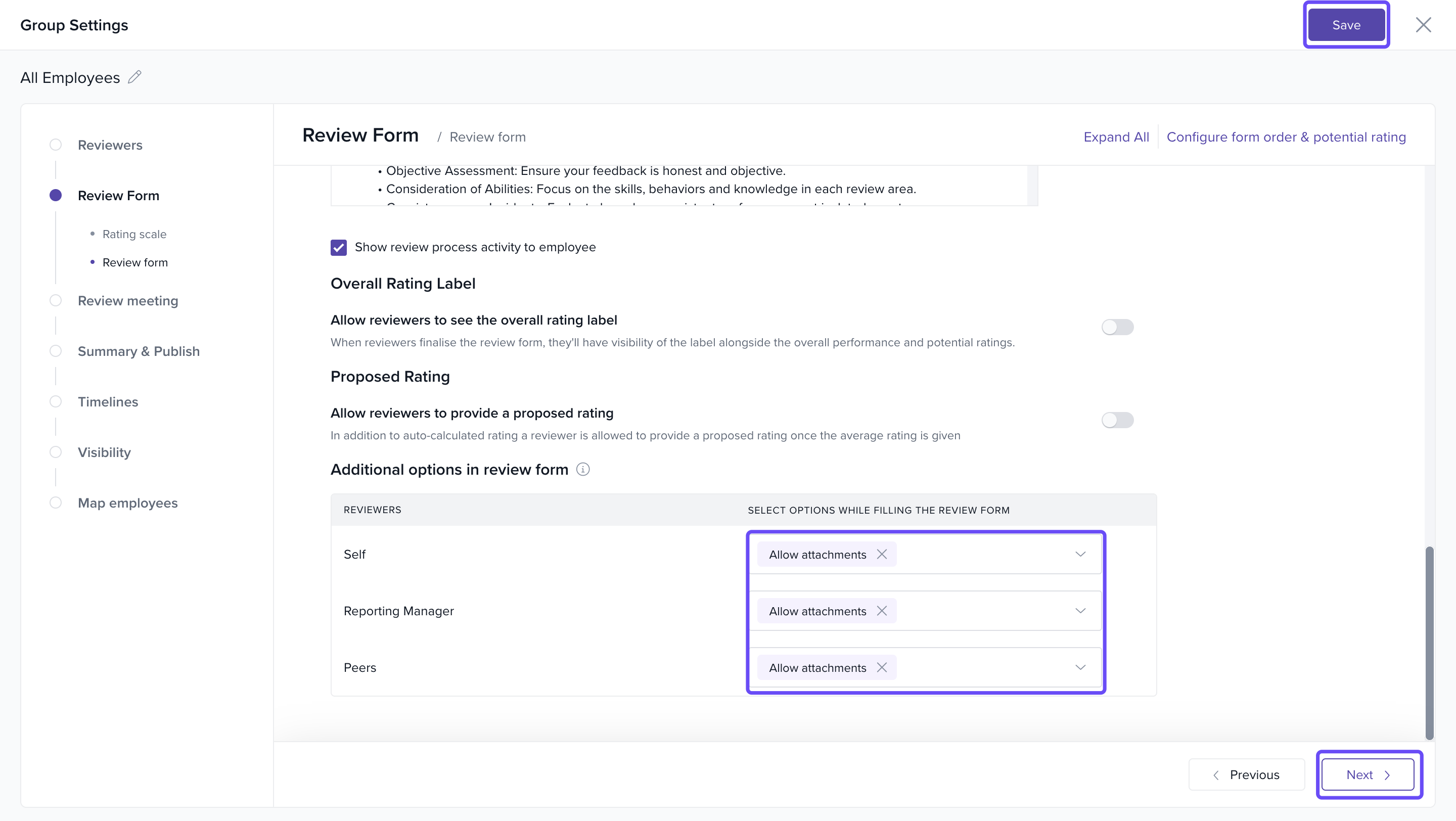 That’s how a performance admin can enable attachments in the review form, allowing reviewers to upload relevant documents that support their evaluation.