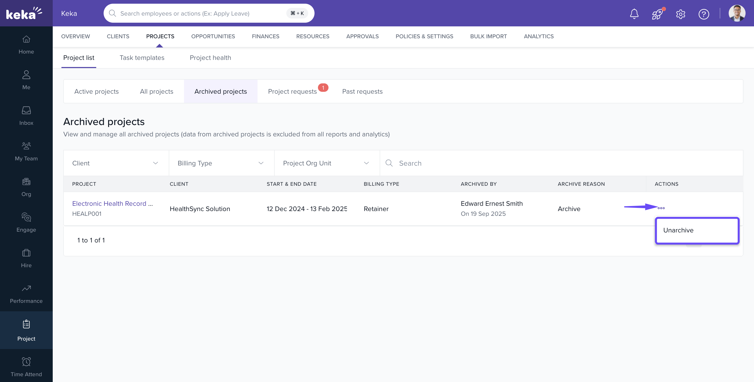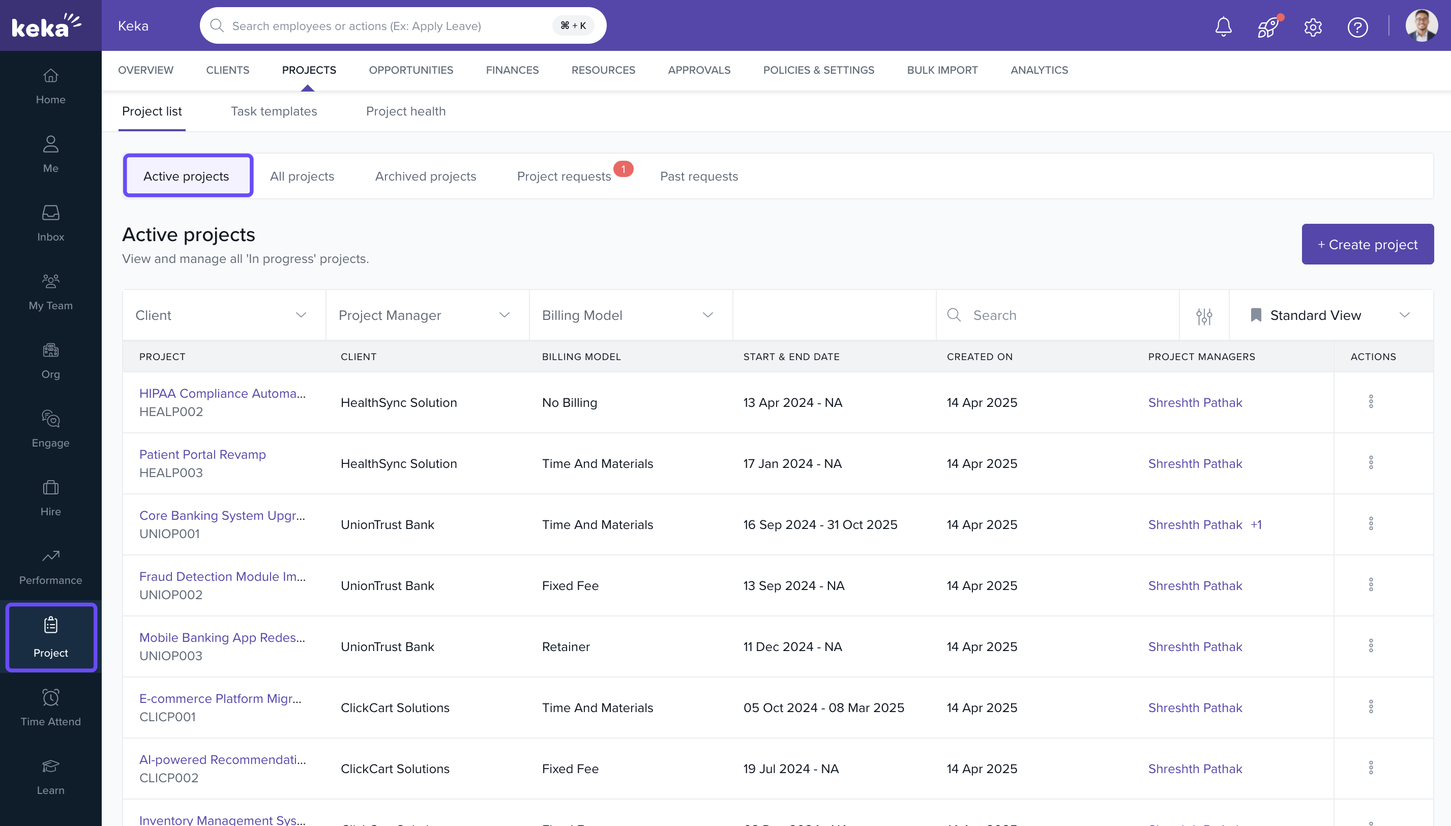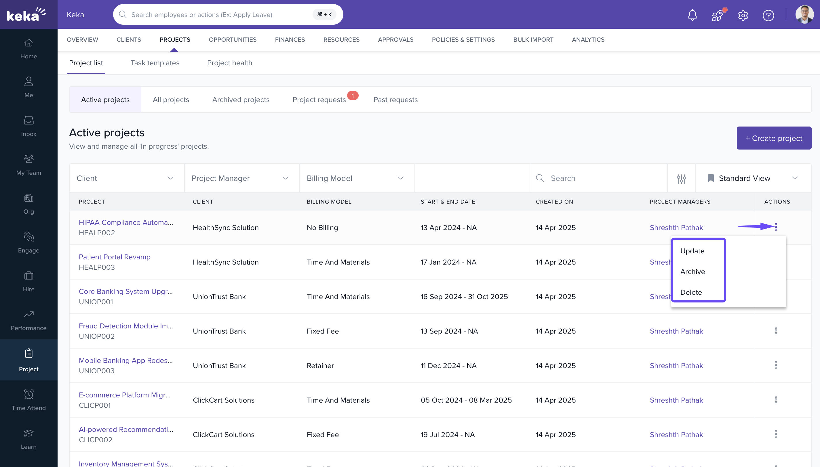 The Project List page in Keka PSA offers a centralized view of all your projects—active, archived, or completed—allowing administrators and project managers to track progress, update details, or manage project statuses efficiently. With intuitive filters and easy-to-access action controls, this page is essential for overseeing your project landscape at a glance.