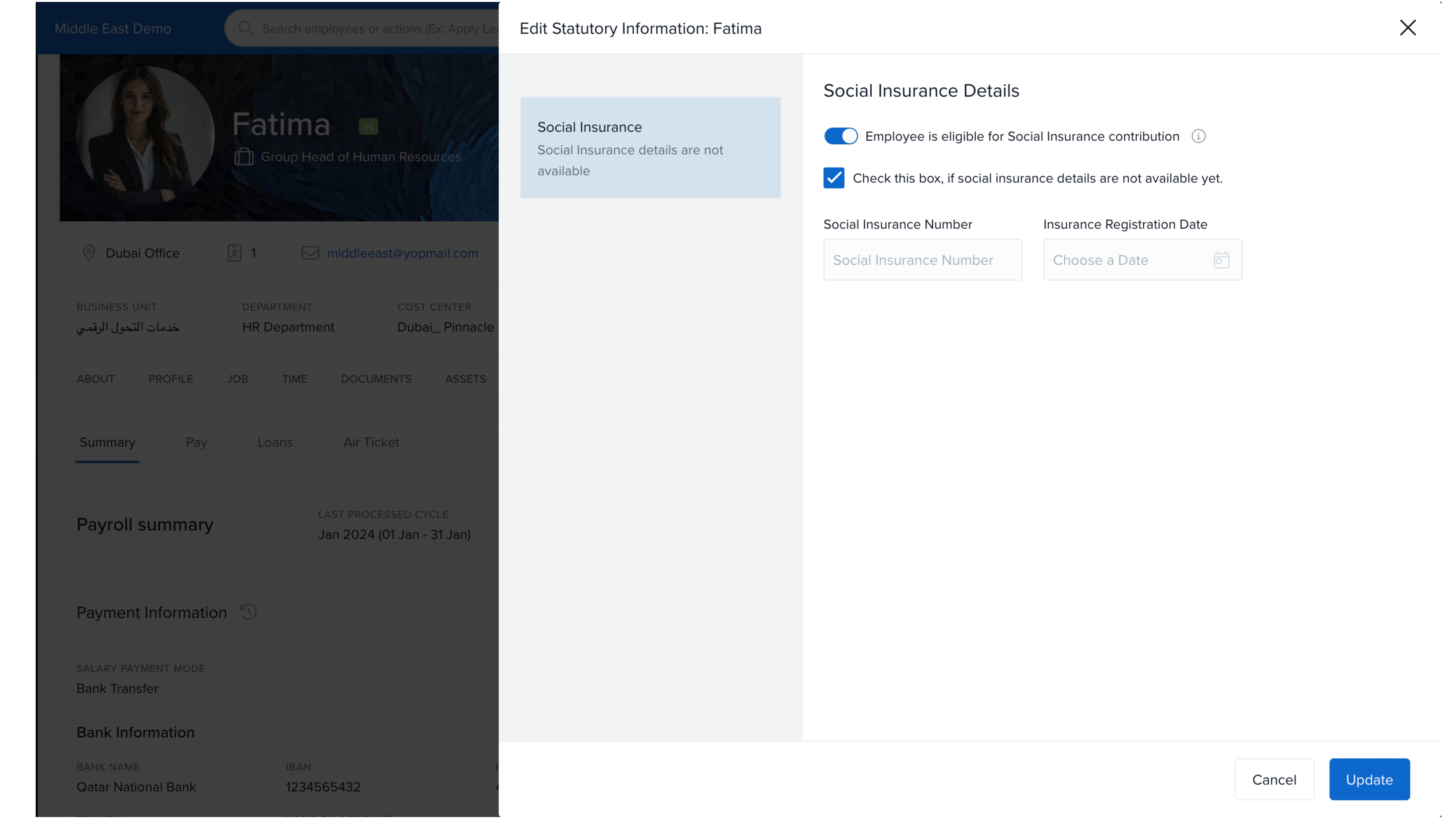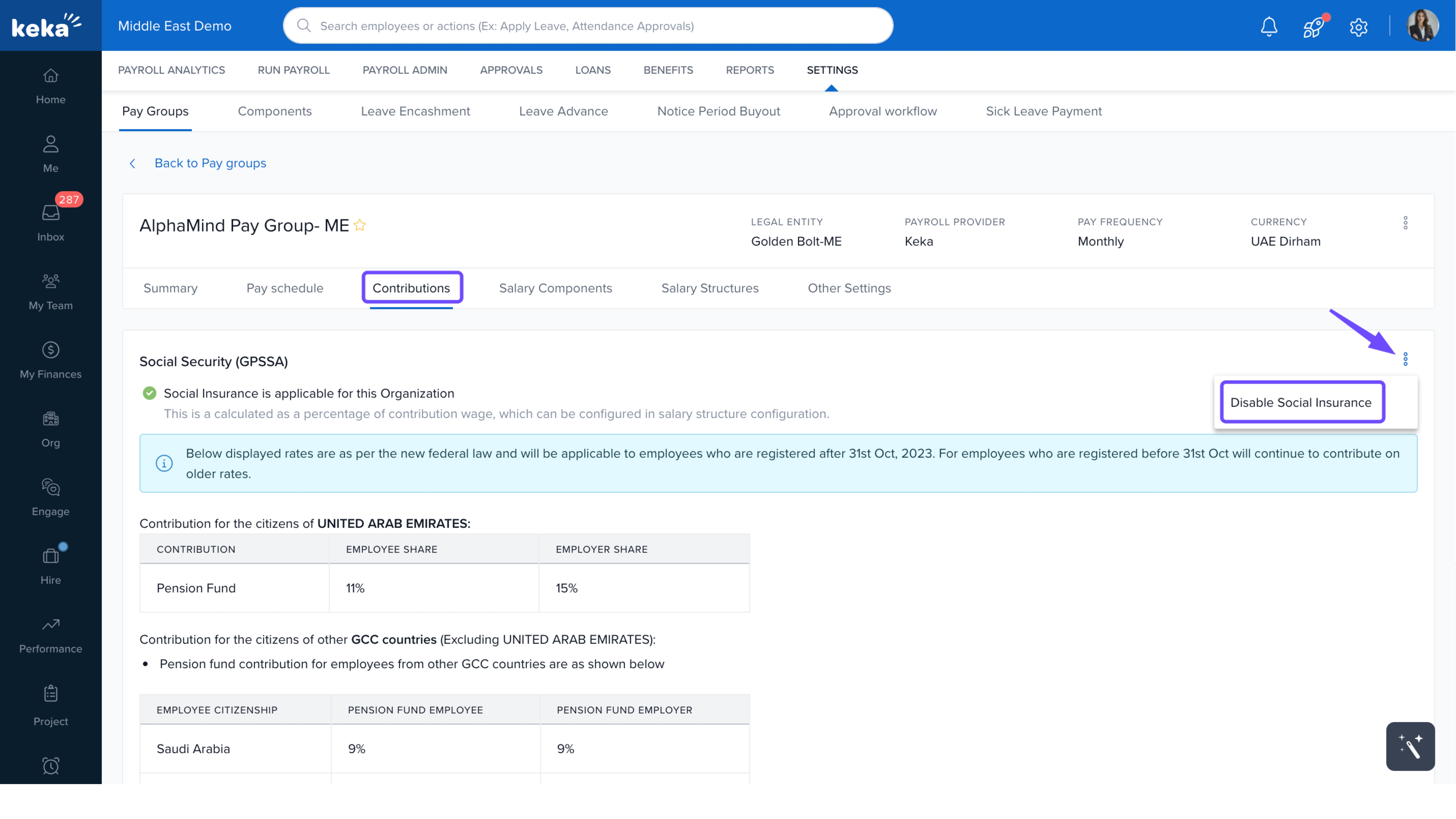 Important: Social insurance setup is country-specific and applies only to local nationals. Make sure your legal entity and employee nationality settings are accurate in Keka to ensure proper contribution calculation.