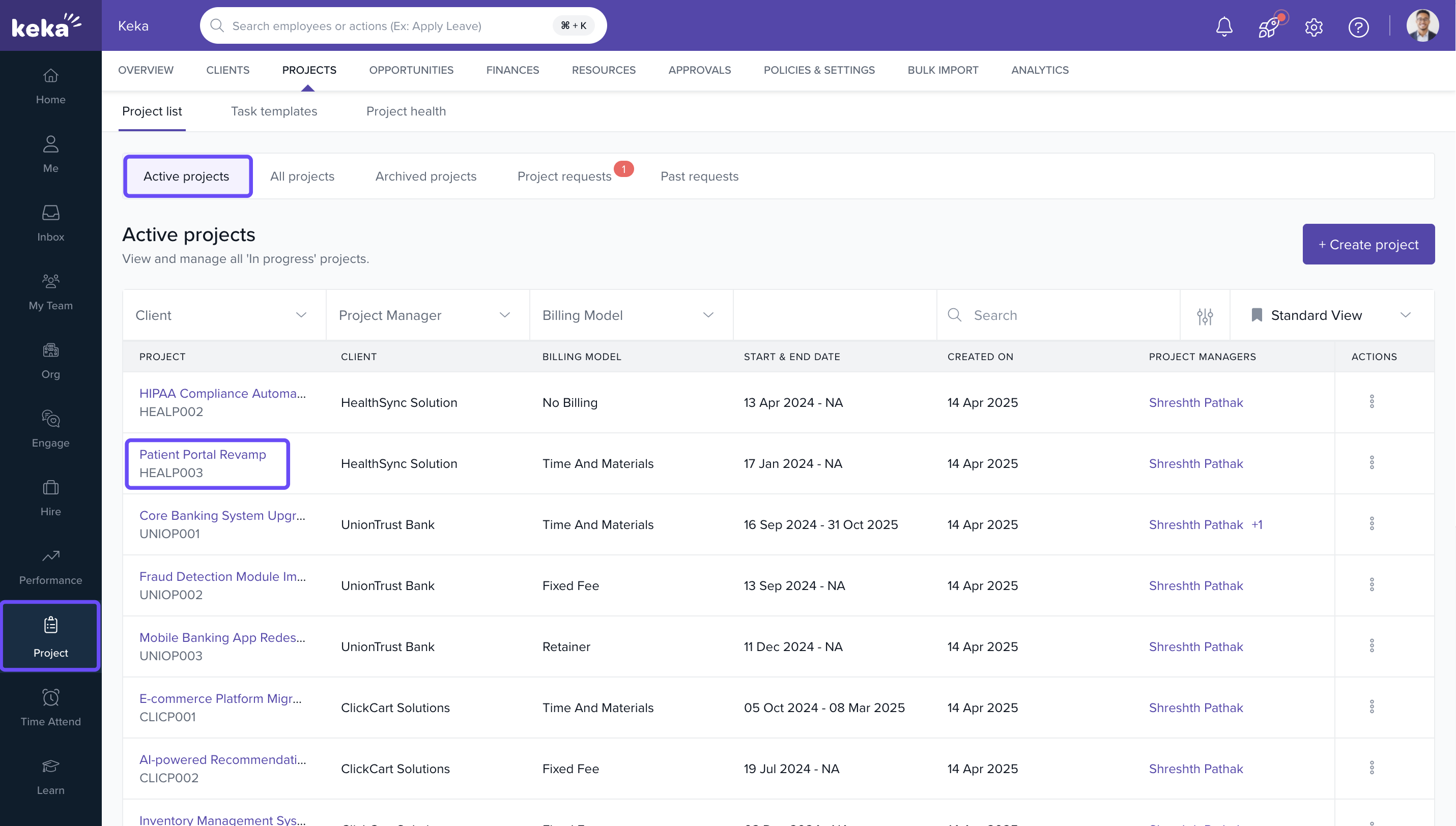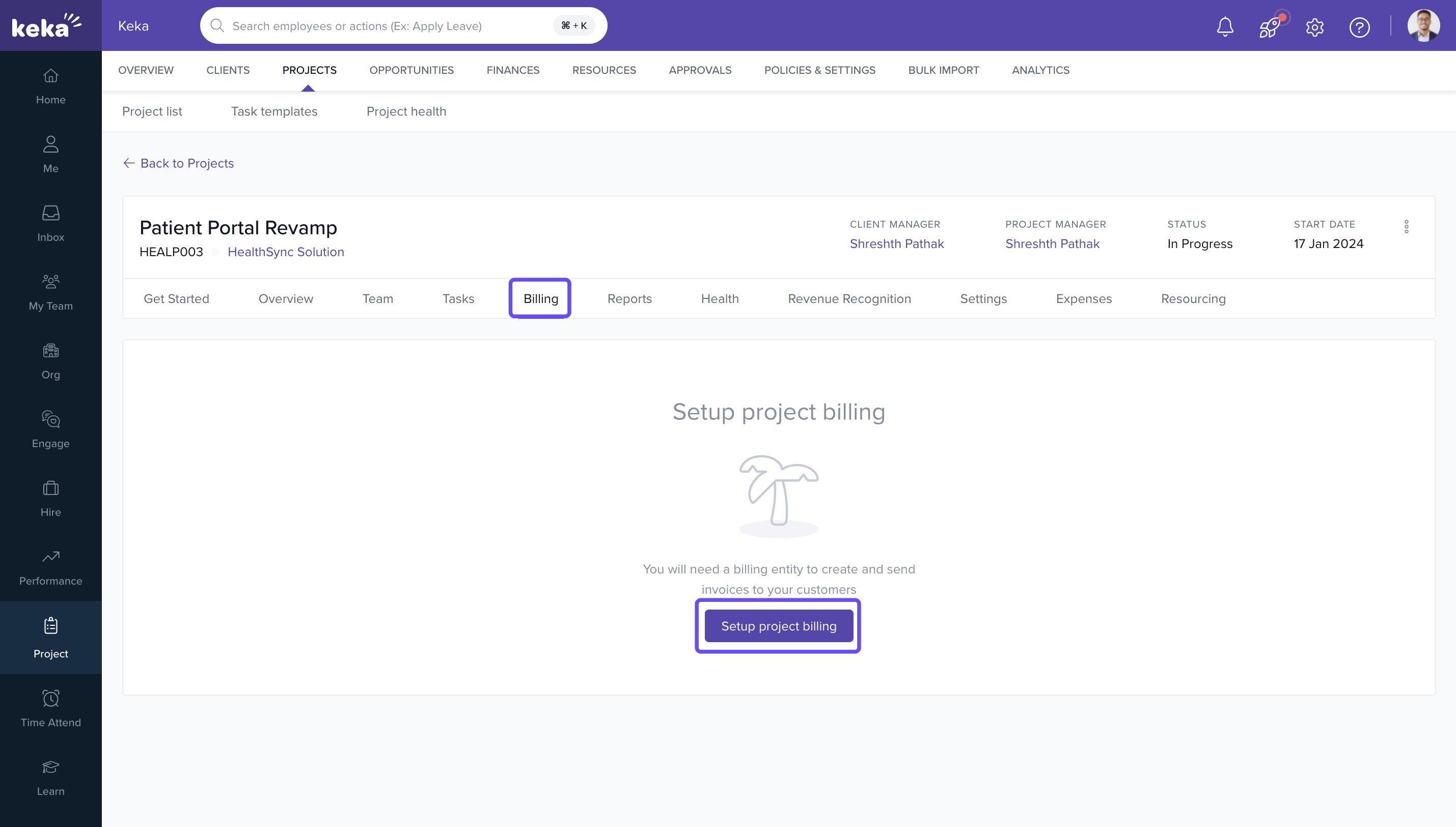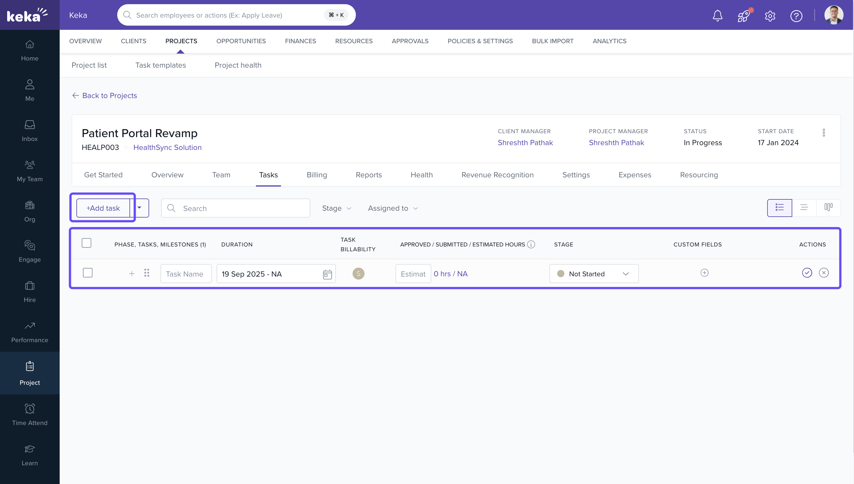 Properly configuring a project in Keka PSA ensures you can fully utilize its features—ranging from billing and resource allocation to task management and timesheet tracking. Once a project is created, users can set up billing types, define the project team, and add tasks. This article provides a step-by-step guide to configuring a new project, including billing setup, resource assignment, and task creation.