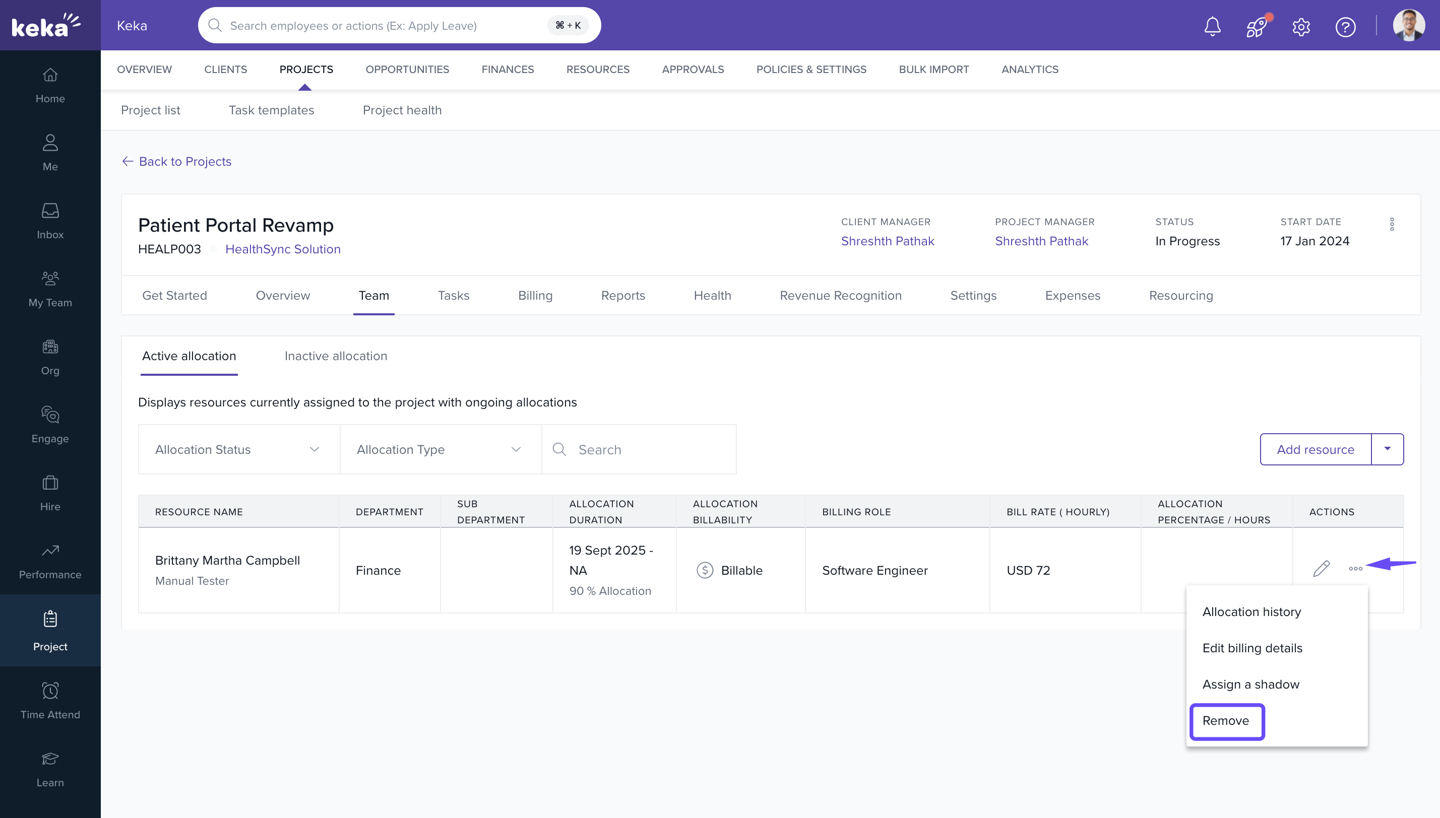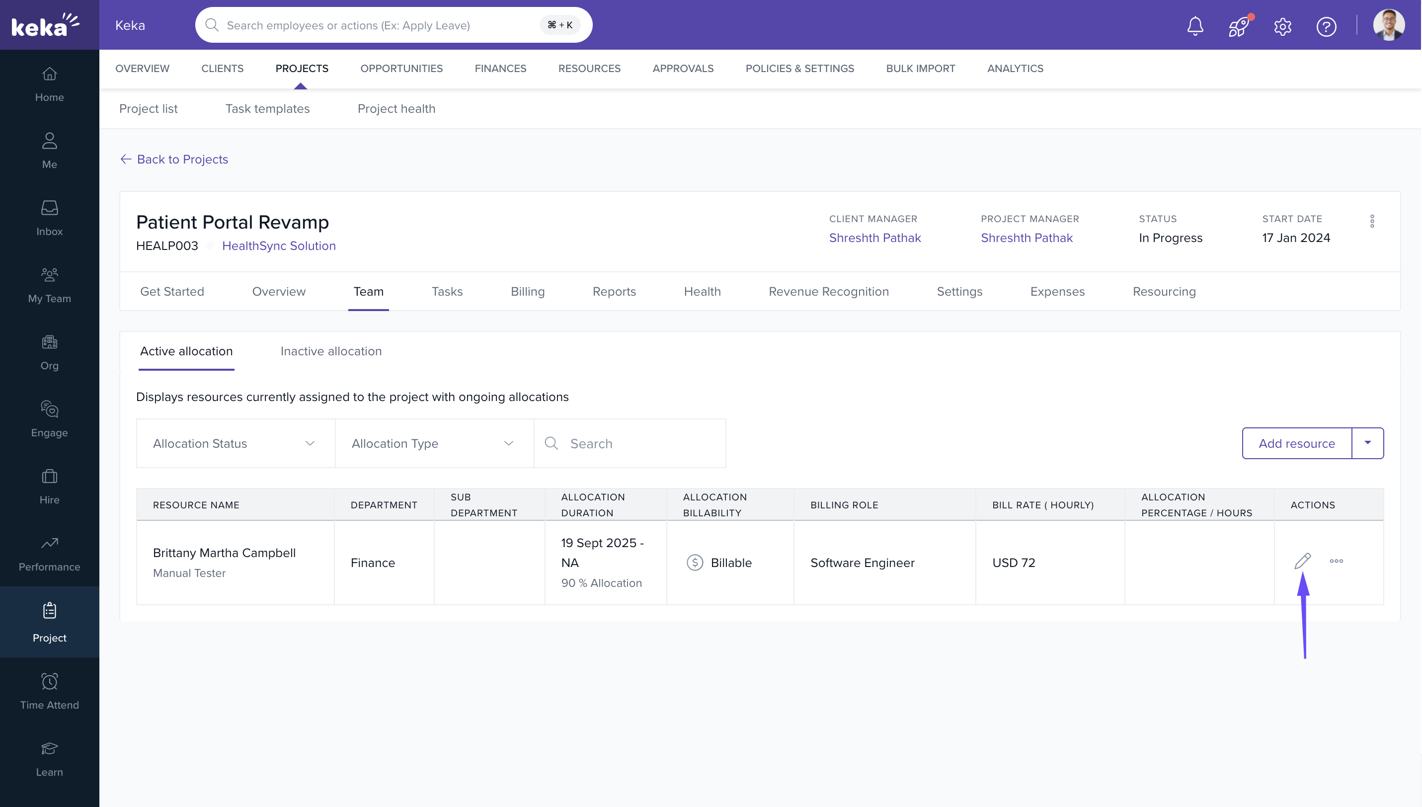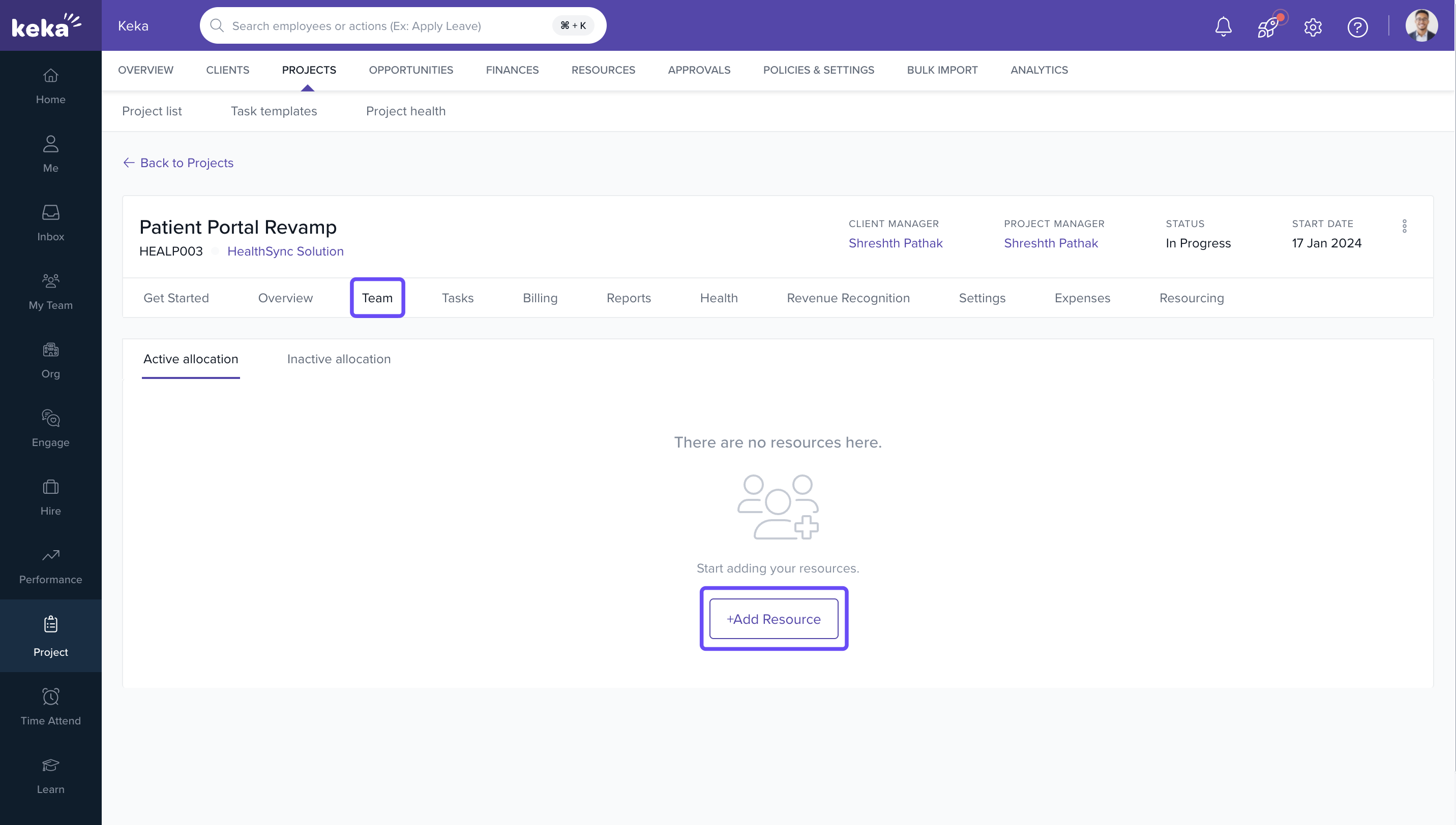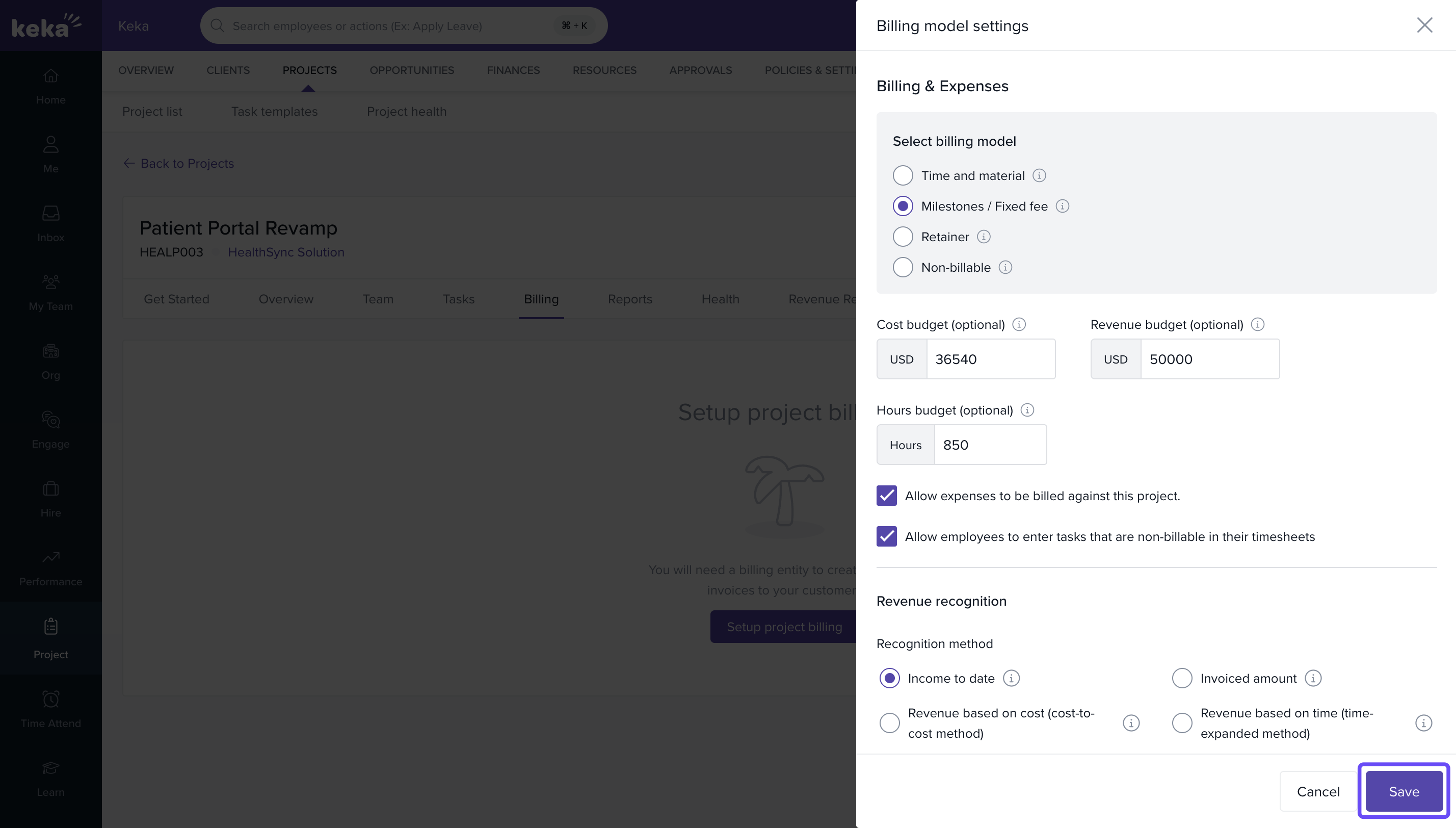 Properly configuring a project in Keka PSA ensures you can fully utilize its features—ranging from billing and resource allocation to task management and timesheet tracking. Once a project is created, users can set up billing types, define the project team, and add tasks. This article provides a step-by-step guide to configuring a new project, including billing setup, resource assignment, and task creation.