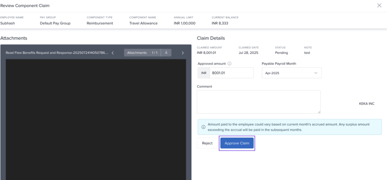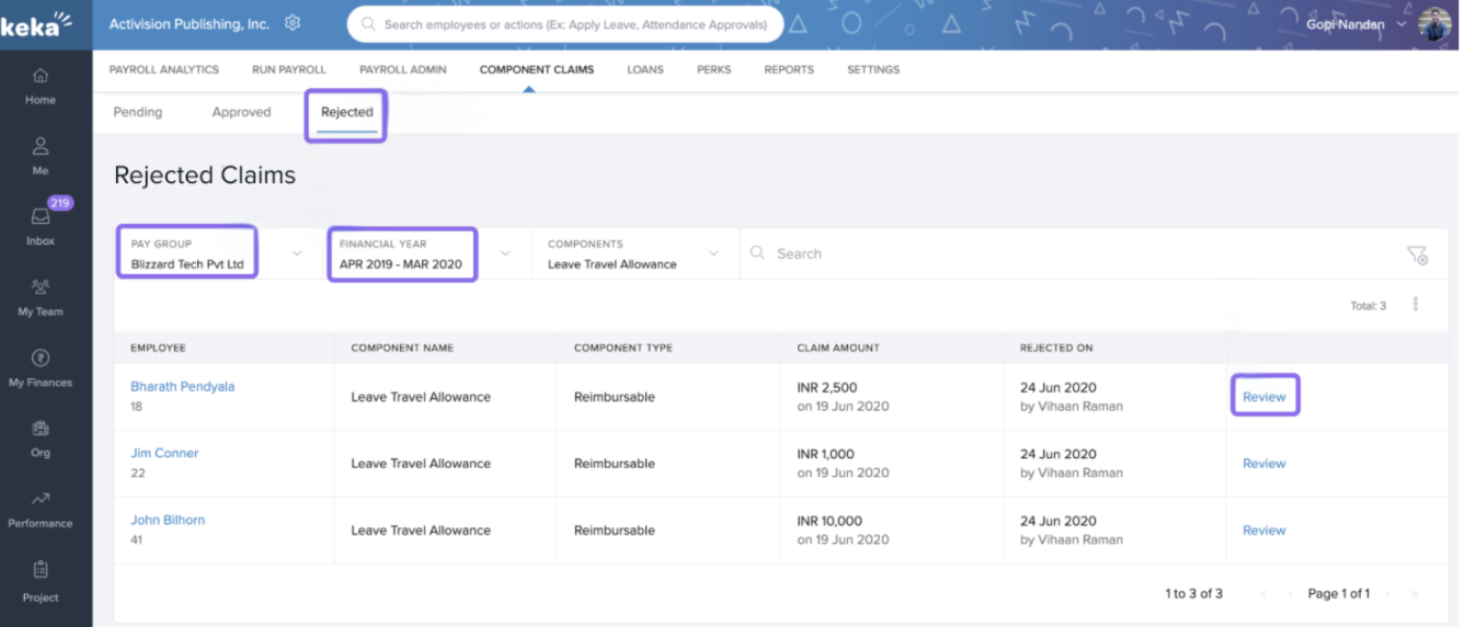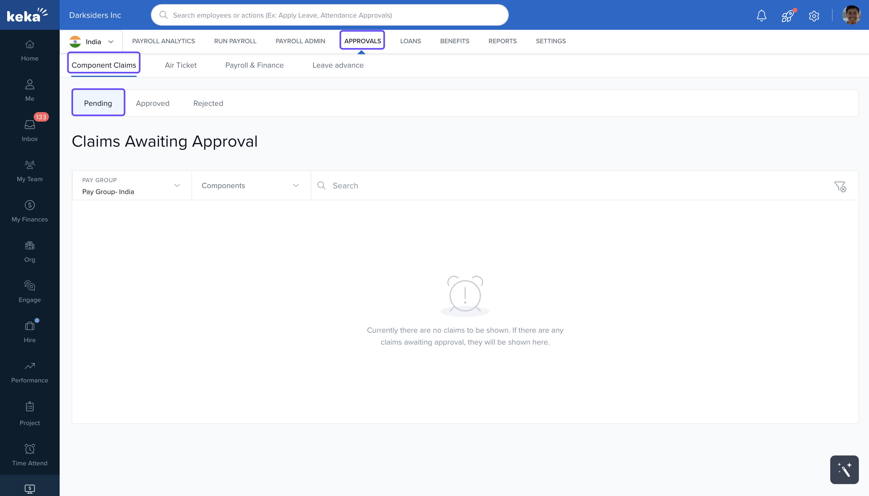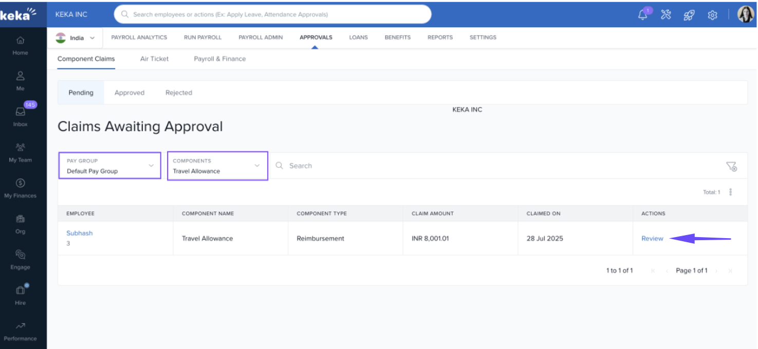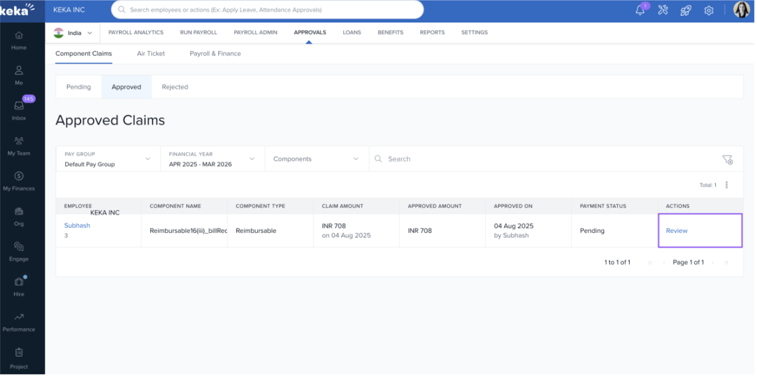 Employees can make component claims from their My Finances tab in such cases. These component claims can have specific approval chains and as a Payroll Admin or a Global Admin, you can approve these claims. Let's learn how you approve or reject component claims that are made by employees in your organization.
