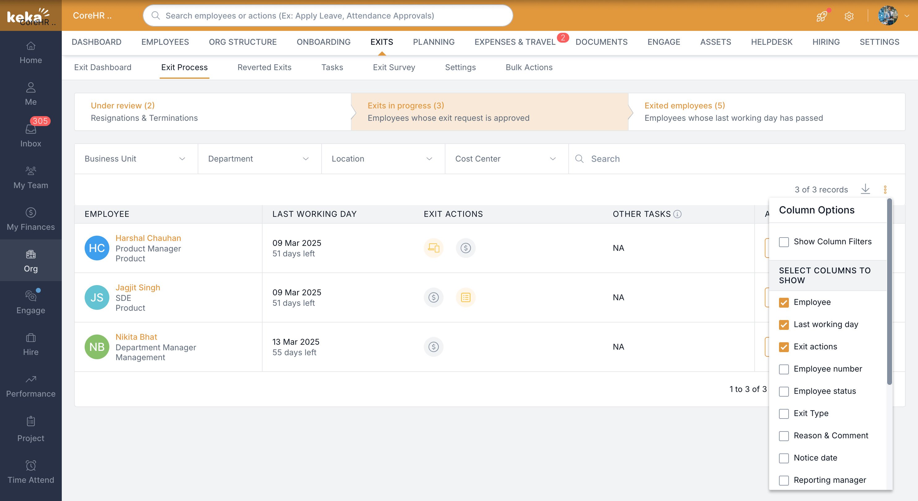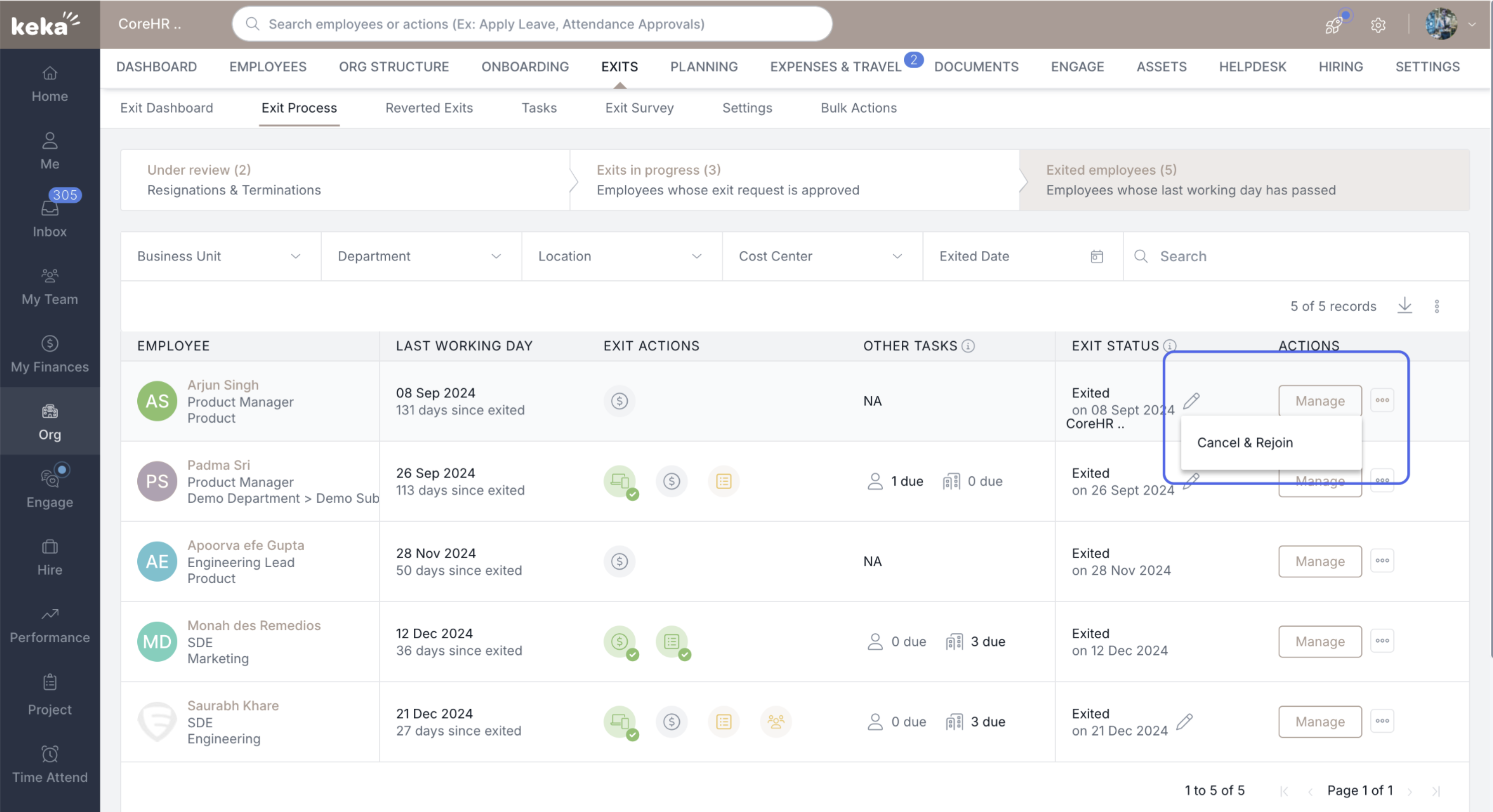 If necessary, you can cancel the exit request and reinstate the employee by using the three-dot options next to their name.
